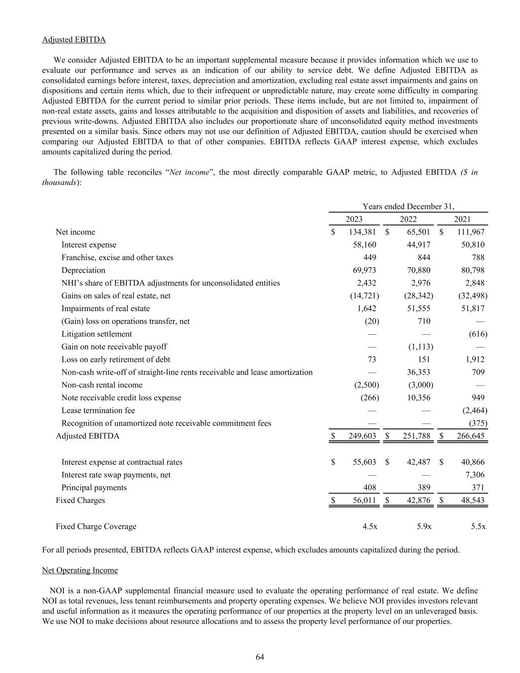 Adjusted EBITDA We consider Adjusted EBITDA to be an important supplemental measure because it provides information which we use to evaluate our performance and serves as an indication of our ability to service debt. We define Adjusted EBITDA as consolidated earnings before interest, taxes, depreciation and amortization, excluding real estate asset impairments and gains on dispositions and certain items which, due to their infrequent or unpredictable nature, may create some difficulty in comparing Adjusted EBITDA for the current period to similar prior periods. These items include, but are not limited to, impairment of non-real estate assets, gains and losses attributable to the acquisition and disposition of assets and liabilities, and recoveries of previous write-downs. Adjusted EBITDA also includes our proportionate share of unconsolidated equity method investments presented on a similar basis. Since others may not use our definition of Adjusted EBITDA, caution should be exercised when comparing our Adjusted EBITDA to that of other companies. EBITDA reflects GAAP interest expense, which excludes amounts capitalized during the period. The following table reconciles “Net income”, the most directly comparable GAAP metric, to Adjusted EBITDA ($ in thousands): Years ended December 31, 2023 2022 2021 Net income $ 134,381 $ 65,501 $ 111,967 Interest expense 58,160 44,917 50,810 Franchise, excise and other taxes 449 844 788 Depreciation 69,973 70,880 80,798 NHI’s share of EBITDA adjustments for unconsolidated entities 2,432 2,976 2,848 Gains on sales of real estate, net (14,721) (28,342) (32,498) Impairments of real estate 1,642 51,555 51,817 (Gain) loss on operations transfer, net (20) 710 — Litigation settlement — — (616) Gain on note receivable payoff — (1,113) — Loss on early retirement of debt 73 151 1,912 Non-cash write-off of straight-line rents receivable and lease amortization — 36,353 709 Non-cash rental income (2,500) (3,000) — Note receivable credit loss expense (266) 10,356 949 Lease termination fee — — (2,464) Recognition of unamortized note receivable commitment fees — — (375) Adjusted EBITDA $ 249,603 $ 251,788 $ 266,645 Interest expense at contractual rates $ 55,603 $ 42,487 $ 40,866 Interest rate swap payments, net — — 7,306 Principal payments 408 389 371 Fixed Charges $ 56,011 $ 42,876 $ 48,543 Fixed Charge Coverage 4.5x 5.9x 5.5x For all periods presented, EBITDA reflects GAAP interest expense, which excludes amounts capitalized during the period. Net Operating Income NOI is a non-GAAP supplemental financial measure used to evaluate the operating performance of real estate. We define NOI as total revenues, less tenant reimbursements and property operating expenses. We believe NOI provides investors relevant and useful information as it measures the operating performance of our properties at the property level on an unleveraged basis. We use NOI to make decisions about resource allocations and to assess the property level performance of our properties. 64