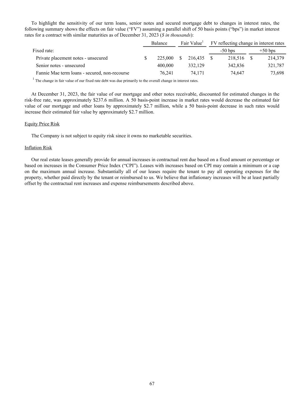 To highlight the sensitivity of our term loans, senior notes and secured mortgage debt to changes in interest rates, the following summary shows the effects on fair value (“FV”) assuming a parallel shift of 50 basis points (“bps”) in market interest rates for a contract with similar maturities as of December 31, 2023 ($ in thousands): Balance Fair Value1 FV reflecting change in interest rates Fixed rate: -50 bps +50 bps Private placement notes - unsecured $ 225,000 $ 216,435 $ 218,516 $ 214,379 Senior notes - unsecured 400,000 332,129 342,836 321,787 Fannie Mae term loans - secured, non-recourse 76,241 74,171 74,647 73,698 1 The change in fair value of our fixed rate debt was due primarily to the overall change in interest rates. At December 31, 2023, the fair value of our mortgage and other notes receivable, discounted for estimated changes in the risk-free rate, was approximately $237.6 million. A 50 basis-point increase in market rates would decrease the estimated fair value of our mortgage and other loans by approximately $2.7 million, while a 50 basis-point decrease in such rates would increase their estimated fair value by approximately $2.7 million. Equity Price Risk The Company is not subject to equity risk since it owns no marketable securities. Inflation Risk Our real estate leases generally provide for annual increases in contractual rent due based on a fixed amount or percentage or based on increases in the Consumer Price Index (“CPI”). Leases with increases based on CPI may contain a minimum or a cap on the maximum annual increase. Substantially all of our leases require the tenant to pay all operating expenses for the property, whether paid directly by the tenant or reimbursed to us. We believe that inflationary increases will be at least partially offset by the contractual rent increases and expense reimbursements described above. 67
