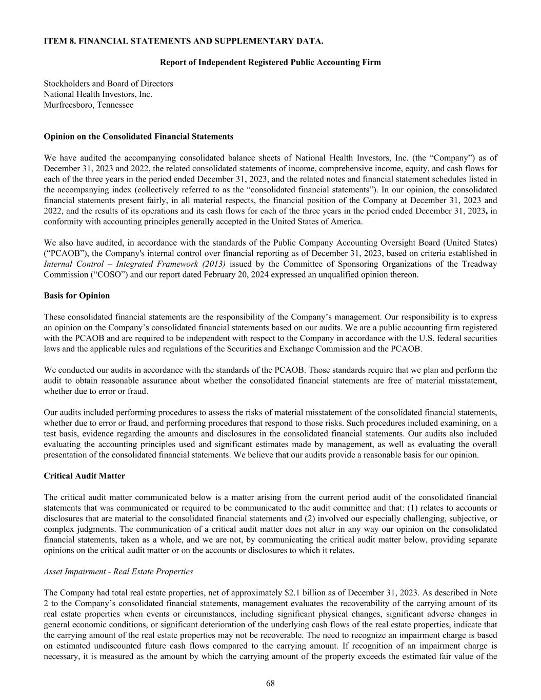 ITEM 8. FINANCIAL STATEMENTS AND SUPPLEMENTARY DATA. Report of Independent Registered Public Accounting Firm Stockholders and Board of Directors National Health Investors, Inc. Murfreesboro, Tennessee Opinion on the Consolidated Financial Statements We have audited the accompanying consolidated balance sheets of National Health Investors, Inc. (the “Company”) as of December 31, 2023 and 2022, the related consolidated statements of income, comprehensive income, equity, and cash flows for each of the three years in the period ended December 31, 2023, and the related notes and financial statement schedules listed in the accompanying index (collectively referred to as the “consolidated financial statements”). In our opinion, the consolidated financial statements present fairly, in all material respects, the financial position of the Company at December 31, 2023 and 2022, and the results of its operations and its cash flows for each of the three years in the period ended December 31, 2023, in conformity with accounting principles generally accepted in the United States of America. We also have audited, in accordance with the standards of the Public Company Accounting Oversight Board (United States) (“PCAOB”), the Company's internal control over financial reporting as of December 31, 2023, based on criteria established in Internal Control – Integrated Framework (2013) issued by the Committee of Sponsoring Organizations of the Treadway Commission (“COSO”) and our report dated February 20, 2024 expressed an unqualified opinion thereon. Basis for Opinion These consolidated financial statements are the responsibility of the Company’s management. Our responsibility is to express an opinion on the Company’s consolidated financial statements based on our audits. We are a public accounting firm registered with the PCAOB and are required to be independent with respect to the Company in accordance with the U.S. federal securities laws and the applicable rules and regulations of the Securities and Exchange Commission and the PCAOB. We conducted our audits in accordance with the standards of the PCAOB. Those standards require that we plan and perform the audit to obtain reasonable assurance about whether the consolidated financial statements are free of material misstatement, whether due to error or fraud. Our audits included performing procedures to assess the risks of material misstatement of the consolidated financial statements, whether due to error or fraud, and performing procedures that respond to those risks. Such procedures included examining, on a test basis, evidence regarding the amounts and disclosures in the consolidated financial statements. Our audits also included evaluating the accounting principles used and significant estimates made by management, as well as evaluating the overall presentation of the consolidated financial statements. We believe that our audits provide a reasonable basis for our opinion. Critical Audit Matter The critical audit matter communicated below is a matter arising from the current period audit of the consolidated financial statements that was communicated or required to be communicated to the audit committee and that: (1) relates to accounts or disclosures that are material to the consolidated financial statements and (2) involved our especially challenging, subjective, or complex judgments. The communication of a critical audit matter does not alter in any way our opinion on the consolidated financial statements, taken as a whole, and we are not, by communicating the critical audit matter below, providing separate opinions on the critical audit matter or on the accounts or disclosures to which it relates. Asset Impairment - Real Estate Properties The Company had total real estate properties, net of approximately $2.1 billion as of December 31, 2023. As described in Note 2 to the Company’s consolidated financial statements, management evaluates the recoverability of the carrying amount of its real estate properties when events or circumstances, including significant physical changes, significant adverse changes in general economic conditions, or significant deterioration of the underlying cash flows of the real estate properties, indicate that the carrying amount of the real estate properties may not be recoverable. The need to recognize an impairment charge is based on estimated undiscounted future cash flows compared to the carrying amount. If recognition of an impairment charge is necessary, it is measured as the amount by which the carrying amount of the property exceeds the estimated fair value of the 68