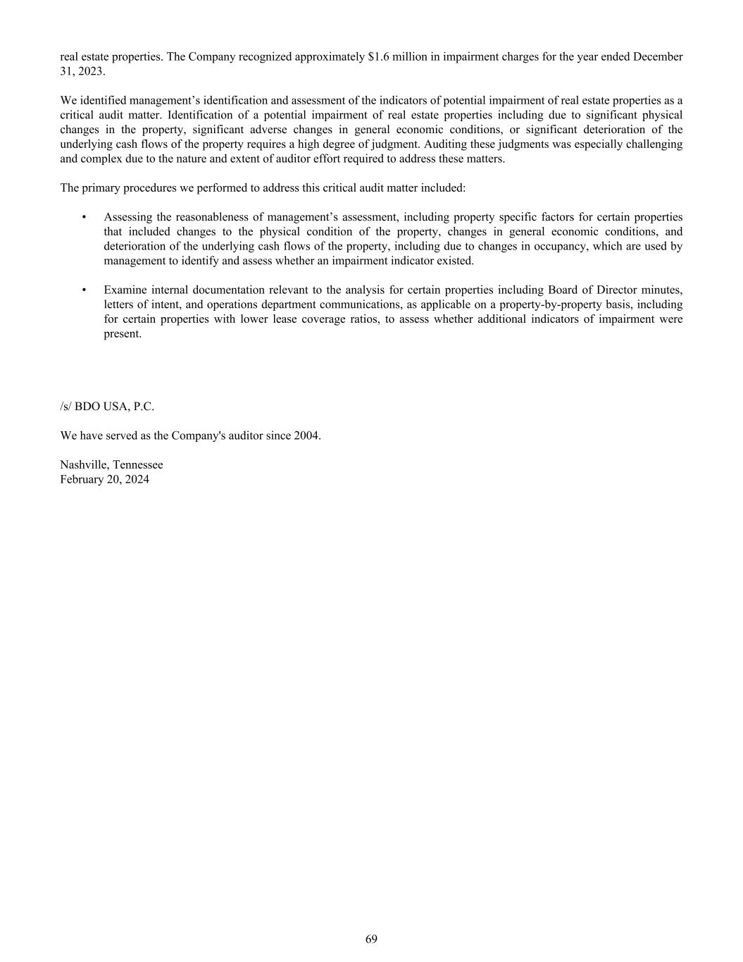 real estate properties. The Company recognized approximately $1.6 million in impairment charges for the year ended December 31, 2023. We identified management’s identification and assessment of the indicators of potential impairment of real estate properties as a critical audit matter. Identification of a potential impairment of real estate properties including due to significant physical changes in the property, significant adverse changes in general economic conditions, or significant deterioration of the underlying cash flows of the property requires a high degree of judgment. Auditing these judgments was especially challenging and complex due to the nature and extent of auditor effort required to address these matters. The primary procedures we performed to address this critical audit matter included: • Assessing the reasonableness of management’s assessment, including property specific factors for certain properties that included changes to the physical condition of the property, changes in general economic conditions, and deterioration of the underlying cash flows of the property, including due to changes in occupancy, which are used by management to identify and assess whether an impairment indicator existed. • Examine internal documentation relevant to the analysis for certain properties including Board of Director minutes, letters of intent, and operations department communications, as applicable on a property-by-property basis, including for certain properties with lower lease coverage ratios, to assess whether additional indicators of impairment were present. /s/ BDO USA, P.C. We have served as the Company's auditor since 2004. Nashville, Tennessee February 20, 2024 69