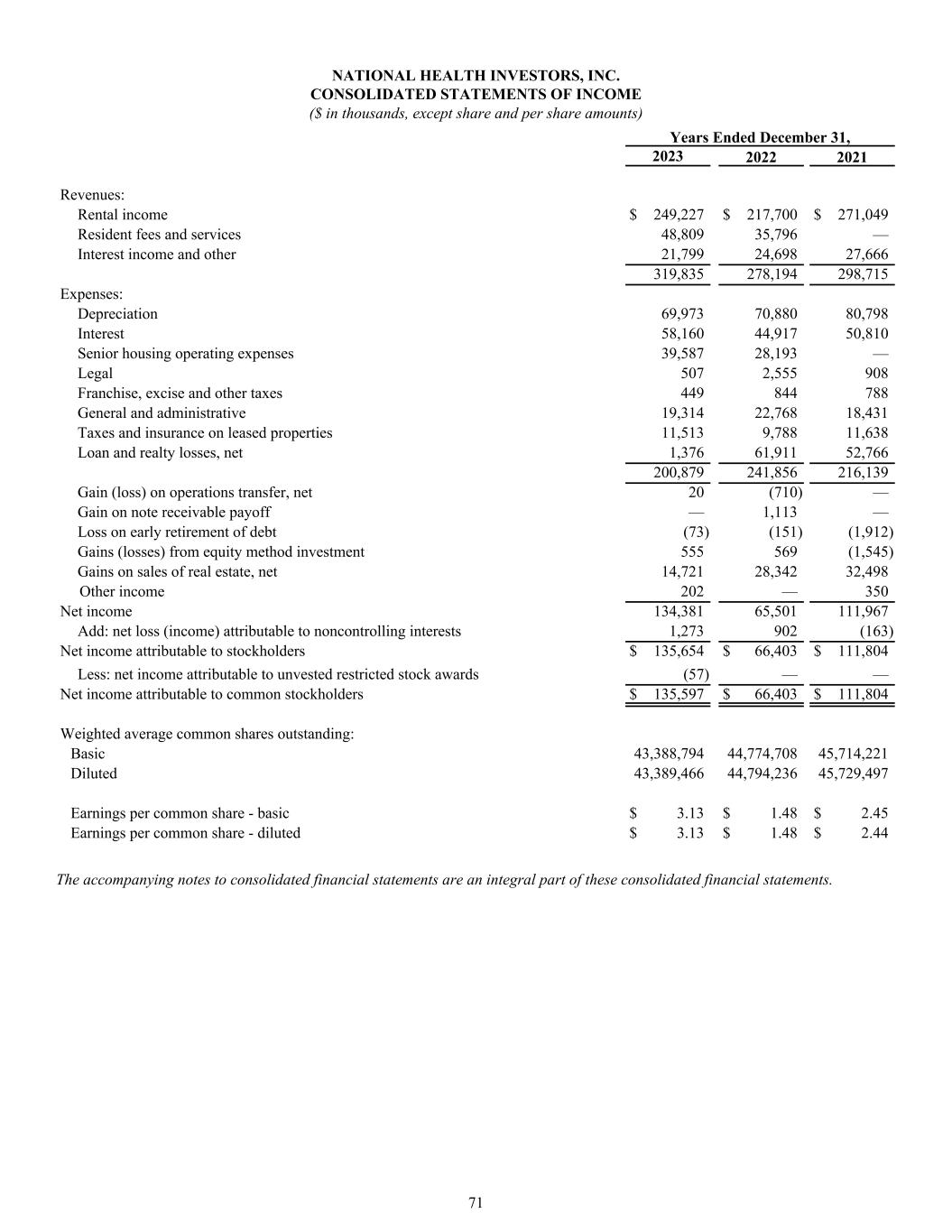 NATIONAL HEALTH INVESTORS, INC. CONSOLIDATED STATEMENTS OF INCOME ($ in thousands, except share and per share amounts) Years Ended December 31, 2023 2022 2021 Revenues: Rental income $ 249,227 $ 217,700 $ 271,049 Resident fees and services 48,809 35,796 — Interest income and other 21,799 24,698 27,666 319,835 278,194 298,715 Expenses: Depreciation 69,973 70,880 80,798 Interest 58,160 44,917 50,810 Senior housing operating expenses 39,587 28,193 — Legal 507 2,555 908 Franchise, excise and other taxes 449 844 788 General and administrative 19,314 22,768 18,431 Taxes and insurance on leased properties 11,513 9,788 11,638 Loan and realty losses, net 1,376 61,911 52,766 200,879 241,856 216,139 Gain (loss) on operations transfer, net 20 (710) — Gain on note receivable payoff — 1,113 — Loss on early retirement of debt (73) (151) (1,912) Gains (losses) from equity method investment 555 569 (1,545) Gains on sales of real estate, net 14,721 28,342 32,498 Other income 202 — 350 Net income 134,381 65,501 111,967 Add: net loss (income) attributable to noncontrolling interests 1,273 902 (163) Net income attributable to stockholders $ 135,654 $ 66,403 $ 111,804 Less: net income attributable to unvested restricted stock awards (57) — — Net income attributable to common stockholders $ 135,597 $ 66,403 $ 111,804 Weighted average common shares outstanding: Basic 43,388,794 44,774,708 45,714,221 Diluted 43,389,466 44,794,236 45,729,497 Earnings per common share - basic $ 3.13 $ 1.48 $ 2.45 Earnings per common share - diluted $ 3.13 $ 1.48 $ 2.44 The accompanying notes to consolidated financial statements are an integral part of these consolidated financial statements. 71