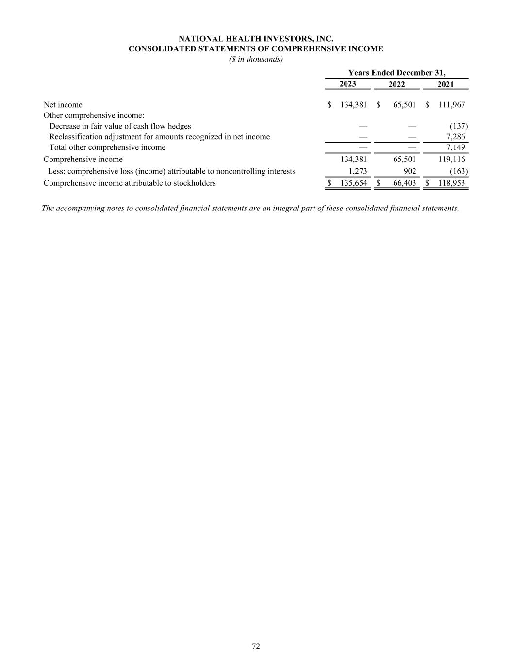 NATIONAL HEALTH INVESTORS, INC. CONSOLIDATED STATEMENTS OF COMPREHENSIVE INCOME ($ in thousands) Years Ended December 31, 2023 2022 2021 Net income $ 134,381 $ 65,501 $ 111,967 Other comprehensive income: Decrease in fair value of cash flow hedges — — (137) Reclassification adjustment for amounts recognized in net income — — 7,286 Total other comprehensive income — — 7,149 Comprehensive income 134,381 65,501 119,116 Less: comprehensive loss (income) attributable to noncontrolling interests 1,273 902 (163) Comprehensive income attributable to stockholders $ 135,654 $ 66,403 $ 118,953 The accompanying notes to consolidated financial statements are an integral part of these consolidated financial statements. 72