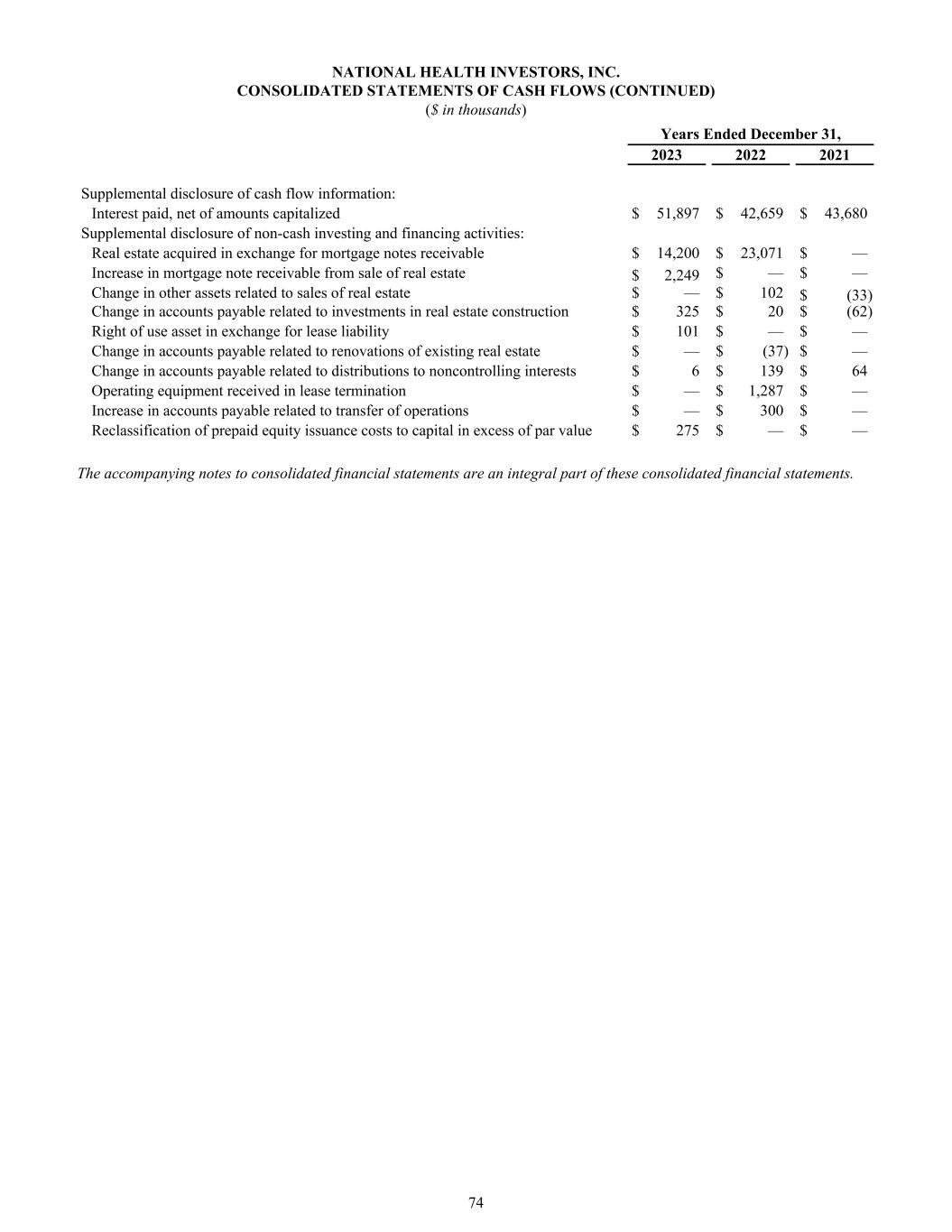 NATIONAL HEALTH INVESTORS, INC. CONSOLIDATED STATEMENTS OF CASH FLOWS (CONTINUED) ($ in thousands) Years Ended December 31, 2023 2022 2021 Supplemental disclosure of cash flow information: Interest paid, net of amounts capitalized $ 51,897 $ 42,659 $ 43,680 Supplemental disclosure of non-cash investing and financing activities: Real estate acquired in exchange for mortgage notes receivable $ 14,200 $ 23,071 $ — Increase in mortgage note receivable from sale of real estate $ 2,249 $ — $ — Change in other assets related to sales of real estate $ — $ 102 $ (33) Change in accounts payable related to investments in real estate construction $ 325 $ 20 $ (62) Right of use asset in exchange for lease liability $ 101 $ — $ — Change in accounts payable related to renovations of existing real estate $ — $ (37) $ — Change in accounts payable related to distributions to noncontrolling interests $ 6 $ 139 $ 64 Operating equipment received in lease termination $ — $ 1,287 $ — Increase in accounts payable related to transfer of operations $ — $ 300 $ — Reclassification of prepaid equity issuance costs to capital in excess of par value $ 275 $ — $ — The accompanying notes to consolidated financial statements are an integral part of these consolidated financial statements. 74
