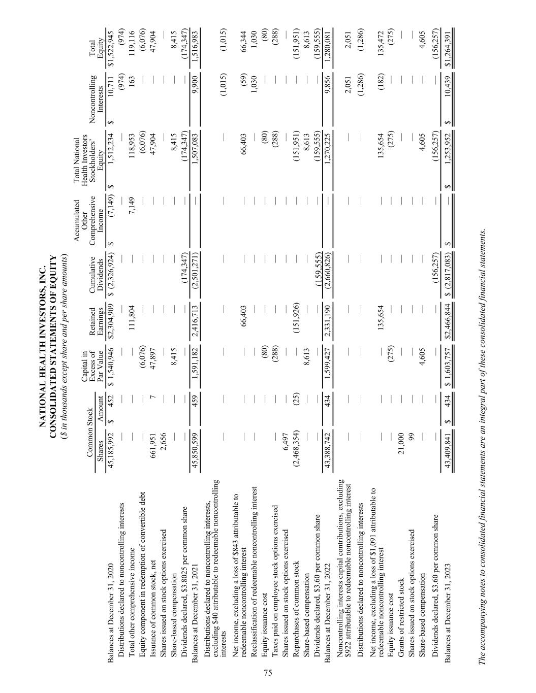 N A T IO N A L H E A L T H IN V E ST O R S, IN C . C O N SO L ID A T E D S T A T E M E N T S O F E Q U IT Y ($ in th ou sa nd s e xc ep t s ha re a nd p er sh ar e am ou nt s) C om m on S to ck C ap ita l i n Ex ce ss o f Pa r V al ue R et ai ne d Ea rn in gs C um ul at iv e D iv id en ds A cc um ul at ed O th er C om pr eh en si ve In co m e To ta l N at io na l H ea lth In ve st or s St oc kh ol de rs ’ Eq ui ty N on co nt ro lli ng In te re st s To ta l Eq ui ty Sh ar es A m ou nt B al an ce s a t D ec em be r 3 1, 2 02 0 4 5, 18 5, 99 2 $ 45 2 $ 1, 54 0, 94 6 $ 2 ,3 04 ,9 09 $ (2 ,3 26 ,9 24 ) $ (7 ,1 49 ) $ 1, 51 2, 23 4 $ 10 ,7 11 $ 1 ,5 22 ,9 45 D is tri bu tio ns d ec la re d to n on co nt ro lli ng in te re st s — — — — — — — (9 74 ) (9 74 ) To ta l o th er c om pr eh en si ve in co m e — — — 11 1, 80 4 — 7, 14 9 11 8, 95 3 16 3 11 9, 11 6 Eq ui ty c om po ne nt in re de m pt io n of c on ve rti bl e de bt — — (6 ,0 76 ) — — — (6 ,0 76 ) — (6 ,0 76 ) Is su an ce o f c om m on st oc k, n et 66 1, 95 1 7 47 ,8 97 — — — 47 ,9 04 — 47 ,9 04 Sh ar es is su ed o n st oc k op tio ns e xe rc is ed 2, 65 6 — — — — — — — — Sh ar e- ba se d co m pe ns at io n — — 8, 41 5 — — — 8, 41 5 — 8, 41 5 D iv id en ds d ec la re d, $ 3. 80 25 p er c om m on sh ar e — — — — (1 74 ,3 47 ) — (1 74 ,3 47 ) — (1 74 ,3 47 ) B al an ce s a t D ec em be r 3 1, 2 02 1 4 5, 85 0, 59 9 45 9 1, 59 1, 18 2 2 ,4 16 ,7 13 (2 ,5 01 ,2 71 ) — 1, 50 7, 08 3 9, 90 0 1, 51 6, 98 3 D is tri bu tio ns d ec la re d to n on co nt ro lli ng in te re st s, ex cl ud in g $4 0 at tri bu ta bl e to re de em ab le n on co nt ro lli ng in te re st s — — — — — — — (1 ,0 15 ) (1 ,0 15 ) N et in co m e, e xc lu di ng a lo ss o f $ 84 3 at tri bu ta bl e to re de em ab le n on co nt ro lli ng in te re st — — — 66 ,4 03 — — 66 ,4 03 (5 9) 66 ,3 44 R ec la ss ifi ca tio n of re de em ab le n on co nt ro lli ng in te re st — — — — — — — 1, 03 0 1, 03 0 Eq ui ty is su an ce c os t — (8 0) — — — (8 0) — (8 0) Ta xe s p ai d on e m pl oy ee st oc k op tio ns e xe rc is ed — — (2 88 ) — — — (2 88 ) — (2 88 ) Sh ar es is su ed o n st oc k op tio ns e xe rc is ed 6, 49 7 — — — — — — — — R ep ur ch as es o f c om m on st oc k (2 ,4 68 ,3 54 ) (2 5) — (1 51 ,9 26 ) — — (1 51 ,9 51 ) — (1 51 ,9 51 ) Sh ar e- ba se d co m pe ns at io n — — 8, 61 3 — — — 8, 61 3 — 8, 61 3 D iv id en ds d ec la re d, $ 3. 60 p er c om m on sh ar e — — — — (1 59 ,5 55 ) — (1 59 ,5 55 ) — (1 59 ,5 55 ) B al an ce s a t D ec em be r 3 1, 2 02 2 4 3, 38 8, 74 2 43 4 1, 59 9, 42 7 2 ,3 31 ,1 90 (2 ,6 60 ,8 26 ) — 1, 27 0, 22 5 9, 85 6 1, 28 0, 08 1 N on co nt ro lli ng in te re st s c ap ita l c on tri bu tio ns , e xc lu di ng $9 22 a ttr ib ut ab le to re de em ab le n on co nt ro lli ng in te re st — — — — — — — 2, 05 1 2, 05 1 D is tri bu tio ns d ec la re d to n on co nt ro lli ng in te re st s — — — — — — — (1 ,2 86 ) (1 ,2 86 ) N et in co m e, e xc lu di ng a lo ss o f $ 1, 09 1 at tri bu ta bl e to re de em ab le n on co nt ro lli ng in te re st — — — 13 5, 65 4 — — 13 5, 65 4 (1 82 ) 13 5, 47 2 Eq ui ty is su an ce c os t — — (2 75 ) — — — (2 75 ) — (2 75 ) G ra nt s o f r es tri ct ed st oc k 21 ,0 00 — — — — — — — — Sh ar es is su ed o n st oc k op tio ns e xe rc is ed 99 — — — — — — — — Sh ar e- ba se d co m pe ns at io n — — 4, 60 5 — — — 4, 60 5 — 4, 60 5 D iv id en ds d ec la re d, $ 3. 60 p er c om m on sh ar e — — — — (1 56 ,2 57 ) — (1 56 ,2 57 ) — (1 56 ,2 57 ) B al an ce s a t D ec em be r 3 1, 2 02 3 4 3, 40 9, 84 1 $ 43 4 $ 1, 60 3, 75 7 $ 2 ,4 66 ,8 44 $ (2 ,8 17 ,0 83 ) $ — $ 1, 25 3, 95 2 $ 10 ,4 39 $ 1 ,2 64 ,3 91 Th e ac co m pa ny in g no te s t o co ns ol id at ed fi na nc ia l s ta te m en ts a re a n in te gr al p ar t o f t he se c on so lid at ed fi na nc ia l s ta te m en ts . 75