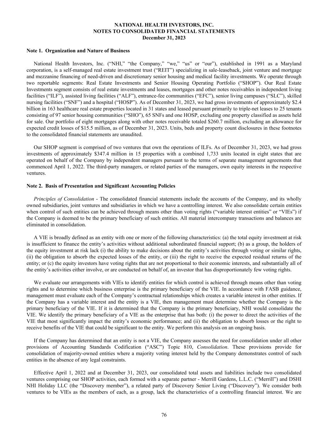 NATIONAL HEALTH INVESTORS, INC. NOTES TO CONSOLIDATED FINANCIAL STATEMENTS December 31, 2023 Note 1. Organization and Nature of Business National Health Investors, Inc. (“NHI,” “the Company,” “we,” “us” or “our”), established in 1991 as a Maryland corporation, is a self-managed real estate investment trust (“REIT”) specializing in sale-leaseback, joint venture and mortgage and mezzanine financing of need-driven and discretionary senior housing and medical facility investments. We operate through two reportable segments: Real Estate Investments and Senior Housing Operating Portfolio (“SHOP”). Our Real Estate Investments segment consists of real estate investments and leases, mortgages and other notes receivables in independent living facilities (“ILF”), assisted living facilities (“ALF”), entrance-fee communities (“EFC”), senior living campuses (“SLC”), skilled nursing facilities (“SNF”) and a hospital (“HOSP”). As of December 31, 2023, we had gross investments of approximately $2.4 billion in 163 healthcare real estate properties located in 31 states and leased pursuant primarily to triple-net leases to 25 tenants consisting of 97 senior housing communities (“SHO”), 65 SNFs and one HOSP, excluding one property classified as assets held for sale. Our portfolio of eight mortgages along with other notes receivable totaled $260.7 million, excluding an allowance for expected credit losses of $15.5 million, as of December 31, 2023. Units, beds and property count disclosures in these footnotes to the consolidated financial statements are unaudited. Our SHOP segment is comprised of two ventures that own the operations of ILFs. As of December 31, 2023, we had gross investments of approximately $347.4 million in 15 properties with a combined 1,733 units located in eight states that are operated on behalf of the Company by independent managers pursuant to the terms of separate management agreements that commenced April 1, 2022. The third-party managers, or related parties of the managers, own equity interests in the respective ventures. Note 2. Basis of Presentation and Significant Accounting Policies Principles of Consolidation - The consolidated financial statements include the accounts of the Company, and its wholly owned subsidiaries, joint ventures and subsidiaries in which we have a controlling interest. We also consolidate certain entities when control of such entities can be achieved through means other than voting rights (“variable interest entities” or “VIEs”) if the Company is deemed to be the primary beneficiary of such entities. All material intercompany transactions and balances are eliminated in consolidation. A VIE is broadly defined as an entity with one or more of the following characteristics: (a) the total equity investment at risk is insufficient to finance the entity’s activities without additional subordinated financial support; (b) as a group, the holders of the equity investment at risk lack (i) the ability to make decisions about the entity’s activities through voting or similar rights, (ii) the obligation to absorb the expected losses of the entity, or (iii) the right to receive the expected residual returns of the entity; or (c) the equity investors have voting rights that are not proportional to their economic interests, and substantially all of the entity’s activities either involve, or are conducted on behalf of, an investor that has disproportionately few voting rights. We evaluate our arrangements with VIEs to identify entities for which control is achieved through means other than voting rights and to determine which business enterprise is the primary beneficiary of the VIE. In accordance with FASB guidance, management must evaluate each of the Company’s contractual relationships which creates a variable interest in other entities. If the Company has a variable interest and the entity is a VIE, then management must determine whether the Company is the primary beneficiary of the VIE. If it is determined that the Company is the primary beneficiary, NHI would consolidate the VIE. We identify the primary beneficiary of a VIE as the enterprise that has both: (i) the power to direct the activities of the VIE that most significantly impact the entity’s economic performance; and (ii) the obligation to absorb losses or the right to receive benefits of the VIE that could be significant to the entity. We perform this analysis on an ongoing basis. If the Company has determined that an entity is not a VIE, the Company assesses the need for consolidation under all other provisions of Accounting Standards Codification (“ASC”) Topic 810, Consolidation. These provisions provide for consolidation of majority-owned entities where a majority voting interest held by the Company demonstrates control of such entities in the absence of any legal constraints. Effective April 1, 2022 and at December 31, 2023, our consolidated total assets and liabilities include two consolidated ventures comprising our SHOP activities, each formed with a separate partner - Merrill Gardens, L.L.C. (“Merrill”) and DSHI NHI Holiday LLC (the “Discovery member”), a related party of Discovery Senior Living (“Discovery”). We consider both ventures to be VIEs as the members of each, as a group, lack the characteristics of a controlling financial interest. We are 76