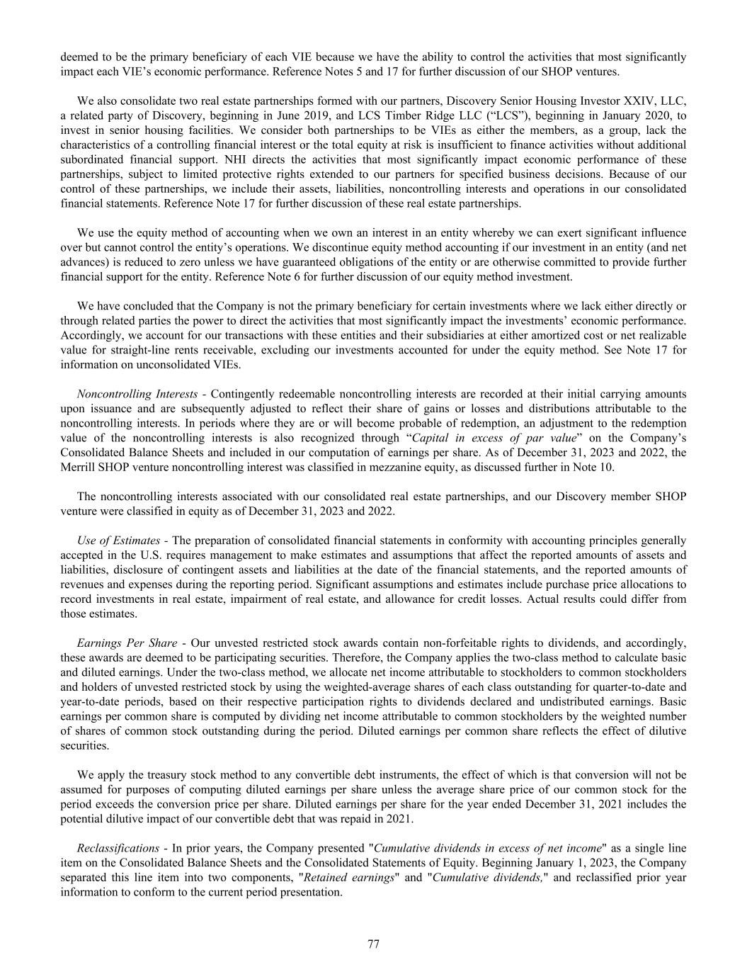 deemed to be the primary beneficiary of each VIE because we have the ability to control the activities that most significantly impact each VIE’s economic performance. Reference Notes 5 and 17 for further discussion of our SHOP ventures. We also consolidate two real estate partnerships formed with our partners, Discovery Senior Housing Investor XXIV, LLC, a related party of Discovery, beginning in June 2019, and LCS Timber Ridge LLC (“LCS”), beginning in January 2020, to invest in senior housing facilities. We consider both partnerships to be VIEs as either the members, as a group, lack the characteristics of a controlling financial interest or the total equity at risk is insufficient to finance activities without additional subordinated financial support. NHI directs the activities that most significantly impact economic performance of these partnerships, subject to limited protective rights extended to our partners for specified business decisions. Because of our control of these partnerships, we include their assets, liabilities, noncontrolling interests and operations in our consolidated financial statements. Reference Note 17 for further discussion of these real estate partnerships. We use the equity method of accounting when we own an interest in an entity whereby we can exert significant influence over but cannot control the entity’s operations. We discontinue equity method accounting if our investment in an entity (and net advances) is reduced to zero unless we have guaranteed obligations of the entity or are otherwise committed to provide further financial support for the entity. Reference Note 6 for further discussion of our equity method investment. We have concluded that the Company is not the primary beneficiary for certain investments where we lack either directly or through related parties the power to direct the activities that most significantly impact the investments’ economic performance. Accordingly, we account for our transactions with these entities and their subsidiaries at either amortized cost or net realizable value for straight-line rents receivable, excluding our investments accounted for under the equity method. See Note 17 for information on unconsolidated VIEs. Noncontrolling Interests - Contingently redeemable noncontrolling interests are recorded at their initial carrying amounts upon issuance and are subsequently adjusted to reflect their share of gains or losses and distributions attributable to the noncontrolling interests. In periods where they are or will become probable of redemption, an adjustment to the redemption value of the noncontrolling interests is also recognized through “Capital in excess of par value” on the Company’s Consolidated Balance Sheets and included in our computation of earnings per share. As of December 31, 2023 and 2022, the Merrill SHOP venture noncontrolling interest was classified in mezzanine equity, as discussed further in Note 10. The noncontrolling interests associated with our consolidated real estate partnerships, and our Discovery member SHOP venture were classified in equity as of December 31, 2023 and 2022. Use of Estimates - The preparation of consolidated financial statements in conformity with accounting principles generally accepted in the U.S. requires management to make estimates and assumptions that affect the reported amounts of assets and liabilities, disclosure of contingent assets and liabilities at the date of the financial statements, and the reported amounts of revenues and expenses during the reporting period. Significant assumptions and estimates include purchase price allocations to record investments in real estate, impairment of real estate, and allowance for credit losses. Actual results could differ from those estimates. Earnings Per Share - Our unvested restricted stock awards contain non-forfeitable rights to dividends, and accordingly, these awards are deemed to be participating securities. Therefore, the Company applies the two-class method to calculate basic and diluted earnings. Under the two-class method, we allocate net income attributable to stockholders to common stockholders and holders of unvested restricted stock by using the weighted-average shares of each class outstanding for quarter-to-date and year-to-date periods, based on their respective participation rights to dividends declared and undistributed earnings. Basic earnings per common share is computed by dividing net income attributable to common stockholders by the weighted number of shares of common stock outstanding during the period. Diluted earnings per common share reflects the effect of dilutive securities. We apply the treasury stock method to any convertible debt instruments, the effect of which is that conversion will not be assumed for purposes of computing diluted earnings per share unless the average share price of our common stock for the period exceeds the conversion price per share. Diluted earnings per share for the year ended December 31, 2021 includes the potential dilutive impact of our convertible debt that was repaid in 2021. Reclassifications - In prior years, the Company presented "Cumulative dividends in excess of net income" as a single line item on the Consolidated Balance Sheets and the Consolidated Statements of Equity. Beginning January 1, 2023, the Company separated this line item into two components, "Retained earnings" and "Cumulative dividends," and reclassified prior year information to conform to the current period presentation. 77