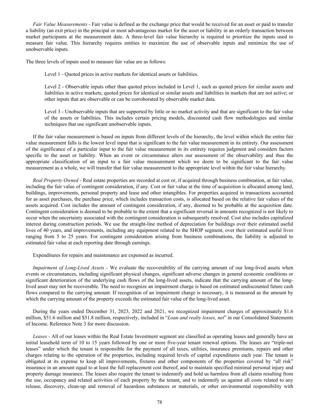 Fair Value Measurements - Fair value is defined as the exchange price that would be received for an asset or paid to transfer a liability (an exit price) in the principal or most advantageous market for the asset or liability in an orderly transaction between market participants at the measurement date. A three-level fair value hierarchy is required to prioritize the inputs used to measure fair value. This hierarchy requires entities to maximize the use of observable inputs and minimize the use of unobservable inputs. The three levels of inputs used to measure fair value are as follows: Level 1 - Quoted prices in active markets for identical assets or liabilities. Level 2 - Observable inputs other than quoted prices included in Level 1, such as quoted prices for similar assets and liabilities in active markets; quoted prices for identical or similar assets and liabilities in markets that are not active; or other inputs that are observable or can be corroborated by observable market data. Level 3 - Unobservable inputs that are supported by little or no market activity and that are significant to the fair value of the assets or liabilities. This includes certain pricing models, discounted cash flow methodologies and similar techniques that use significant unobservable inputs. If the fair value measurement is based on inputs from different levels of the hierarchy, the level within which the entire fair value measurement falls is the lowest level input that is significant to the fair value measurement in its entirety. Our assessment of the significance of a particular input to the fair value measurement in its entirety requires judgment and considers factors specific to the asset or liability. When an event or circumstance alters our assessment of the observability and thus the appropriate classification of an input to a fair value measurement which we deem to be significant to the fair value measurement as a whole, we will transfer that fair value measurement to the appropriate level within the fair value hierarchy. Real Property Owned - Real estate properties are recorded at cost or, if acquired through business combination, at fair value, including the fair value of contingent consideration, if any. Cost or fair value at the time of acquisition is allocated among land, buildings, improvements, personal property and lease and other intangibles. For properties acquired in transactions accounted for as asset purchases, the purchase price, which includes transaction costs, is allocated based on the relative fair values of the assets acquired. Cost includes the amount of contingent consideration, if any, deemed to be probable at the acquisition date. Contingent consideration is deemed to be probable to the extent that a significant reversal in amounts recognized is not likely to occur when the uncertainty associated with the contingent consideration is subsequently resolved. Cost also includes capitalized interest during construction periods. We use the straight-line method of depreciation for buildings over their estimated useful lives of 40 years, and improvements, including any equipment related to the SHOP segment, over their estimated useful lives ranging from 5 to 25 years. For contingent consideration arising from business combinations, the liability is adjusted to estimated fair value at each reporting date through earnings. Expenditures for repairs and maintenance are expensed as incurred. Impairment of Long-Lived Assets - We evaluate the recoverability of the carrying amount of our long-lived assets when events or circumstances, including significant physical changes, significant adverse changes in general economic conditions or significant deterioration of the underlying cash flows of the long-lived assets, indicate that the carrying amount of the long- lived asset may not be recoverable. The need to recognize an impairment charge is based on estimated undiscounted future cash flows compared to the carrying amount. If recognition of an impairment charge is necessary, it is measured as the amount by which the carrying amount of the property exceeds the estimated fair value of the long-lived asset. During the years ended December 31, 2023, 2022 and 2021, we recognized impairment charges of approximately $1.6 million, $51.6 million and $51.8 million, respectively, included in “Loan and realty losses, net” in our Consolidated Statements of Income. Reference Note 3 for more discussion. Leases - All of our leases within the Real Estate Investment segment are classified as operating leases and generally have an initial leasehold term of 10 to 15 years followed by one or more five-year tenant renewal options. The leases are “triple-net leases” under which the tenant is responsible for the payment of all taxes, utilities, insurance premiums, repairs and other charges relating to the operation of the properties, including required levels of capital expenditures each year. The tenant is obligated at its expense to keep all improvements, fixtures and other components of the properties covered by “all risk” insurance in an amount equal to at least the full replacement cost thereof, and to maintain specified minimal personal injury and property damage insurance. The leases also require the tenant to indemnify and hold us harmless from all claims resulting from the use, occupancy and related activities of each property by the tenant, and to indemnify us against all costs related to any release, discovery, clean-up and removal of hazardous substances or materials, or other environmental responsibility with 78