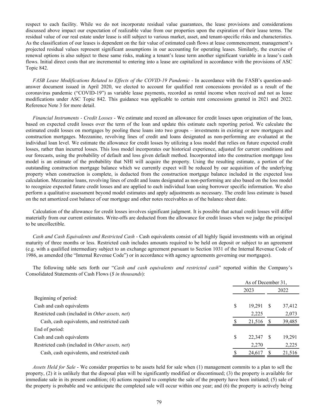 respect to each facility. While we do not incorporate residual value guarantees, the lease provisions and considerations discussed above impact our expectation of realizable value from our properties upon the expiration of their lease terms. The residual value of our real estate under lease is still subject to various market, asset, and tenant-specific risks and characteristics. As the classification of our leases is dependent on the fair value of estimated cash flows at lease commencement, management’s projected residual values represent significant assumptions in our accounting for operating leases. Similarly, the exercise of renewal options is also subject to these same risks, making a tenant’s lease term another significant variable in a lease’s cash flows. Initial direct costs that are incremental to entering into a lease are capitalized in accordance with the provisions of ASC Topic 842. FASB Lease Modifications Related to Effects of the COVID-19 Pandemic - In accordance with the FASB’s question-and- answer document issued in April 2020, we elected to account for qualified rent concessions provided as a result of the coronavirus pandemic (“COVID-19”) as variable lease payments, recorded as rental income when received and not as lease modifications under ASC Topic 842. This guidance was applicable to certain rent concessions granted in 2021 and 2022. Reference Note 3 for more detail. Financial Instruments - Credit Losses - We estimate and record an allowance for credit losses upon origination of the loan, based on expected credit losses over the term of the loan and update this estimate each reporting period. We calculate the estimated credit losses on mortgages by pooling these loans into two groups – investments in existing or new mortgages and construction mortgages. Mezzanine, revolving lines of credit and loans designated as non-performing are evaluated at the individual loan level. We estimate the allowance for credit losses by utilizing a loss model that relies on future expected credit losses, rather than incurred losses. This loss model incorporates our historical experience, adjusted for current conditions and our forecasts, using the probability of default and loss given default method. Incorporated into the construction mortgage loss model is an estimate of the probability that NHI will acquire the property. Using the resulting estimate, a portion of the outstanding construction mortgage balance which we currently expect will be reduced by our acquisition of the underlying property when construction is complete, is deducted from the construction mortgage balance included in the expected loss calculation. Mezzanine loans, revolving lines of credit and loans designated as non-performing are also based on the loss model to recognize expected future credit losses and are applied to each individual loan using borrower specific information. We also perform a qualitative assessment beyond model estimates and apply adjustments as necessary. The credit loss estimate is based on the net amortized cost balance of our mortgage and other notes receivables as of the balance sheet date. Calculation of the allowance for credit losses involves significant judgment. It is possible that actual credit losses will differ materially from our current estimates. Write-offs are deducted from the allowance for credit losses when we judge the principal to be uncollectible. Cash and Cash Equivalents and Restricted Cash - Cash equivalents consist of all highly liquid investments with an original maturity of three months or less. Restricted cash includes amounts required to be held on deposit or subject to an agreement (e.g. with a qualified intermediary subject to an exchange agreement pursuant to Section 1031 of the Internal Revenue Code of 1986, as amended (the “Internal Revenue Code”) or in accordance with agency agreements governing our mortgages). The following table sets forth our “Cash and cash equivalents and restricted cash” reported within the Company’s Consolidated Statements of Cash Flows ($ in thousands): As of December 31, 2023 2022 Beginning of period: Cash and cash equivalents $ 19,291 $ 37,412 Restricted cash (included in Other assets, net) 2,225 2,073 Cash, cash equivalents, and restricted cash $ 21,516 $ 39,485 End of period: Cash and cash equivalents $ 22,347 $ 19,291 Restricted cash (included in Other assets, net) 2,270 2,225 Cash, cash equivalents, and restricted cash $ 24,617 $ 21,516 Assets Held for Sale - We consider properties to be assets held for sale when (1) management commits to a plan to sell the property, (2) it is unlikely that the disposal plan will be significantly modified or discontinued; (3) the property is available for immediate sale in its present condition; (4) actions required to complete the sale of the property have been initiated; (5) sale of the property is probable and we anticipate the completed sale will occur within one year; and (6) the property is actively being 79