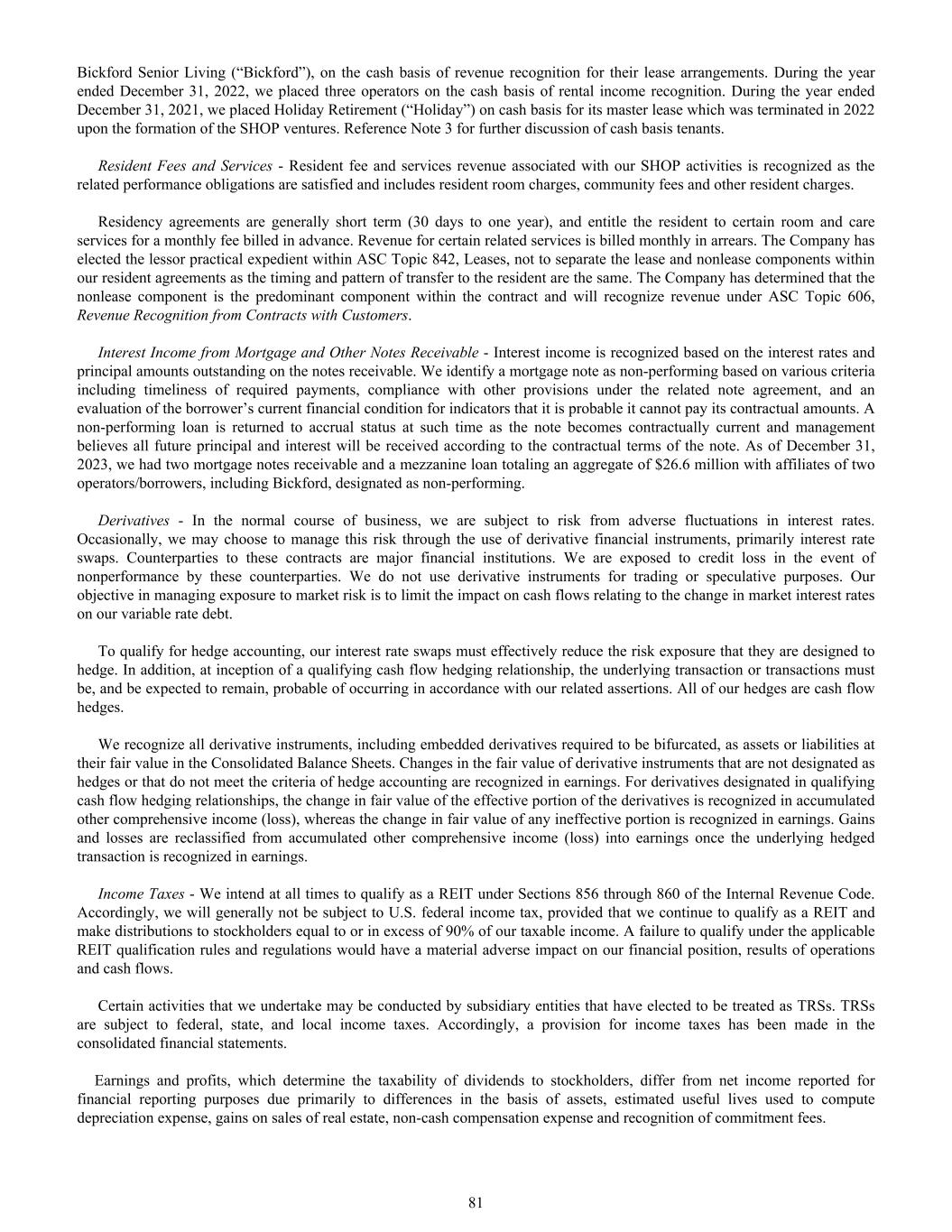 Bickford Senior Living (“Bickford”), on the cash basis of revenue recognition for their lease arrangements. During the year ended December 31, 2022, we placed three operators on the cash basis of rental income recognition. During the year ended December 31, 2021, we placed Holiday Retirement (“Holiday”) on cash basis for its master lease which was terminated in 2022 upon the formation of the SHOP ventures. Reference Note 3 for further discussion of cash basis tenants. Resident Fees and Services - Resident fee and services revenue associated with our SHOP activities is recognized as the related performance obligations are satisfied and includes resident room charges, community fees and other resident charges. Residency agreements are generally short term (30 days to one year), and entitle the resident to certain room and care services for a monthly fee billed in advance. Revenue for certain related services is billed monthly in arrears. The Company has elected the lessor practical expedient within ASC Topic 842, Leases, not to separate the lease and nonlease components within our resident agreements as the timing and pattern of transfer to the resident are the same. The Company has determined that the nonlease component is the predominant component within the contract and will recognize revenue under ASC Topic 606, Revenue Recognition from Contracts with Customers. Interest Income from Mortgage and Other Notes Receivable - Interest income is recognized based on the interest rates and principal amounts outstanding on the notes receivable. We identify a mortgage note as non-performing based on various criteria including timeliness of required payments, compliance with other provisions under the related note agreement, and an evaluation of the borrower’s current financial condition for indicators that it is probable it cannot pay its contractual amounts. A non-performing loan is returned to accrual status at such time as the note becomes contractually current and management believes all future principal and interest will be received according to the contractual terms of the note. As of December 31, 2023, we had two mortgage notes receivable and a mezzanine loan totaling an aggregate of $26.6 million with affiliates of two operators/borrowers, including Bickford, designated as non-performing. Derivatives - In the normal course of business, we are subject to risk from adverse fluctuations in interest rates. Occasionally, we may choose to manage this risk through the use of derivative financial instruments, primarily interest rate swaps. Counterparties to these contracts are major financial institutions. We are exposed to credit loss in the event of nonperformance by these counterparties. We do not use derivative instruments for trading or speculative purposes. Our objective in managing exposure to market risk is to limit the impact on cash flows relating to the change in market interest rates on our variable rate debt. To qualify for hedge accounting, our interest rate swaps must effectively reduce the risk exposure that they are designed to hedge. In addition, at inception of a qualifying cash flow hedging relationship, the underlying transaction or transactions must be, and be expected to remain, probable of occurring in accordance with our related assertions. All of our hedges are cash flow hedges. We recognize all derivative instruments, including embedded derivatives required to be bifurcated, as assets or liabilities at their fair value in the Consolidated Balance Sheets. Changes in the fair value of derivative instruments that are not designated as hedges or that do not meet the criteria of hedge accounting are recognized in earnings. For derivatives designated in qualifying cash flow hedging relationships, the change in fair value of the effective portion of the derivatives is recognized in accumulated other comprehensive income (loss), whereas the change in fair value of any ineffective portion is recognized in earnings. Gains and losses are reclassified from accumulated other comprehensive income (loss) into earnings once the underlying hedged transaction is recognized in earnings. Income Taxes - We intend at all times to qualify as a REIT under Sections 856 through 860 of the Internal Revenue Code. Accordingly, we will generally not be subject to U.S. federal income tax, provided that we continue to qualify as a REIT and make distributions to stockholders equal to or in excess of 90% of our taxable income. A failure to qualify under the applicable REIT qualification rules and regulations would have a material adverse impact on our financial position, results of operations and cash flows. Certain activities that we undertake may be conducted by subsidiary entities that have elected to be treated as TRSs. TRSs are subject to federal, state, and local income taxes. Accordingly, a provision for income taxes has been made in the consolidated financial statements. Earnings and profits, which determine the taxability of dividends to stockholders, differ from net income reported for financial reporting purposes due primarily to differences in the basis of assets, estimated useful lives used to compute depreciation expense, gains on sales of real estate, non-cash compensation expense and recognition of commitment fees. 81