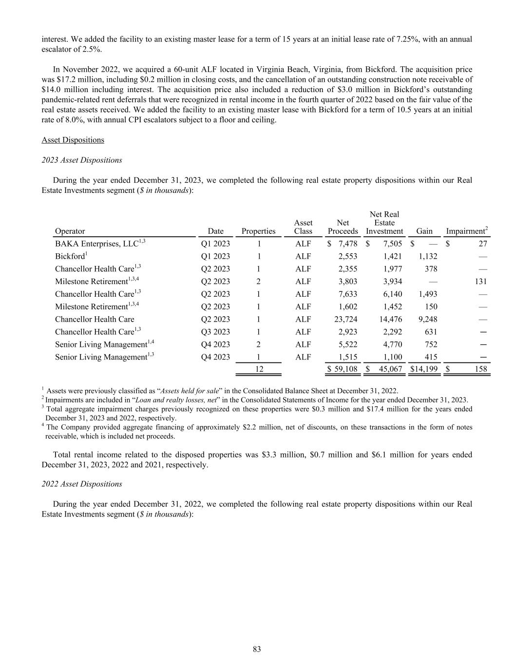 interest. We added the facility to an existing master lease for a term of 15 years at an initial lease rate of 7.25%, with an annual escalator of 2.5%. In November 2022, we acquired a 60-unit ALF located in Virginia Beach, Virginia, from Bickford. The acquisition price was $17.2 million, including $0.2 million in closing costs, and the cancellation of an outstanding construction note receivable of $14.0 million including interest. The acquisition price also included a reduction of $3.0 million in Bickford’s outstanding pandemic-related rent deferrals that were recognized in rental income in the fourth quarter of 2022 based on the fair value of the real estate assets received. We added the facility to an existing master lease with Bickford for a term of 10.5 years at an initial rate of 8.0%, with annual CPI escalators subject to a floor and ceiling. Asset Dispositions 2023 Asset Dispositions During the year ended December 31, 2023, we completed the following real estate property dispositions within our Real Estate Investments segment ($ in thousands): Operator Date Properties Asset Class Net Proceeds Net Real Estate Investment Gain Impairment2 BAKA Enterprises, LLC1,3 Q1 2023 1 ALF $ 7,478 $ 7,505 $ — $ 27 Bickford1 Q1 2023 1 ALF 2,553 1,421 1,132 — Chancellor Health Care1,3 Q2 2023 1 ALF 2,355 1,977 378 — Milestone Retirement1,3,4 Q2 2023 2 ALF 3,803 3,934 — 131 Chancellor Health Care1,3 Q2 2023 1 ALF 7,633 6,140 1,493 — Milestone Retirement1,3,4 Q2 2023 1 ALF 1,602 1,452 150 — Chancellor Health Care Q2 2023 1 ALF 23,724 14,476 9,248 — Chancellor Health Care1,3 Q3 2023 1 ALF 2,923 2,292 631 — Senior Living Management1,4 Q4 2023 2 ALF 5,522 4,770 752 — Senior Living Management1,3 Q4 2023 1 ALF 1,515 1,100 415 — 12 $ 59,108 $ 45,067 $ 14,199 $ 158 1 Assets were previously classified as “Assets held for sale” in the Consolidated Balance Sheet at December 31, 2022. 2 Impairments are included in “Loan and realty losses, net” in the Consolidated Statements of Income for the year ended December 31, 2023. 3 Total aggregate impairment charges previously recognized on these properties were $0.3 million and $17.4 million for the years ended December 31, 2023 and 2022, respectively. 4 The Company provided aggregate financing of approximately $2.2 million, net of discounts, on these transactions in the form of notes receivable, which is included net proceeds. Total rental income related to the disposed properties was $3.3 million, $0.7 million and $6.1 million for years ended December 31, 2023, 2022 and 2021, respectively. 2022 Asset Dispositions During the year ended December 31, 2022, we completed the following real estate property dispositions within our Real Estate Investments segment ($ in thousands): 83