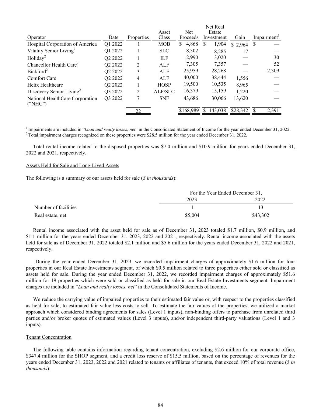 Operator Date Properties Asset Class Net Proceeds Net Real Estate Investment Gain Impairment1 Hospital Corporation of America Q1 2022 1 MOB $ 4,868 $ 1,904 $ 2,964 $ — Vitality Senior Living2 Q1 2022 1 SLC 8,302 8,285 17 — Holiday2 Q2 2022 1 ILF 2,990 3,020 — 30 Chancellor Health Care2 Q2 2022 2 ALF 7,305 7,357 — 52 Bickford2 Q2 2022 3 ALF 25,959 28,268 — 2,309 Comfort Care Q2 2022 4 ALF 40,000 38,444 1,556 — Helix Healthcare Q2 2022 1 HOSP 19,500 10,535 8,965 — Discovery Senior Living2 Q3 2022 2 ALF/SLC 16,379 15,159 1,220 — National HealthCare Corporation (“NHC”) Q3 2022 7 SNF 43,686 30,066 13,620 — 22 $ 168,989 $ 143,038 $ 28,342 $ 2,391 1 Impairments are included in “Loan and realty losses, net” in the Consolidated Statement of Income for the year ended December 31, 2022. 2 Total impairment charges recognized on these properties were $28.5 million for the year ended December 31, 2022. Total rental income related to the disposed properties was $7.0 million and $10.9 million for years ended December 31, 2022 and 2021, respectively. Assets Held for Sale and Long-Lived Assets The following is a summary of our assets held for sale ($ in thousands): For the Year Ended December 31, 2023 2022 Number of facilities 1 13 Real estate, net $5,004 $43,302 Rental income associated with the asset held for sale as of December 31, 2023 totaled $1.7 million, $0.9 million, and $1.1 million for the years ended December 31, 2023, 2022 and 2021, respectively. Rental income associated with the assets held for sale as of December 31, 2022 totaled $2.1 million and $5.6 million for the years ended December 31, 2022 and 2021, respectively. During the year ended December 31, 2023, we recorded impairment charges of approximately $1.6 million for four properties in our Real Estate Investments segment, of which $0.5 million related to three properties either sold or classified as assets held for sale. During the year ended December 31, 2022, we recorded impairment charges of approximately $51.6 million for 19 properties which were sold or classified as held for sale in our Real Estate Investments segment. Impairment charges are included in “Loan and realty losses, net” in the Consolidated Statements of Income. We reduce the carrying value of impaired properties to their estimated fair value or, with respect to the properties classified as held for sale, to estimated fair value less costs to sell. To estimate the fair values of the properties, we utilized a market approach which considered binding agreements for sales (Level 1 inputs), non-binding offers to purchase from unrelated third parties and/or broker quotes of estimated values (Level 3 inputs), and/or independent third-party valuations (Level 1 and 3 inputs). Tenant Concentration The following table contains information regarding tenant concentration, excluding $2.6 million for our corporate office, $347.4 million for the SHOP segment, and a credit loss reserve of $15.5 million, based on the percentage of revenues for the years ended December 31, 2023, 2022 and 2021 related to tenants or affiliates of tenants, that exceed 10% of total revenue ($ in thousands): 84