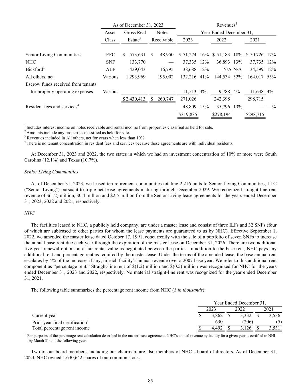 As of December 31, 2023 Revenues1 Asset Gross Real Notes Year Ended December 31, Class Estate2 Receivable 2023 2022 2021 Senior Living Communities EFC $ 573,631 $ 48,950 $ 51,274 16% $ 51,183 18% $ 50,726 17% NHC SNF 133,770 — 37,335 12% 36,893 13% 37,735 12% Bickford3 ALF 429,043 16,795 38,688 12% N/A N/A 34,599 12% All others, net Various 1,293,969 195,002 132,216 41% 144,534 52% 164,017 55% Escrow funds received from tenants for property operating expenses Various — — 11,513 4% 9,788 4% 11,638 4% $ 2,430,413 $ 260,747 271,026 242,398 298,715 Resident fees and services4 48,809 15% 35,796 13% — —% $ 319,835 $ 278,194 $ 298,715 1 Includes interest income on notes receivable and rental income from properties classified as held for sale. 2 Amounts include any properties classified as held for sale. 3 Revenues included in All others, net for years when less than 10%. 4 There is no tenant concentration in resident fees and services because these agreements are with individual residents. At December 31, 2023 and 2022, the two states in which we had an investment concentration of 10% or more were South Carolina (12.1%) and Texas (10.7%). Senior Living Communities As of December 31, 2023, we leased ten retirement communities totaling 2,216 units to Senior Living Communities, LLC (“Senior Living”) pursuant to triple-net lease agreements maturing through December 2029. We recognized straight-line rent revenue of $(1.2) million, $0.4 million and $2.5 million from the Senior Living lease agreements for the years ended December 31, 2023, 2022 and 2021, respectively. NHC The facilities leased to NHC, a publicly held company, are under a master lease and consist of three ILFs and 32 SNFs (four of which are subleased to other parties for whom the lease payments are guaranteed to us by NHC). Effective September 1, 2022, we amended the master lease dated October 17, 1991, concurrently with the sale of a portfolio of seven SNFs to increase the annual base rent due each year through the expiration of the master lease on December 31, 2026. There are two additional five-year renewal options at a fair rental value as negotiated between the parties. In addition to the base rent, NHC pays any additional rent and percentage rent as required by the master lease. Under the terms of the amended lease, the base annual rent escalates by 4% of the increase, if any, in each facility’s annual revenue over a 2007 base year. We refer to this additional rent component as “percentage rent.” Straight-line rent of $(1.2) million and $(0.5) million was recognized for NHC for the years ended December 31, 2023 and 2022, respectively. No material straight-line rent was recognized for the year ended December 31, 2021. The following table summarizes the percentage rent income from NHC ($ in thousands): Year Ended December 31, 2023 2022 2021 Current year $ 3,862 $ 3,332 $ 3,536 Prior year final certification1 630 (206) (5) Total percentage rent income $ 4,492 $ 3,126 $ 3,531 1 For purposes of the percentage rent calculation described in the master lease agreement, NHC’s annual revenue by facility for a given year is certified to NHI by March 31st of the following year. Two of our board members, including our chairman, are also members of NHC’s board of directors. As of December 31, 2023, NHC owned 1,630,642 shares of our common stock. 85
