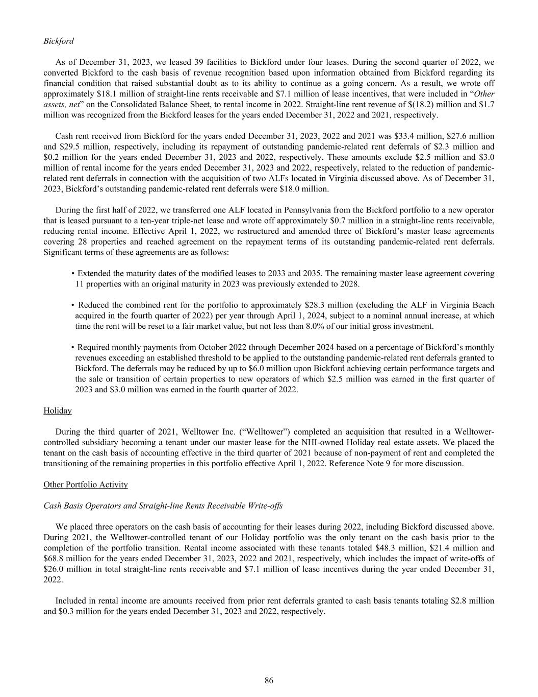 Bickford As of December 31, 2023, we leased 39 facilities to Bickford under four leases. During the second quarter of 2022, we converted Bickford to the cash basis of revenue recognition based upon information obtained from Bickford regarding its financial condition that raised substantial doubt as to its ability to continue as a going concern. As a result, we wrote off approximately $18.1 million of straight-line rents receivable and $7.1 million of lease incentives, that were included in “Other assets, net” on the Consolidated Balance Sheet, to rental income in 2022. Straight-line rent revenue of $(18.2) million and $1.7 million was recognized from the Bickford leases for the years ended December 31, 2022 and 2021, respectively. Cash rent received from Bickford for the years ended December 31, 2023, 2022 and 2021 was $33.4 million, $27.6 million and $29.5 million, respectively, including its repayment of outstanding pandemic-related rent deferrals of $2.3 million and $0.2 million for the years ended December 31, 2023 and 2022, respectively. These amounts exclude $2.5 million and $3.0 million of rental income for the years ended December 31, 2023 and 2022, respectively, related to the reduction of pandemic- related rent deferrals in connection with the acquisition of two ALFs located in Virginia discussed above. As of December 31, 2023, Bickford’s outstanding pandemic-related rent deferrals were $18.0 million. During the first half of 2022, we transferred one ALF located in Pennsylvania from the Bickford portfolio to a new operator that is leased pursuant to a ten-year triple-net lease and wrote off approximately $0.7 million in a straight-line rents receivable, reducing rental income. Effective April 1, 2022, we restructured and amended three of Bickford’s master lease agreements covering 28 properties and reached agreement on the repayment terms of its outstanding pandemic-related rent deferrals. Significant terms of these agreements are as follows: • Extended the maturity dates of the modified leases to 2033 and 2035. The remaining master lease agreement covering 11 properties with an original maturity in 2023 was previously extended to 2028. • Reduced the combined rent for the portfolio to approximately $28.3 million (excluding the ALF in Virginia Beach acquired in the fourth quarter of 2022) per year through April 1, 2024, subject to a nominal annual increase, at which time the rent will be reset to a fair market value, but not less than 8.0% of our initial gross investment. • Required monthly payments from October 2022 through December 2024 based on a percentage of Bickford’s monthly revenues exceeding an established threshold to be applied to the outstanding pandemic-related rent deferrals granted to Bickford. The deferrals may be reduced by up to $6.0 million upon Bickford achieving certain performance targets and the sale or transition of certain properties to new operators of which $2.5 million was earned in the first quarter of 2023 and $3.0 million was earned in the fourth quarter of 2022. Holiday During the third quarter of 2021, Welltower Inc. (“Welltower”) completed an acquisition that resulted in a Welltower- controlled subsidiary becoming a tenant under our master lease for the NHI-owned Holiday real estate assets. We placed the tenant on the cash basis of accounting effective in the third quarter of 2021 because of non-payment of rent and completed the transitioning of the remaining properties in this portfolio effective April 1, 2022. Reference Note 9 for more discussion. Other Portfolio Activity Cash Basis Operators and Straight-line Rents Receivable Write-offs We placed three operators on the cash basis of accounting for their leases during 2022, including Bickford discussed above. During 2021, the Welltower-controlled tenant of our Holiday portfolio was the only tenant on the cash basis prior to the completion of the portfolio transition. Rental income associated with these tenants totaled $48.3 million, $21.4 million and $68.8 million for the years ended December 31, 2023, 2022 and 2021, respectively, which includes the impact of write-offs of $26.0 million in total straight-line rents receivable and $7.1 million of lease incentives during the year ended December 31, 2022. Included in rental income are amounts received from prior rent deferrals granted to cash basis tenants totaling $2.8 million and $0.3 million for the years ended December 31, 2023 and 2022, respectively. 86