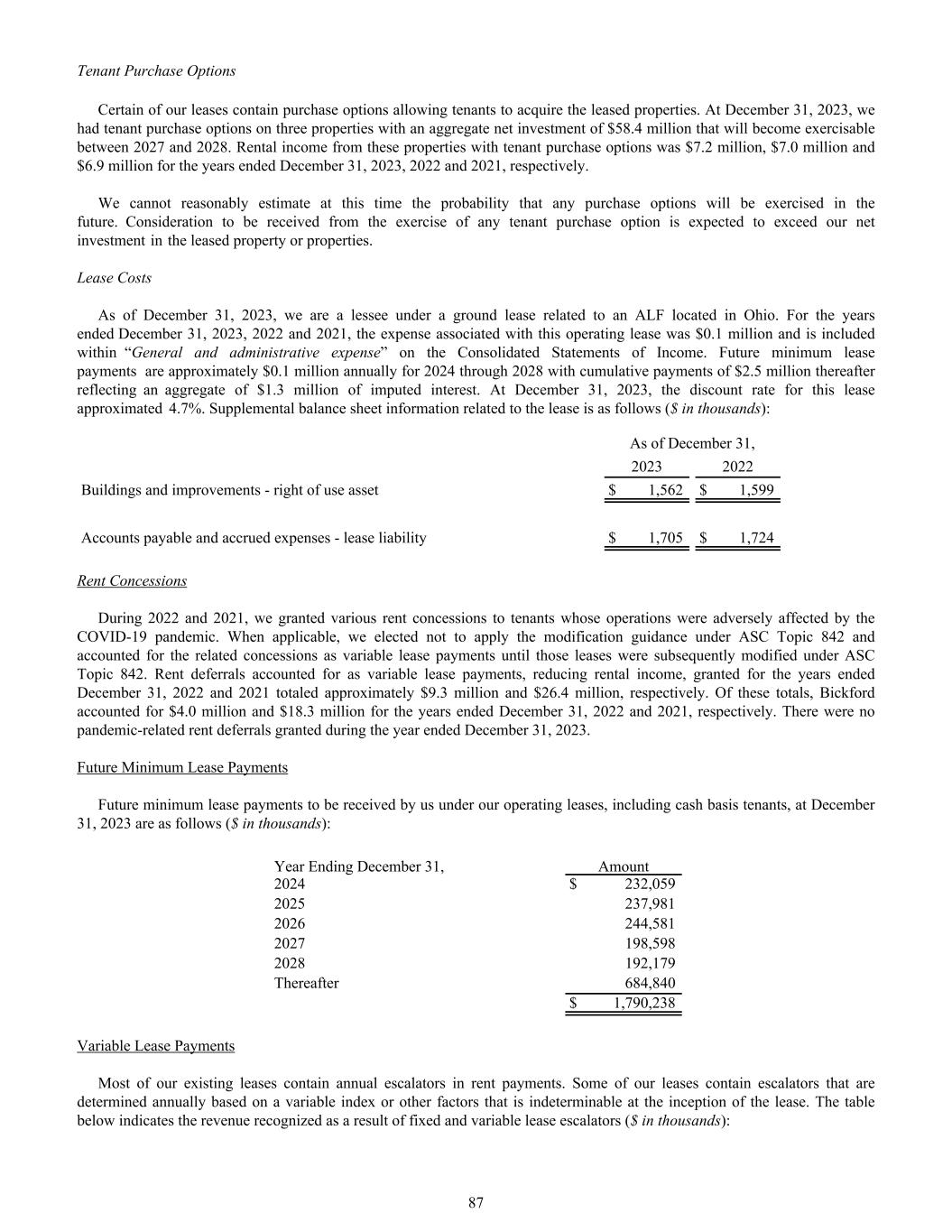 Tenant Purchase Options Certain of our leases contain purchase options allowing tenants to acquire the leased properties. At December 31, 2023, we had tenant purchase options on three properties with an aggregate net investment of $58.4 million that will become exercisable between 2027 and 2028. Rental income from these properties with tenant purchase options was $7.2 million, $7.0 million and $6.9 million for the years ended December 31, 2023, 2022 and 2021, respectively. We cannot reasonably estimate at this time the probability that any purchase options will be exercised in the future. Consideration to be received from the exercise of any tenant purchase option is expected to exceed our net investment in the leased property or properties. Lease Costs As of December 31, 2023, we are a lessee under a ground lease related to an ALF located in Ohio. For the years ended December 31, 2023, 2022 and 2021, the expense associated with this operating lease was $0.1 million and is included within “General and administrative expense” on the Consolidated Statements of Income. Future minimum lease payments are approximately $0.1 million annually for 2024 through 2028 with cumulative payments of $2.5 million thereafter reflecting an aggregate of $1.3 million of imputed interest. At December 31, 2023, the discount rate for this lease approximated 4.7%. Supplemental balance sheet information related to the lease is as follows ($ in thousands): As of December 31, 2023 2022 Buildings and improvements - right of use asset $ 1,562 $ 1,599 Accounts payable and accrued expenses - lease liability $ 1,705 $ 1,724 Rent Concessions During 2022 and 2021, we granted various rent concessions to tenants whose operations were adversely affected by the COVID-19 pandemic. When applicable, we elected not to apply the modification guidance under ASC Topic 842 and accounted for the related concessions as variable lease payments until those leases were subsequently modified under ASC Topic 842. Rent deferrals accounted for as variable lease payments, reducing rental income, granted for the years ended December 31, 2022 and 2021 totaled approximately $9.3 million and $26.4 million, respectively. Of these totals, Bickford accounted for $4.0 million and $18.3 million for the years ended December 31, 2022 and 2021, respectively. There were no pandemic-related rent deferrals granted during the year ended December 31, 2023. Future Minimum Lease Payments Future minimum lease payments to be received by us under our operating leases, including cash basis tenants, at December 31, 2023 are as follows ($ in thousands): Year Ending December 31, Amount 2024 $ 232,059 2025 237,981 2026 244,581 2027 198,598 2028 192,179 Thereafter 684,840 $ 1,790,238 Variable Lease Payments Most of our existing leases contain annual escalators in rent payments. Some of our leases contain escalators that are determined annually based on a variable index or other factors that is indeterminable at the inception of the lease. The table below indicates the revenue recognized as a result of fixed and variable lease escalators ($ in thousands): 87
