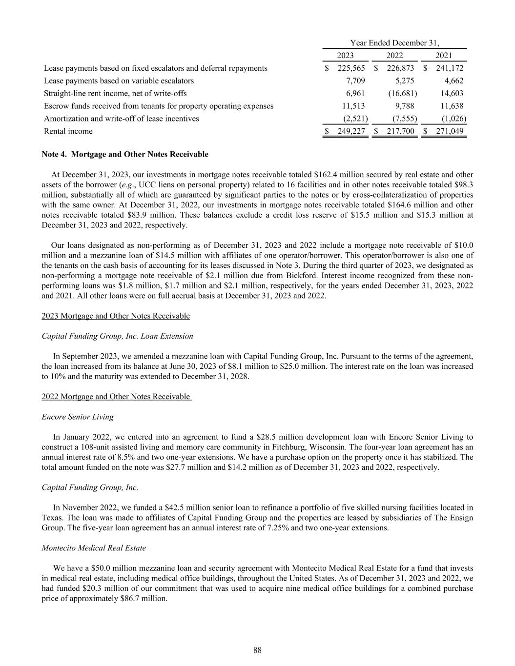 Year Ended December 31, 2023 2022 2021 Lease payments based on fixed escalators and deferral repayments $ 225,565 $ 226,873 $ 241,172 Lease payments based on variable escalators 7,709 5,275 4,662 Straight-line rent income, net of write-offs 6,961 (16,681) 14,603 Escrow funds received from tenants for property operating expenses 11,513 9,788 11,638 Amortization and write-off of lease incentives (2,521) (7,555) (1,026) Rental income $ 249,227 $ 217,700 $ 271,049 Note 4. Mortgage and Other Notes Receivable At December 31, 2023, our investments in mortgage notes receivable totaled $162.4 million secured by real estate and other assets of the borrower (e.g., UCC liens on personal property) related to 16 facilities and in other notes receivable totaled $98.3 million, substantially all of which are guaranteed by significant parties to the notes or by cross-collateralization of properties with the same owner. At December 31, 2022, our investments in mortgage notes receivable totaled $164.6 million and other notes receivable totaled $83.9 million. These balances exclude a credit loss reserve of $15.5 million and $15.3 million at December 31, 2023 and 2022, respectively. Our loans designated as non-performing as of December 31, 2023 and 2022 include a mortgage note receivable of $10.0 million and a mezzanine loan of $14.5 million with affiliates of one operator/borrower. This operator/borrower is also one of the tenants on the cash basis of accounting for its leases discussed in Note 3. During the third quarter of 2023, we designated as non-performing a mortgage note receivable of $2.1 million due from Bickford. Interest income recognized from these non- performing loans was $1.8 million, $1.7 million and $2.1 million, respectively, for the years ended December 31, 2023, 2022 and 2021. All other loans were on full accrual basis at December 31, 2023 and 2022. 2023 Mortgage and Other Notes Receivable Capital Funding Group, Inc. Loan Extension In September 2023, we amended a mezzanine loan with Capital Funding Group, Inc. Pursuant to the terms of the agreement, the loan increased from its balance at June 30, 2023 of $8.1 million to $25.0 million. The interest rate on the loan was increased to 10% and the maturity was extended to December 31, 2028. 2022 Mortgage and Other Notes Receivable Encore Senior Living In January 2022, we entered into an agreement to fund a $28.5 million development loan with Encore Senior Living to construct a 108-unit assisted living and memory care community in Fitchburg, Wisconsin. The four-year loan agreement has an annual interest rate of 8.5% and two one-year extensions. We have a purchase option on the property once it has stabilized. The total amount funded on the note was $27.7 million and $14.2 million as of December 31, 2023 and 2022, respectively. Capital Funding Group, Inc. In November 2022, we funded a $42.5 million senior loan to refinance a portfolio of five skilled nursing facilities located in Texas. The loan was made to affiliates of Capital Funding Group and the properties are leased by subsidiaries of The Ensign Group. The five-year loan agreement has an annual interest rate of 7.25% and two one-year extensions. Montecito Medical Real Estate We have a $50.0 million mezzanine loan and security agreement with Montecito Medical Real Estate for a fund that invests in medical real estate, including medical office buildings, throughout the United States. As of December 31, 2023 and 2022, we had funded $20.3 million of our commitment that was used to acquire nine medical office buildings for a combined purchase price of approximately $86.7 million. 88