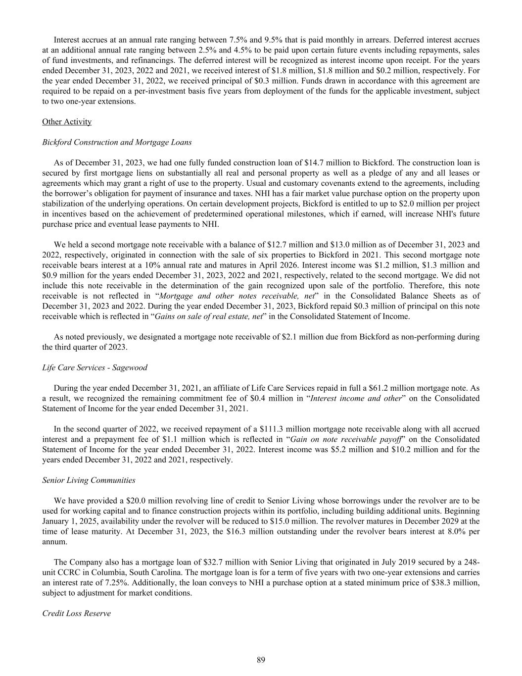 Interest accrues at an annual rate ranging between 7.5% and 9.5% that is paid monthly in arrears. Deferred interest accrues at an additional annual rate ranging between 2.5% and 4.5% to be paid upon certain future events including repayments, sales of fund investments, and refinancings. The deferred interest will be recognized as interest income upon receipt. For the years ended December 31, 2023, 2022 and 2021, we received interest of $1.8 million, $1.8 million and $0.2 million, respectively. For the year ended December 31, 2022, we received principal of $0.3 million. Funds drawn in accordance with this agreement are required to be repaid on a per-investment basis five years from deployment of the funds for the applicable investment, subject to two one-year extensions. Other Activity Bickford Construction and Mortgage Loans As of December 31, 2023, we had one fully funded construction loan of $14.7 million to Bickford. The construction loan is secured by first mortgage liens on substantially all real and personal property as well as a pledge of any and all leases or agreements which may grant a right of use to the property. Usual and customary covenants extend to the agreements, including the borrower’s obligation for payment of insurance and taxes. NHI has a fair market value purchase option on the property upon stabilization of the underlying operations. On certain development projects, Bickford is entitled to up to $2.0 million per project in incentives based on the achievement of predetermined operational milestones, which if earned, will increase NHI's future purchase price and eventual lease payments to NHI. We held a second mortgage note receivable with a balance of $12.7 million and $13.0 million as of December 31, 2023 and 2022, respectively, originated in connection with the sale of six properties to Bickford in 2021. This second mortgage note receivable bears interest at a 10% annual rate and matures in April 2026. Interest income was $1.2 million, $1.3 million and $0.9 million for the years ended December 31, 2023, 2022 and 2021, respectively, related to the second mortgage. We did not include this note receivable in the determination of the gain recognized upon sale of the portfolio. Therefore, this note receivable is not reflected in “Mortgage and other notes receivable, net” in the Consolidated Balance Sheets as of December 31, 2023 and 2022. During the year ended December 31, 2023, Bickford repaid $0.3 million of principal on this note receivable which is reflected in “Gains on sale of real estate, net” in the Consolidated Statement of Income. As noted previously, we designated a mortgage note receivable of $2.1 million due from Bickford as non-performing during the third quarter of 2023. Life Care Services - Sagewood During the year ended December 31, 2021, an affiliate of Life Care Services repaid in full a $61.2 million mortgage note. As a result, we recognized the remaining commitment fee of $0.4 million in “Interest income and other” on the Consolidated Statement of Income for the year ended December 31, 2021. In the second quarter of 2022, we received repayment of a $111.3 million mortgage note receivable along with all accrued interest and a prepayment fee of $1.1 million which is reflected in “Gain on note receivable payoff” on the Consolidated Statement of Income for the year ended December 31, 2022. Interest income was $5.2 million and $10.2 million and for the years ended December 31, 2022 and 2021, respectively. Senior Living Communities We have provided a $20.0 million revolving line of credit to Senior Living whose borrowings under the revolver are to be used for working capital and to finance construction projects within its portfolio, including building additional units. Beginning January 1, 2025, availability under the revolver will be reduced to $15.0 million. The revolver matures in December 2029 at the time of lease maturity. At December 31, 2023, the $16.3 million outstanding under the revolver bears interest at 8.0% per annum. The Company also has a mortgage loan of $32.7 million with Senior Living that originated in July 2019 secured by a 248- unit CCRC in Columbia, South Carolina. The mortgage loan is for a term of five years with two one-year extensions and carries an interest rate of 7.25%. Additionally, the loan conveys to NHI a purchase option at a stated minimum price of $38.3 million, subject to adjustment for market conditions. Credit Loss Reserve 89