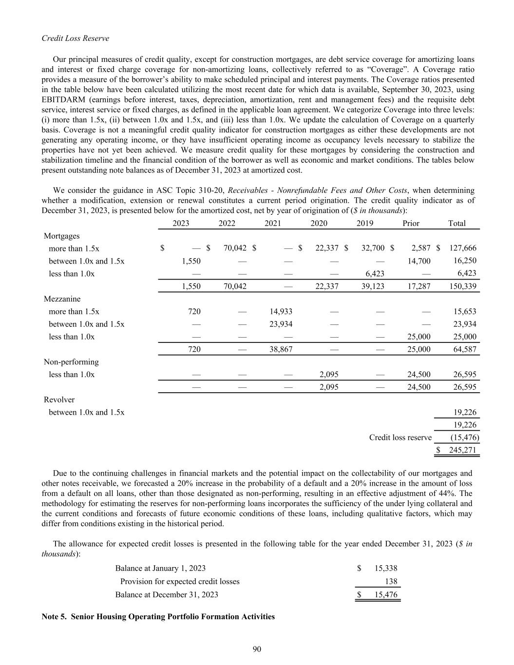 Credit Loss Reserve Our principal measures of credit quality, except for construction mortgages, are debt service coverage for amortizing loans and interest or fixed charge coverage for non-amortizing loans, collectively referred to as “Coverage”. A Coverage ratio provides a measure of the borrower’s ability to make scheduled principal and interest payments. The Coverage ratios presented in the table below have been calculated utilizing the most recent date for which data is available, September 30, 2023, using EBITDARM (earnings before interest, taxes, depreciation, amortization, rent and management fees) and the requisite debt service, interest service or fixed charges, as defined in the applicable loan agreement. We categorize Coverage into three levels: (i) more than 1.5x, (ii) between 1.0x and 1.5x, and (iii) less than 1.0x. We update the calculation of Coverage on a quarterly basis. Coverage is not a meaningful credit quality indicator for construction mortgages as either these developments are not generating any operating income, or they have insufficient operating income as occupancy levels necessary to stabilize the properties have not yet been achieved. We measure credit quality for these mortgages by considering the construction and stabilization timeline and the financial condition of the borrower as well as economic and market conditions. The tables below present outstanding note balances as of December 31, 2023 at amortized cost. We consider the guidance in ASC Topic 310-20, Receivables - Nonrefundable Fees and Other Costs, when determining whether a modification, extension or renewal constitutes a current period origination. The credit quality indicator as of December 31, 2023, is presented below for the amortized cost, net by year of origination of ($ in thousands): 2023 2022 2021 2020 2019 Prior Total Mortgages more than 1.5x $ — $ 70,042 $ — $ 22,337 $ 32,700 $ 2,587 $ 127,666 between 1.0x and 1.5x 1,550 — — — — 14,700 16,250 less than 1.0x — — — — 6,423 — 6,423 1,550 70,042 — 22,337 39,123 17,287 150,339 Mezzanine more than 1.5x 720 — 14,933 — — — 15,653 between 1.0x and 1.5x — — 23,934 — — — 23,934 less than 1.0x — — — — — 25,000 25,000 720 — 38,867 — — 25,000 64,587 Non-performing less than 1.0x — — — 2,095 — 24,500 26,595 — — — 2,095 — 24,500 26,595 Revolver between 1.0x and 1.5x 19,226 19,226 Credit loss reserve (15,476) $ 245,271 Due to the continuing challenges in financial markets and the potential impact on the collectability of our mortgages and other notes receivable, we forecasted a 20% increase in the probability of a default and a 20% increase in the amount of loss from a default on all loans, other than those designated as non-performing, resulting in an effective adjustment of 44%. The methodology for estimating the reserves for non-performing loans incorporates the sufficiency of the under lying collateral and the current conditions and forecasts of future economic conditions of these loans, including qualitative factors, which may differ from conditions existing in the historical period. The allowance for expected credit losses is presented in the following table for the year ended December 31, 2023 ($ in thousands): Balance at January 1, 2023 $ 15,338 Provision for expected credit losses 138 Balance at December 31, 2023 $ 15,476 Note 5. Senior Housing Operating Portfolio Formation Activities 90