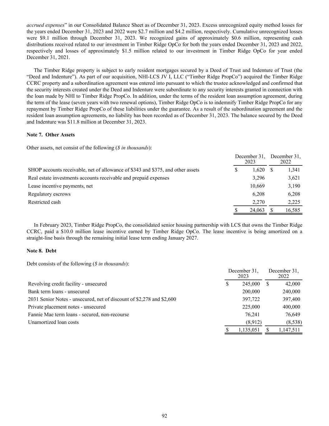 accrued expenses” in our Consolidated Balance Sheet as of December 31, 2023. Excess unrecognized equity method losses for the years ended December 31, 2023 and 2022 were $2.7 million and $4.2 million, respectively. Cumulative unrecognized losses were $9.1 million through December 31, 2023. We recognized gains of approximately $0.6 million, representing cash distributions received related to our investment in Timber Ridge OpCo for both the years ended December 31, 2023 and 2022, respectively and losses of approximately $1.5 million related to our investment in Timber Ridge OpCo for year ended December 31, 2021. The Timber Ridge property is subject to early resident mortgages secured by a Deed of Trust and Indenture of Trust (the “Deed and Indenture”). As part of our acquisition, NHI-LCS JV I, LLC (“Timber Ridge PropCo”) acquired the Timber Ridge CCRC property and a subordination agreement was entered into pursuant to which the trustee acknowledged and confirmed that the security interests created under the Deed and Indenture were subordinate to any security interests granted in connection with the loan made by NHI to Timber Ridge PropCo. In addition, under the terms of the resident loan assumption agreement, during the term of the lease (seven years with two renewal options), Timber Ridge OpCo is to indemnify Timber Ridge PropCo for any repayment by Timber Ridge PropCo of these liabilities under the guarantee. As a result of the subordination agreement and the resident loan assumption agreements, no liability has been recorded as of December 31, 2023. The balance secured by the Deed and Indenture was $11.8 million at December 31, 2023. Note 7. Other Assets Other assets, net consist of the following ($ in thousands): December 31, 2023 December 31, 2022 SHOP accounts receivable, net of allowance of $343 and $375, and other assets $ 1,620 $ 1,341 Real estate investments accounts receivable and prepaid expenses 3,296 3,621 Lease incentive payments, net 10,669 3,190 Regulatory escrows 6,208 6,208 Restricted cash 2,270 2,225 $ 24,063 $ 16,585 In February 2023, Timber Ridge PropCo, the consolidated senior housing partnership with LCS that owns the Timber Ridge CCRC, paid a $10.0 million lease incentive earned by Timber Ridge OpCo. The lease incentive is being amortized on a straight-line basis through the remaining initial lease term ending January 2027. Note 8. Debt Debt consists of the following ($ in thousands): December 31, 2023 December 31, 2022 Revolving credit facility - unsecured $ 245,000 $ 42,000 Bank term loans - unsecured 200,000 240,000 2031 Senior Notes - unsecured, net of discount of $2,278 and $2,600 397,722 397,400 Private placement notes - unsecured 225,000 400,000 Fannie Mae term loans - secured, non-recourse 76,241 76,649 Unamortized loan costs (8,912) (8,538) $ 1,135,051 $ 1,147,511 92