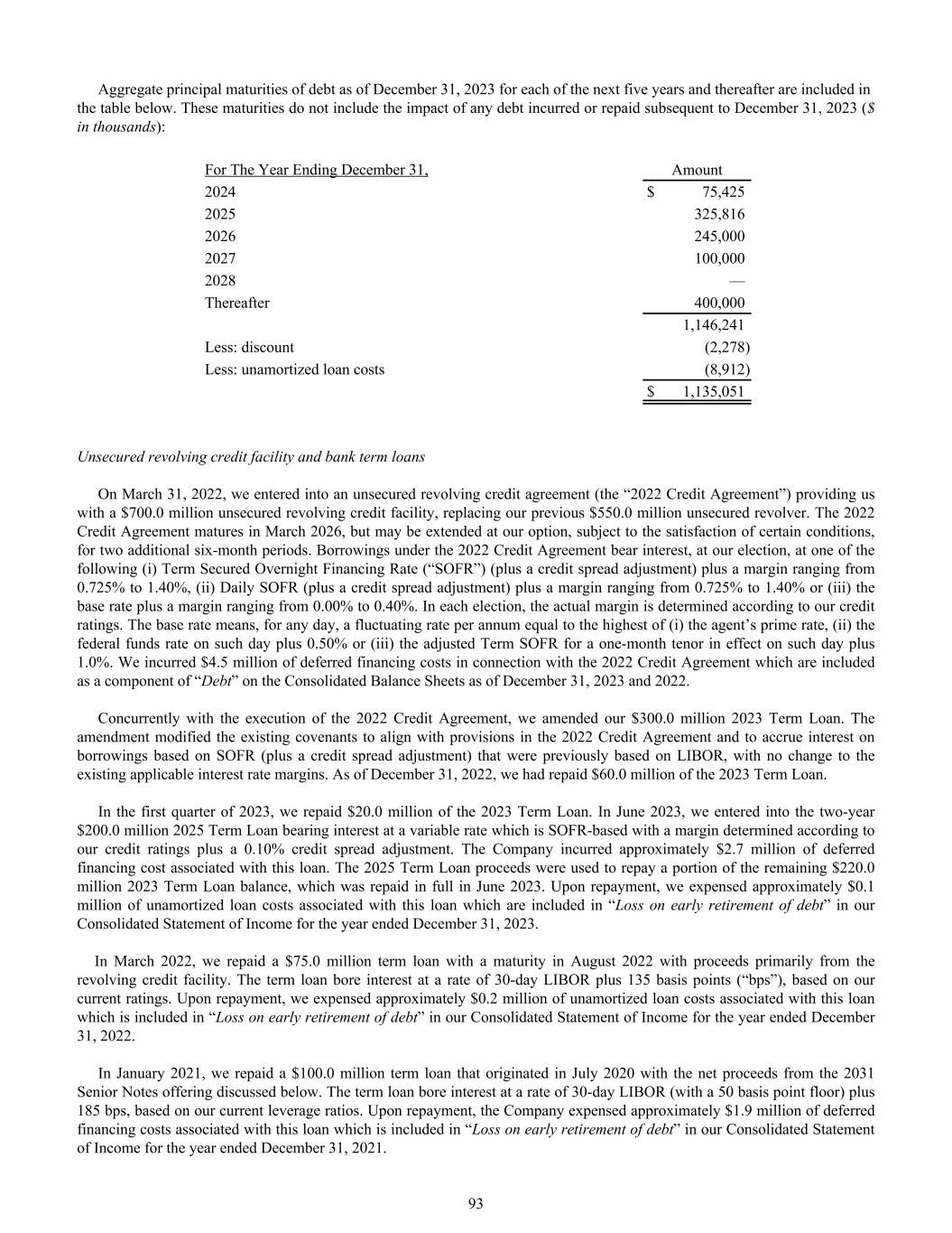 Aggregate principal maturities of debt as of December 31, 2023 for each of the next five years and thereafter are included in the table below. These maturities do not include the impact of any debt incurred or repaid subsequent to December 31, 2023 ($ in thousands): For The Year Ending December 31, Amount 2024 $ 75,425 2025 325,816 2026 245,000 2027 100,000 2028 — Thereafter 400,000 1,146,241 Less: discount (2,278) Less: unamortized loan costs (8,912) $ 1,135,051 Unsecured revolving credit facility and bank term loans On March 31, 2022, we entered into an unsecured revolving credit agreement (the “2022 Credit Agreement”) providing us with a $700.0 million unsecured revolving credit facility, replacing our previous $550.0 million unsecured revolver. The 2022 Credit Agreement matures in March 2026, but may be extended at our option, subject to the satisfaction of certain conditions, for two additional six-month periods. Borrowings under the 2022 Credit Agreement bear interest, at our election, at one of the following (i) Term Secured Overnight Financing Rate (“SOFR”) (plus a credit spread adjustment) plus a margin ranging from 0.725% to 1.40%, (ii) Daily SOFR (plus a credit spread adjustment) plus a margin ranging from 0.725% to 1.40% or (iii) the base rate plus a margin ranging from 0.00% to 0.40%. In each election, the actual margin is determined according to our credit ratings. The base rate means, for any day, a fluctuating rate per annum equal to the highest of (i) the agent’s prime rate, (ii) the federal funds rate on such day plus 0.50% or (iii) the adjusted Term SOFR for a one-month tenor in effect on such day plus 1.0%. We incurred $4.5 million of deferred financing costs in connection with the 2022 Credit Agreement which are included as a component of “Debt” on the Consolidated Balance Sheets as of December 31, 2023 and 2022. Concurrently with the execution of the 2022 Credit Agreement, we amended our $300.0 million 2023 Term Loan. The amendment modified the existing covenants to align with provisions in the 2022 Credit Agreement and to accrue interest on borrowings based on SOFR (plus a credit spread adjustment) that were previously based on LIBOR, with no change to the existing applicable interest rate margins. As of December 31, 2022, we had repaid $60.0 million of the 2023 Term Loan. In the first quarter of 2023, we repaid $20.0 million of the 2023 Term Loan. In June 2023, we entered into the two-year $200.0 million 2025 Term Loan bearing interest at a variable rate which is SOFR-based with a margin determined according to our credit ratings plus a 0.10% credit spread adjustment. The Company incurred approximately $2.7 million of deferred financing cost associated with this loan. The 2025 Term Loan proceeds were used to repay a portion of the remaining $220.0 million 2023 Term Loan balance, which was repaid in full in June 2023. Upon repayment, we expensed approximately $0.1 million of unamortized loan costs associated with this loan which are included in “Loss on early retirement of debt” in our Consolidated Statement of Income for the year ended December 31, 2023. In March 2022, we repaid a $75.0 million term loan with a maturity in August 2022 with proceeds primarily from the revolving credit facility. The term loan bore interest at a rate of 30-day LIBOR plus 135 basis points (“bps”), based on our current ratings. Upon repayment, we expensed approximately $0.2 million of unamortized loan costs associated with this loan which is included in “Loss on early retirement of debt” in our Consolidated Statement of Income for the year ended December 31, 2022. In January 2021, we repaid a $100.0 million term loan that originated in July 2020 with the net proceeds from the 2031 Senior Notes offering discussed below. The term loan bore interest at a rate of 30-day LIBOR (with a 50 basis point floor) plus 185 bps, based on our current leverage ratios. Upon repayment, the Company expensed approximately $1.9 million of deferred financing costs associated with this loan which is included in “Loss on early retirement of debt” in our Consolidated Statement of Income for the year ended December 31, 2021. 93