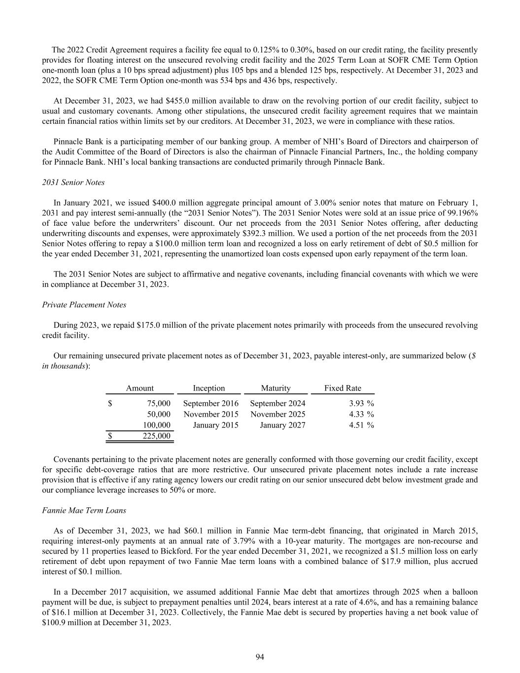 The 2022 Credit Agreement requires a facility fee equal to 0.125% to 0.30%, based on our credit rating, the facility presently provides for floating interest on the unsecured revolving credit facility and the 2025 Term Loan at SOFR CME Term Option one-month loan (plus a 10 bps spread adjustment) plus 105 bps and a blended 125 bps, respectively. At December 31, 2023 and 2022, the SOFR CME Term Option one-month was 534 bps and 436 bps, respectively. At December 31, 2023, we had $455.0 million available to draw on the revolving portion of our credit facility, subject to usual and customary covenants. Among other stipulations, the unsecured credit facility agreement requires that we maintain certain financial ratios within limits set by our creditors. At December 31, 2023, we were in compliance with these ratios. Pinnacle Bank is a participating member of our banking group. A member of NHI’s Board of Directors and chairperson of the Audit Committee of the Board of Directors is also the chairman of Pinnacle Financial Partners, Inc., the holding company for Pinnacle Bank. NHI’s local banking transactions are conducted primarily through Pinnacle Bank. 2031 Senior Notes In January 2021, we issued $400.0 million aggregate principal amount of 3.00% senior notes that mature on February 1, 2031 and pay interest semi-annually (the “2031 Senior Notes”). The 2031 Senior Notes were sold at an issue price of 99.196% of face value before the underwriters’ discount. Our net proceeds from the 2031 Senior Notes offering, after deducting underwriting discounts and expenses, were approximately $392.3 million. We used a portion of the net proceeds from the 2031 Senior Notes offering to repay a $100.0 million term loan and recognized a loss on early retirement of debt of $0.5 million for the year ended December 31, 2021, representing the unamortized loan costs expensed upon early repayment of the term loan. The 2031 Senior Notes are subject to affirmative and negative covenants, including financial covenants with which we were in compliance at December 31, 2023. Private Placement Notes During 2023, we repaid $175.0 million of the private placement notes primarily with proceeds from the unsecured revolving credit facility. Our remaining unsecured private placement notes as of December 31, 2023, payable interest-only, are summarized below ($ in thousands): Amount Inception Maturity Fixed Rate $ 75,000 September 2016 September 2024 3.93 % 50,000 November 2015 November 2025 4.33 % 100,000 January 2015 January 2027 4.51 % $ 225,000 Covenants pertaining to the private placement notes are generally conformed with those governing our credit facility, except for specific debt-coverage ratios that are more restrictive. Our unsecured private placement notes include a rate increase provision that is effective if any rating agency lowers our credit rating on our senior unsecured debt below investment grade and our compliance leverage increases to 50% or more. Fannie Mae Term Loans As of December 31, 2023, we had $60.1 million in Fannie Mae term-debt financing, that originated in March 2015, requiring interest-only payments at an annual rate of 3.79% with a 10-year maturity. The mortgages are non-recourse and secured by 11 properties leased to Bickford. For the year ended December 31, 2021, we recognized a $1.5 million loss on early retirement of debt upon repayment of two Fannie Mae term loans with a combined balance of $17.9 million, plus accrued interest of $0.1 million. In a December 2017 acquisition, we assumed additional Fannie Mae debt that amortizes through 2025 when a balloon payment will be due, is subject to prepayment penalties until 2024, bears interest at a rate of 4.6%, and has a remaining balance of $16.1 million at December 31, 2023. Collectively, the Fannie Mae debt is secured by properties having a net book value of $100.9 million at December 31, 2023. 94