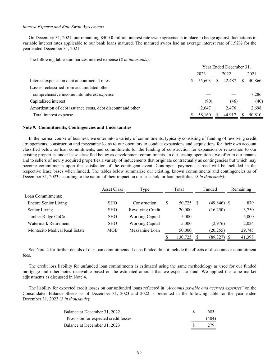 Interest Expense and Rate Swap Agreements On December 31, 2021, our remaining $400.0 million interest rate swap agreements in place to hedge against fluctuations in variable interest rates applicable to our bank loans matured. The matured swaps had an average interest rate of 1.92% for the year ended December 31, 2021. The following table summarizes interest expense ($ in thousands): Year Ended December 31, 2023 2022 2021 Interest expense on debt at contractual rates $ 55,603 $ 42,487 $ 40,866 Losses reclassified from accumulated other comprehensive income into interest expense — — 7,286 Capitalized interest (90) (46) (40) Amortization of debt issuance costs, debt discount and other 2,647 2,476 2,698 Total interest expense $ 58,160 $ 44,917 $ 50,810 Note 9. Commitments, Contingencies and Uncertainties In the normal course of business, we enter into a variety of commitments, typically consisting of funding of revolving credit arrangements, construction and mezzanine loans to our operators to conduct expansions and acquisitions for their own account classified below as loan commitments, and commitments for the funding of construction for expansion or renovation to our existing properties under lease classified below as development commitments. In our leasing operations, we offer to our tenants and to sellers of newly acquired properties a variety of inducements that originate contractually as contingencies but which may become commitments upon the satisfaction of the contingent event. Contingent payments earned will be included in the respective lease bases when funded. The tables below summarize our existing, known commitments and contingencies as of December 31, 2023 according to the nature of their impact on our leasehold or loan portfolios ($ in thousands): Asset Class Type Total Funded Remaining Loan Commitments: Encore Senior Living SHO Construction $ 50,725 $ (49,846) $ 879 Senior Living SHO Revolving Credit 20,000 (16,250) 3,750 Timber Ridge OpCo SHO Working Capital 5,000 — 5,000 Watermark Retirement SHO Working Capital 5,000 (2,976) 2,024 Montecito Medical Real Estate MOB Mezzanine Loan 50,000 (20,255) 29,745 $ 130,725 $ (89,327) $ 41,398 See Note 4 for further details of our loan commitments. Loans funded do not include the effects of discounts or commitment fees. The credit loss liability for unfunded loan commitments is estimated using the same methodology as used for our funded mortgage and other notes receivable based on the estimated amount that we expect to fund. We applied the same market adjustments as discussed in Note 4. The liability for expected credit losses on our unfunded loans reflected in “Accounts payable and accrued expenses” on the Consolidated Balance Sheets as of December 31, 2023 and 2022 is presented in the following table for the year ended December 31, 2023 ($ in thousands): Balance at December 31, 2022 $ 683 Provision for expected credit losses (404) Balance at December 31, 2023 $ 279 95