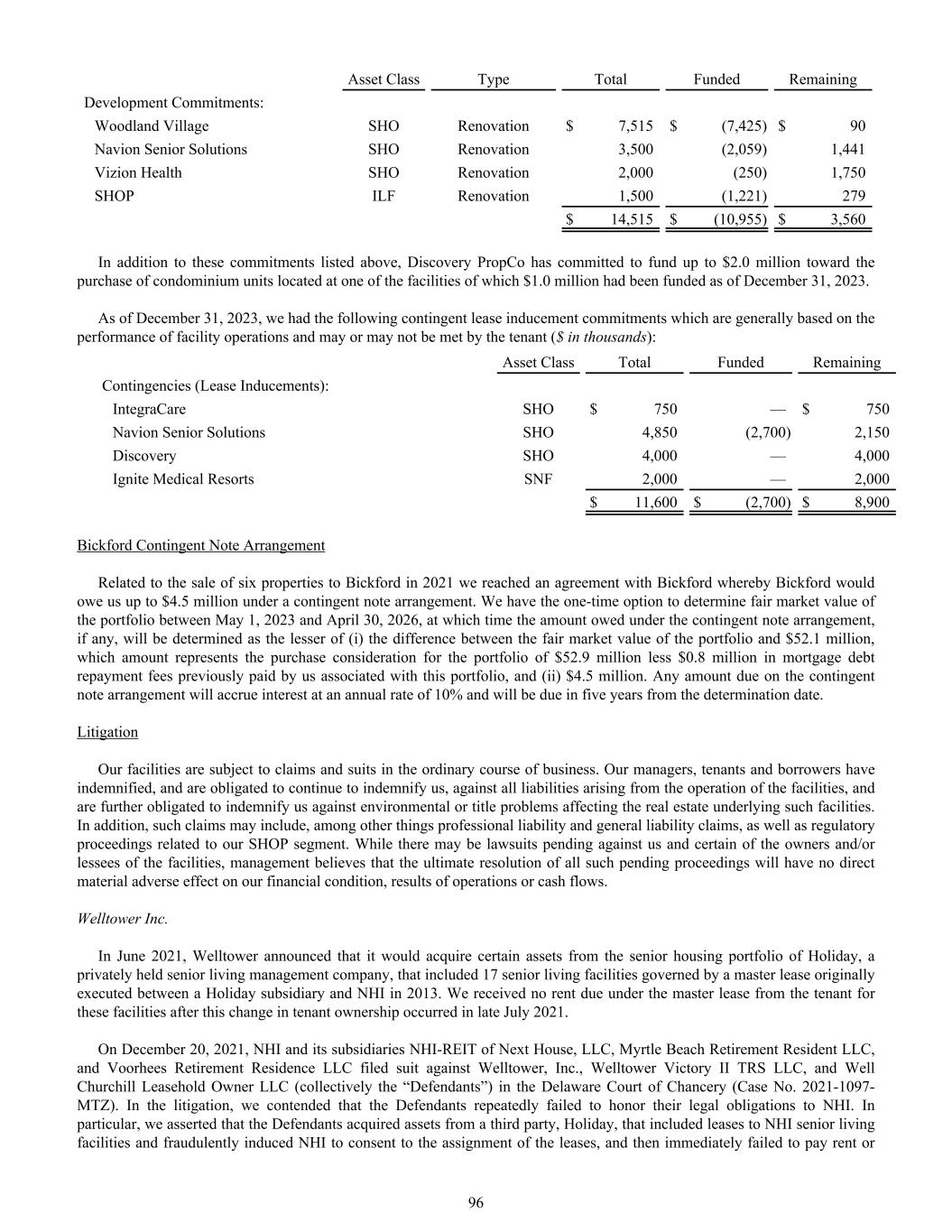 Asset Class Type Total Funded Remaining Development Commitments: Woodland Village SHO Renovation $ 7,515 $ (7,425) $ 90 Navion Senior Solutions SHO Renovation 3,500 (2,059) 1,441 Vizion Health SHO Renovation 2,000 (250) 1,750 SHOP ILF Renovation 1,500 (1,221) 279 $ 14,515 $ (10,955) $ 3,560 In addition to these commitments listed above, Discovery PropCo has committed to fund up to $2.0 million toward the purchase of condominium units located at one of the facilities of which $1.0 million had been funded as of December 31, 2023. As of December 31, 2023, we had the following contingent lease inducement commitments which are generally based on the performance of facility operations and may or may not be met by the tenant ($ in thousands): Asset Class Total Funded Remaining Contingencies (Lease Inducements): IntegraCare SHO $ 750 — $ 750 Navion Senior Solutions SHO 4,850 (2,700) 2,150 Discovery SHO 4,000 — 4,000 Ignite Medical Resorts SNF 2,000 — 2,000 $ 11,600 $ (2,700) $ 8,900 Bickford Contingent Note Arrangement Related to the sale of six properties to Bickford in 2021 we reached an agreement with Bickford whereby Bickford would owe us up to $4.5 million under a contingent note arrangement. We have the one-time option to determine fair market value of the portfolio between May 1, 2023 and April 30, 2026, at which time the amount owed under the contingent note arrangement, if any, will be determined as the lesser of (i) the difference between the fair market value of the portfolio and $52.1 million, which amount represents the purchase consideration for the portfolio of $52.9 million less $0.8 million in mortgage debt repayment fees previously paid by us associated with this portfolio, and (ii) $4.5 million. Any amount due on the contingent note arrangement will accrue interest at an annual rate of 10% and will be due in five years from the determination date. Litigation Our facilities are subject to claims and suits in the ordinary course of business. Our managers, tenants and borrowers have indemnified, and are obligated to continue to indemnify us, against all liabilities arising from the operation of the facilities, and are further obligated to indemnify us against environmental or title problems affecting the real estate underlying such facilities. In addition, such claims may include, among other things professional liability and general liability claims, as well as regulatory proceedings related to our SHOP segment. While there may be lawsuits pending against us and certain of the owners and/or lessees of the facilities, management believes that the ultimate resolution of all such pending proceedings will have no direct material adverse effect on our financial condition, results of operations or cash flows. Welltower Inc. In June 2021, Welltower announced that it would acquire certain assets from the senior housing portfolio of Holiday, a privately held senior living management company, that included 17 senior living facilities governed by a master lease originally executed between a Holiday subsidiary and NHI in 2013. We received no rent due under the master lease from the tenant for these facilities after this change in tenant ownership occurred in late July 2021. On December 20, 2021, NHI and its subsidiaries NHI-REIT of Next House, LLC, Myrtle Beach Retirement Resident LLC, and Voorhees Retirement Residence LLC filed suit against Welltower, Inc., Welltower Victory II TRS LLC, and Well Churchill Leasehold Owner LLC (collectively the “Defendants”) in the Delaware Court of Chancery (Case No. 2021-1097- MTZ). In the litigation, we contended that the Defendants repeatedly failed to honor their legal obligations to NHI. In particular, we asserted that the Defendants acquired assets from a third party, Holiday, that included leases to NHI senior living facilities and fraudulently induced NHI to consent to the assignment of the leases, and then immediately failed to pay rent or 96
