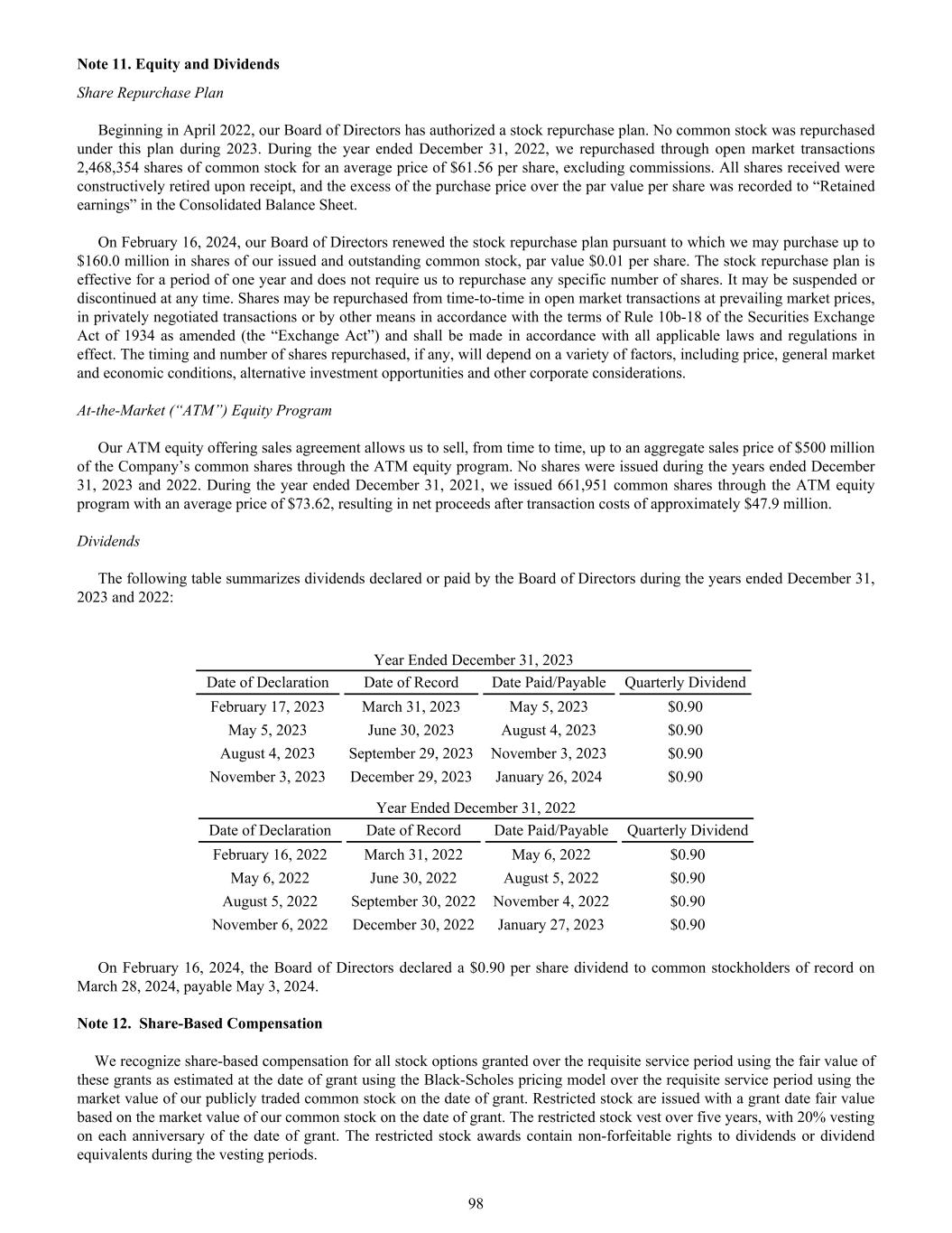 Share Repurchase Plan Beginning in April 2022, our Board of Directors has authorized a stock repurchase plan. No common stock was repurchased under this plan during 2023. During the year ended December 31, 2022, we repurchased through open market transactions 2,468,354 shares of common stock for an average price of $61.56 per share, excluding commissions. All shares received were constructively retired upon receipt, and the excess of the purchase price over the par value per share was recorded to “Retained earnings” in the Consolidated Balance Sheet. On February 16, 2024, our Board of Directors renewed the stock repurchase plan pursuant to which we may purchase up to $160.0 million in shares of our issued and outstanding common stock, par value $0.01 per share. The stock repurchase plan is effective for a period of one year and does not require us to repurchase any specific number of shares. It may be suspended or discontinued at any time. Shares may be repurchased from time-to-time in open market transactions at prevailing market prices, in privately negotiated transactions or by other means in accordance with the terms of Rule 10b-18 of the Securities Exchange Act of 1934 as amended (the “Exchange Act”) and shall be made in accordance with all applicable laws and regulations in effect. The timing and number of shares repurchased, if any, will depend on a variety of factors, including price, general market and economic conditions, alternative investment opportunities and other corporate considerations. At-the-Market (“ATM”) Equity Program Our ATM equity offering sales agreement allows us to sell, from time to time, up to an aggregate sales price of $500 million of the Company’s common shares through the ATM equity program. No shares were issued during the years ended December 31, 2023 and 2022. During the year ended December 31, 2021, we issued 661,951 common shares through the ATM equity program with an average price of $73.62, resulting in net proceeds after transaction costs of approximately $47.9 million. Dividends The following table summarizes dividends declared or paid by the Board of Directors during the years ended December 31, 2023 and 2022: Year Ended December 31, 2023 Date of Declaration Date of Record Date Paid/Payable Quarterly Dividend February 17, 2023 March 31, 2023 May 5, 2023 $0.90 May 5, 2023 June 30, 2023 August 4, 2023 $0.90 August 4, 2023 September 29, 2023 November 3, 2023 $0.90 November 3, 2023 December 29, 2023 January 26, 2024 $0.90 Year Ended December 31, 2022 Date of Declaration Date of Record Date Paid/Payable Quarterly Dividend February 16, 2022 March 31, 2022 May 6, 2022 $0.90 May 6, 2022 June 30, 2022 August 5, 2022 $0.90 August 5, 2022 September 30, 2022 November 4, 2022 $0.90 November 6, 2022 December 30, 2022 January 27, 2023 $0.90 On February 16, 2024, the Board of Directors declared a $0.90 per share dividend to common stockholders of record on March 28, 2024, payable May 3, 2024. Note 12. Share-Based Compensation We recognize share-based compensation for all stock options granted over the requisite service period using the fair value of these grants as estimated at the date of grant using the Black-Scholes pricing model over the requisite service period using the market value of our publicly traded common stock on the date of grant. Restricted stock are issued with a grant date fair value based on the market value of our common stock on the date of grant. The restricted stock vest over five years, with 20% vesting on each anniversary of the date of grant. The restricted stock awards contain non-forfeitable rights to dividends or dividend equivalents during the vesting periods. 98 Note 11. Equity and Dividends