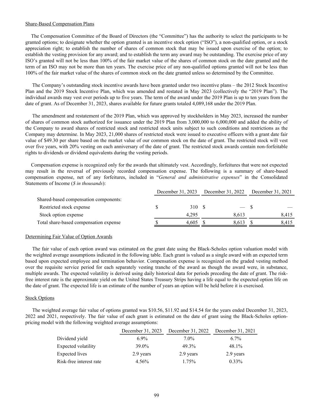Share-Based Compensation Plans The Compensation Committee of the Board of Directors (the “Committee”) has the authority to select the participants to be granted options; to designate whether the option granted is an incentive stock option (“ISO”), a non-qualified option, or a stock appreciation right; to establish the number of shares of common stock that may be issued upon exercise of the option; to establish the vesting provision for any award; and to establish the term any award may be outstanding. The exercise price of any ISO’s granted will not be less than 100% of the fair market value of the shares of common stock on the date granted and the term of an ISO may not be more than ten years. The exercise price of any non-qualified options granted will not be less than 100% of the fair market value of the shares of common stock on the date granted unless so determined by the Committee. The Company’s outstanding stock incentive awards have been granted under two incentive plans – the 2012 Stock Incentive Plan and the 2019 Stock Incentive Plan, which was amended and restated in May 2023 (collectively the “2019 Plan”). The individual awards may vest over periods up to five years. The term of the award under the 2019 Plan is up to ten years from the date of grant. As of December 31, 2023, shares available for future grants totaled 4,089,168 under the 2019 Plan. The amendment and restatement of the 2019 Plan, which was approved by stockholders in May 2023, increased the number of shares of common stock authorized for issuance under the 2019 Plan from 3,000,000 to 6,000,000 and added the ability of the Company to award shares of restricted stock and restricted stock units subject to such conditions and restrictions as the Company may determine. In May 2023, 21,000 shares of restricted stock were issued to executive officers with a grant date fair value of $49.30 per share based on the market value of our common stock on the date of grant. The restricted stock will vest over five years, with 20% vesting on each anniversary of the date of grant. The restricted stock awards contain non-forfeitable rights to dividends or dividend equivalents during the vesting periods. Compensation expense is recognized only for the awards that ultimately vest. Accordingly, forfeitures that were not expected may result in the reversal of previously recorded compensation expense. The following is a summary of share-based compensation expense, net of any forfeitures, included in “General and administrative expenses” in the Consolidated Statements of Income ($ in thousands): December 31, 2023 December 31, 2022 December 31, 2021 Shared-based compensation components: Restricted stock expense $ 310 $ — $ — Stock option expense 4,295 8,613 8,415 Total share-based compensation expense $ 4,605 $ 8,613 $ 8,415 Determining Fair Value of Option Awards The fair value of each option award was estimated on the grant date using the Black-Scholes option valuation model with the weighted average assumptions indicated in the following table. Each grant is valued as a single award with an expected term based upon expected employee and termination behavior. Compensation expense is recognized on the graded vesting method over the requisite service period for each separately vesting tranche of the award as though the award were, in substance, multiple awards. The expected volatility is derived using daily historical data for periods preceding the date of grant. The risk- free interest rate is the approximate yield on the United States Treasury Strips having a life equal to the expected option life on the date of grant. The expected life is an estimate of the number of years an option will be held before it is exercised. Stock Options The weighted average fair value of options granted was $10.56, $11.92 and $14.54 for the years ended December 31, 2023, 2022 and 2021, respectively. The fair value of each grant is estimated on the date of grant using the Black-Scholes option- pricing model with the following weighted average assumptions: December 31, 2023 December 31, 2022 December 31, 2021 Dividend yield 6.9% 7.0% 6.7% Expected volatility 39.0% 49.3% 48.1% Expected lives 2.9 years 2.9 years 2.9 years Risk-free interest rate 4.56% 1.75% 0.33% 99