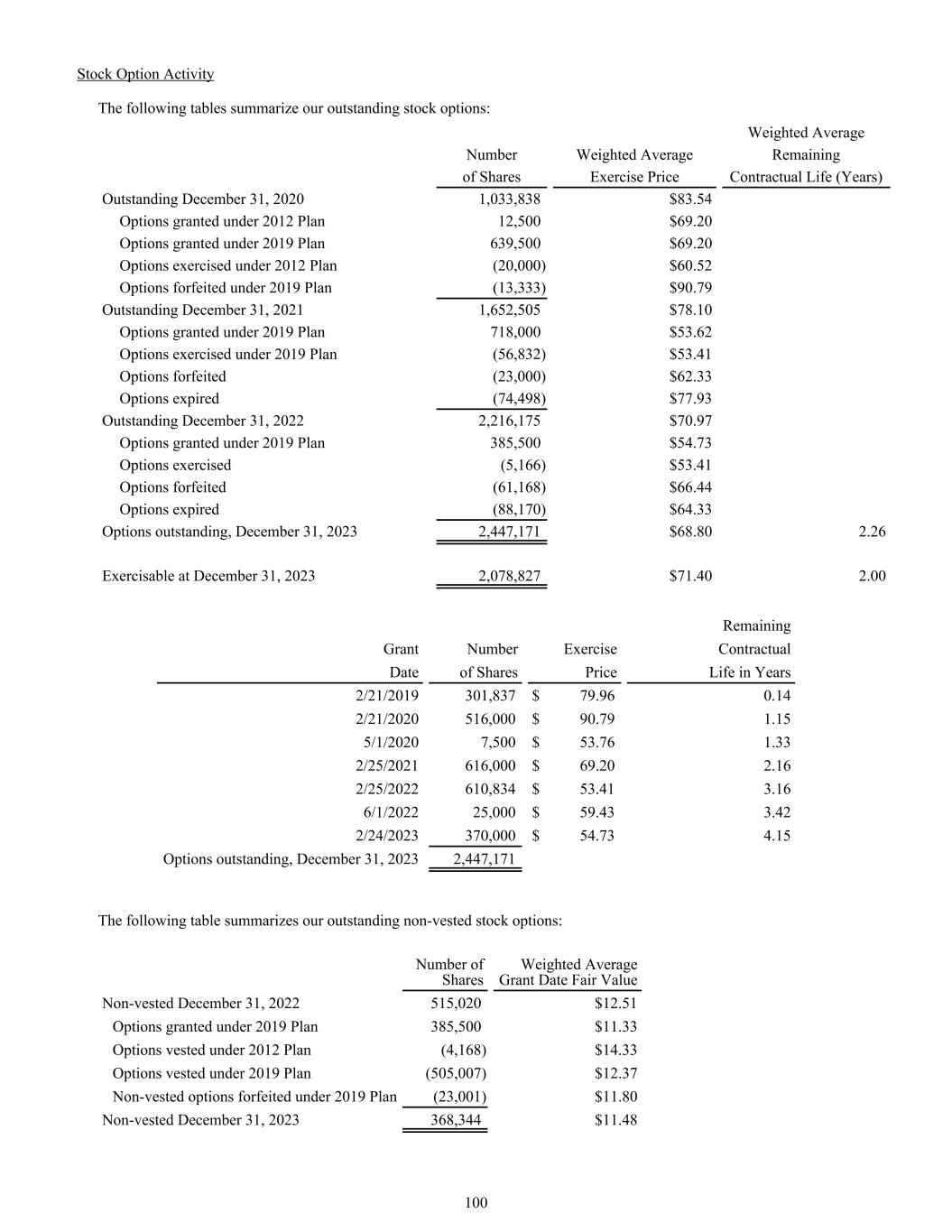 The following tables summarize our outstanding stock options: Weighted Average Number Weighted Average Remaining of Shares Exercise Price Contractual Life (Years) Outstanding December 31, 2020 1,033,838 $83.54 Options granted under 2012 Plan 12,500 $69.20 Options granted under 2019 Plan 639,500 $69.20 Options exercised under 2012 Plan (20,000) $60.52 Options forfeited under 2019 Plan (13,333) $90.79 Outstanding December 31, 2021 1,652,505 $78.10 Options granted under 2019 Plan 718,000 $53.62 Options exercised under 2019 Plan (56,832) $53.41 Options forfeited (23,000) $62.33 Options expired (74,498) $77.93 Outstanding December 31, 2022 2,216,175 $70.97 Options granted under 2019 Plan 385,500 $54.73 Options exercised (5,166) $53.41 Options forfeited (61,168) $66.44 Options expired (88,170) $64.33 Options outstanding, December 31, 2023 2,447,171 $68.80 2.26 Exercisable at December 31, 2023 2,078,827 $71.40 2.00 Remaining Grant Number Exercise Contractual Date of Shares Price Life in Years 2/21/2019 301,837 $ 79.96 0.14 2/21/2020 516,000 $ 90.79 1.15 5/1/2020 7,500 $ 53.76 1.33 2/25/2021 616,000 $ 69.20 2.16 2/25/2022 610,834 $ 53.41 3.16 6/1/2022 25,000 $ 59.43 3.42 2/24/2023 370,000 $ 54.73 4.15 Options outstanding, December 31, 2023 2,447,171 The following table summarizes our outstanding non-vested stock options: Number of Shares Weighted Average Grant Date Fair Value Non-vested December 31, 2022 515,020 $12.51 Options granted under 2019 Plan 385,500 $11.33 Options vested under 2012 Plan (4,168) $14.33 Options vested under 2019 Plan (505,007) $12.37 Non-vested options forfeited under 2019 Plan (23,001) $11.80 Non-vested December 31, 2023 368,344 $11.48 100 Stock Option Activity