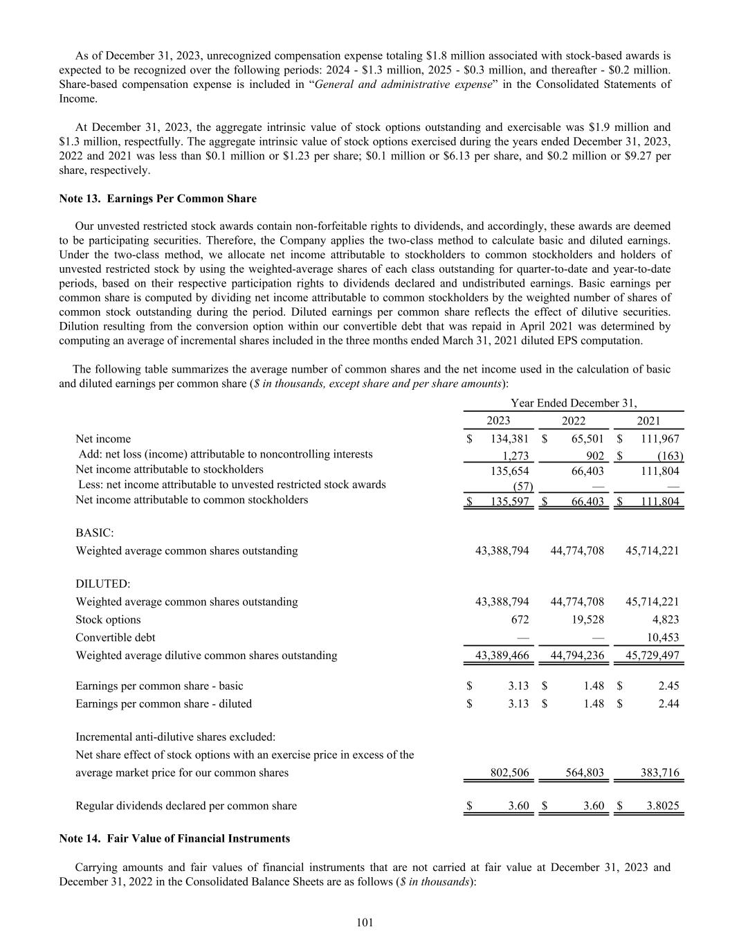 As of December 31, 2023, unrecognized compensation expense totaling $1.8 million associated with stock-based awards is expected to be recognized over the following periods: 2024 - $1.3 million, 2025 - $0.3 million, and thereafter - $0.2 million. Share-based compensation expense is included in “General and administrative expense” in the Consolidated Statements of Income. At December 31, 2023, the aggregate intrinsic value of stock options outstanding and exercisable was $1.9 million and $1.3 million, respectfully. The aggregate intrinsic value of stock options exercised during the years ended December 31, 2023, 2022 and 2021 was less than $0.1 million or $1.23 per share; $0.1 million or $6.13 per share, and $0.2 million or $9.27 per share, respectively. Note 13. Earnings Per Common Share Our unvested restricted stock awards contain non-forfeitable rights to dividends, and accordingly, these awards are deemed to be participating securities. Therefore, the Company applies the two-class method to calculate basic and diluted earnings. Under the two-class method, we allocate net income attributable to stockholders to common stockholders and holders of unvested restricted stock by using the weighted-average shares of each class outstanding for quarter-to-date and year-to-date periods, based on their respective participation rights to dividends declared and undistributed earnings. Basic earnings per common share is computed by dividing net income attributable to common stockholders by the weighted number of shares of common stock outstanding during the period. Diluted earnings per common share reflects the effect of dilutive securities. Dilution resulting from the conversion option within our convertible debt that was repaid in April 2021 was determined by computing an average of incremental shares included in the three months ended March 31, 2021 diluted EPS computation. The following table summarizes the average number of common shares and the net income used in the calculation of basic and diluted earnings per common share ($ in thousands, except share and per share amounts): Year Ended December 31, 2023 2022 2021 Net income $ 134,381 $ 65,501 $ 111,967 Add: net loss (income) attributable to noncontrolling interests 1,273 902 $ (163) Net income attributable to stockholders 135,654 66,403 111,804 Less: net income attributable to unvested restricted stock awards (57) — — Net income attributable to common stockholders $ 135,597 $ 66,403 $ 111,804 BASIC: Weighted average common shares outstanding 43,388,794 44,774,708 45,714,221 DILUTED: Weighted average common shares outstanding 43,388,794 44,774,708 45,714,221 Stock options 672 19,528 4,823 Convertible debt — — 10,453 Weighted average dilutive common shares outstanding 43,389,466 44,794,236 45,729,497 Earnings per common share - basic $ 3.13 $ 1.48 $ 2.45 Earnings per common share - diluted $ 3.13 $ 1.48 $ 2.44 Incremental anti-dilutive shares excluded: Net share effect of stock options with an exercise price in excess of the average market price for our common shares 802,506 564,803 383,716 Regular dividends declared per common share $ 3.60 $ 3.60 $ 3.8025 Note 14. Fair Value of Financial Instruments Carrying amounts and fair values of financial instruments that are not carried at fair value at December 31, 2023 and December 31, 2022 in the Consolidated Balance Sheets are as follows ($ in thousands): 101
