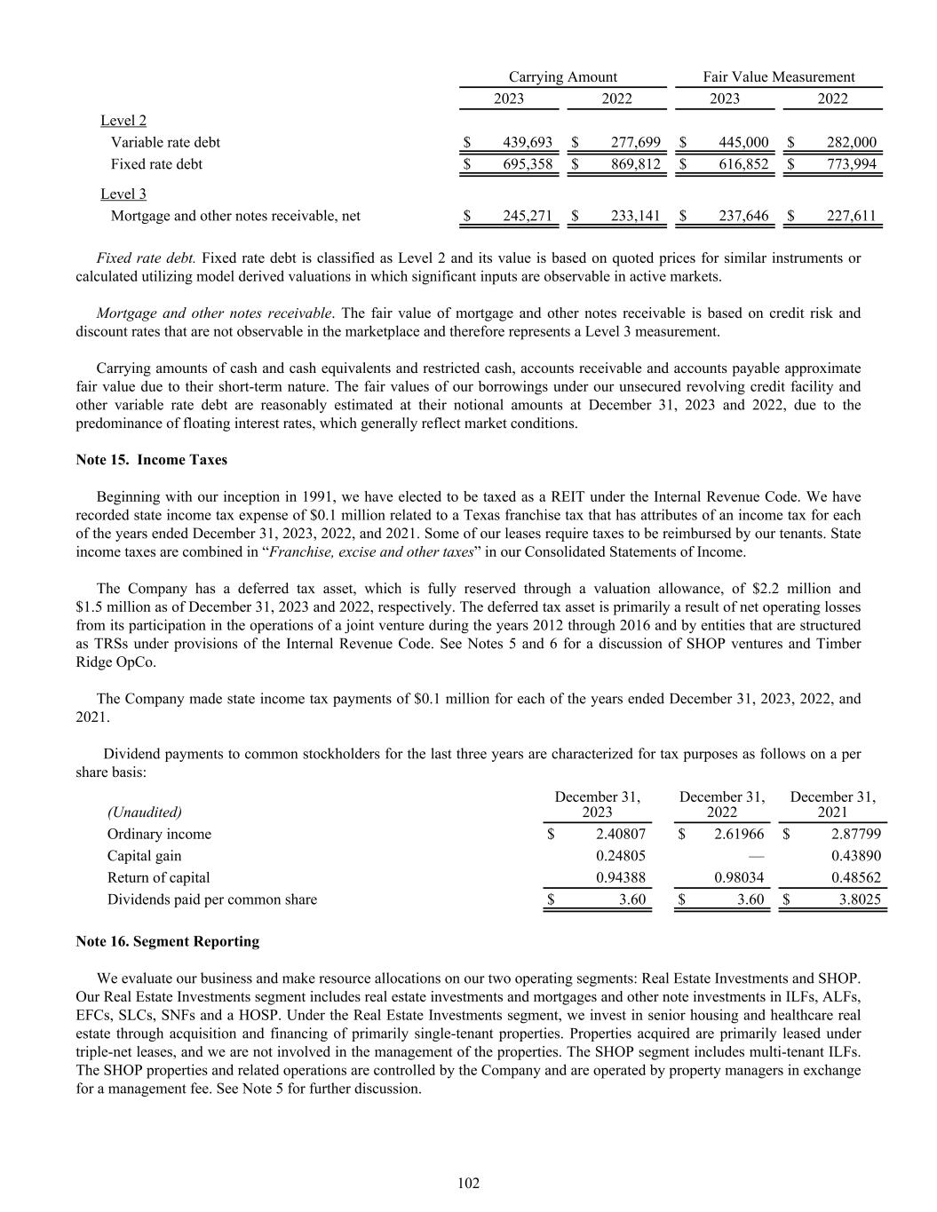 Carrying Amount Fair Value Measurement 2023 2022 2023 2022 Level 2 Variable rate debt $ 439,693 $ 277,699 $ 445,000 $ 282,000 Fixed rate debt $ 695,358 $ 869,812 $ 616,852 $ 773,994 Level 3 Mortgage and other notes receivable, net $ 245,271 $ 233,141 $ 237,646 $ 227,611 Fixed rate debt. Fixed rate debt is classified as Level 2 and its value is based on quoted prices for similar instruments or calculated utilizing model derived valuations in which significant inputs are observable in active markets. Mortgage and other notes receivable. The fair value of mortgage and other notes receivable is based on credit risk and discount rates that are not observable in the marketplace and therefore represents a Level 3 measurement. Carrying amounts of cash and cash equivalents and restricted cash, accounts receivable and accounts payable approximate fair value due to their short-term nature. The fair values of our borrowings under our unsecured revolving credit facility and other variable rate debt are reasonably estimated at their notional amounts at December 31, 2023 and 2022, due to the predominance of floating interest rates, which generally reflect market conditions. Note 15. Income Taxes Beginning with our inception in 1991, we have elected to be taxed as a REIT under the Internal Revenue Code. We have recorded state income tax expense of $0.1 million related to a Texas franchise tax that has attributes of an income tax for each of the years ended December 31, 2023, 2022, and 2021. Some of our leases require taxes to be reimbursed by our tenants. State income taxes are combined in “Franchise, excise and other taxes” in our Consolidated Statements of Income. The Company has a deferred tax asset, which is fully reserved through a valuation allowance, of $2.2 million and $1.5 million as of December 31, 2023 and 2022, respectively. The deferred tax asset is primarily a result of net operating losses from its participation in the operations of a joint venture during the years 2012 through 2016 and by entities that are structured as TRSs under provisions of the Internal Revenue Code. See Notes 5 and 6 for a discussion of SHOP ventures and Timber Ridge OpCo. The Company made state income tax payments of $0.1 million for each of the years ended December 31, 2023, 2022, and 2021. Dividend payments to common stockholders for the last three years are characterized for tax purposes as follows on a per share basis: (Unaudited) December 31, 2023 December 31, 2022 December 31, 2021 Ordinary income $ 2.40807 $ 2.61966 $ 2.87799 Capital gain 0.24805 — 0.43890 Return of capital 0.94388 0.98034 0.48562 Dividends paid per common share $ 3.60 $ 3.60 $ 3.8025 Note 16. Segment Reporting We evaluate our business and make resource allocations on our two operating segments: Real Estate Investments and SHOP. Our Real Estate Investments segment includes real estate investments and mortgages and other note investments in ILFs, ALFs, EFCs, SLCs, SNFs and a HOSP. Under the Real Estate Investments segment, we invest in senior housing and healthcare real estate through acquisition and financing of primarily single-tenant properties. Properties acquired are primarily leased under triple-net leases, and we are not involved in the management of the properties. The SHOP segment includes multi-tenant ILFs. The SHOP properties and related operations are controlled by the Company and are operated by property managers in exchange for a management fee. See Note 5 for further discussion. 102