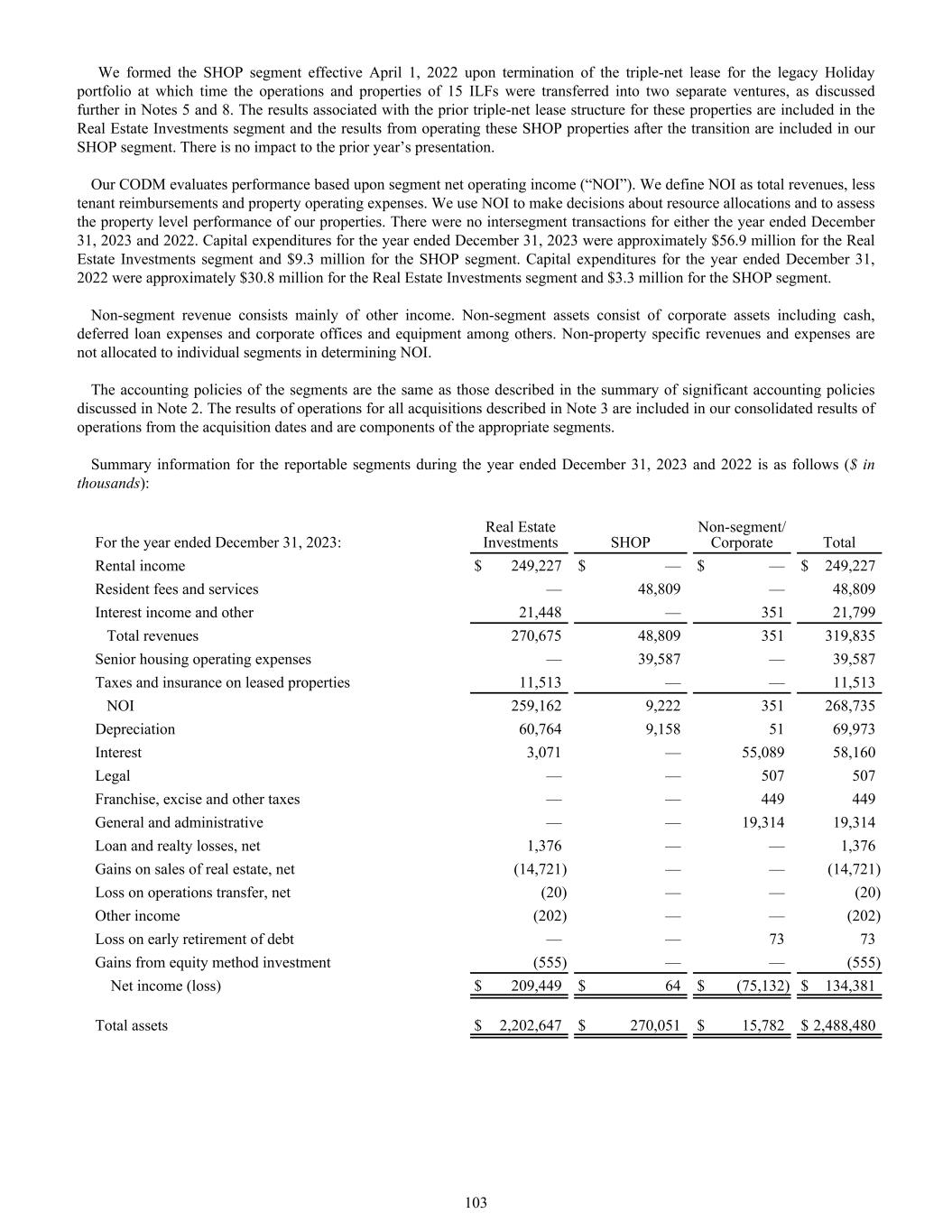 We formed the SHOP segment effective April 1, 2022 upon termination of the triple-net lease for the legacy Holiday portfolio at which time the operations and properties of 15 ILFs were transferred into two separate ventures, as discussed further in Notes 5 and 8. The results associated with the prior triple-net lease structure for these properties are included in the Real Estate Investments segment and the results from operating these SHOP properties after the transition are included in our SHOP segment. There is no impact to the prior year’s presentation. Our CODM evaluates performance based upon segment net operating income (“NOI”). We define NOI as total revenues, less tenant reimbursements and property operating expenses. We use NOI to make decisions about resource allocations and to assess the property level performance of our properties. There were no intersegment transactions for either the year ended December 31, 2023 and 2022. Capital expenditures for the year ended December 31, 2023 were approximately $56.9 million for the Real Estate Investments segment and $9.3 million for the SHOP segment. Capital expenditures for the year ended December 31, 2022 were approximately $30.8 million for the Real Estate Investments segment and $3.3 million for the SHOP segment. Non-segment revenue consists mainly of other income. Non-segment assets consist of corporate assets including cash, deferred loan expenses and corporate offices and equipment among others. Non-property specific revenues and expenses are not allocated to individual segments in determining NOI. The accounting policies of the segments are the same as those described in the summary of significant accounting policies discussed in Note 2. The results of operations for all acquisitions described in Note 3 are included in our consolidated results of operations from the acquisition dates and are components of the appropriate segments. Summary information for the reportable segments during the year ended December 31, 2023 and 2022 is as follows ($ in thousands): For the year ended December 31, 2023: Real Estate Investments SHOP Non-segment/ Corporate Total Rental income $ 249,227 $ — $ — $ 249,227 Resident fees and services — 48,809 — 48,809 Interest income and other 21,448 — 351 21,799 Total revenues 270,675 48,809 351 319,835 Senior housing operating expenses — 39,587 — 39,587 Taxes and insurance on leased properties 11,513 — — 11,513 NOI 259,162 9,222 351 268,735 Depreciation 60,764 9,158 51 69,973 Interest 3,071 — 55,089 58,160 Legal — — 507 507 Franchise, excise and other taxes — — 449 449 General and administrative — — 19,314 19,314 Loan and realty losses, net 1,376 — — 1,376 Gains on sales of real estate, net (14,721) — — (14,721) Loss on operations transfer, net (20) — — (20) Other income (202) — — (202) Loss on early retirement of debt — — 73 73 Gains from equity method investment (555) — — (555) Net income (loss) $ 209,449 $ 64 $ (75,132) $ 134,381 Total assets $ 2,202,647 $ 270,051 $ 15,782 $ 2,488,480 103