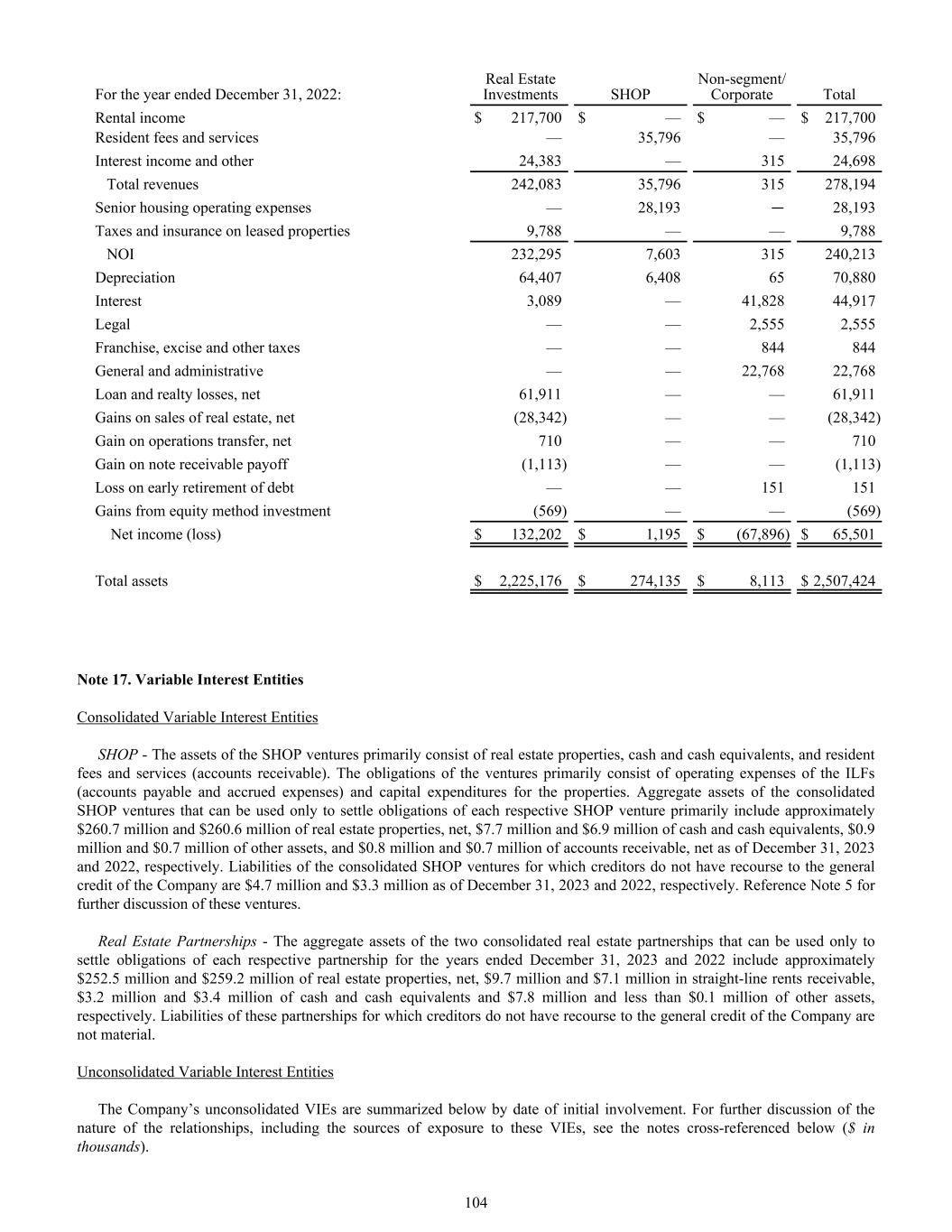 For the year ended December 31, 2022: Real Estate Investments SHOP Non-segment/ Corporate Total Rental income $ 217,700 $ — $ — $ 217,700 Resident fees and services — 35,796 — 35,796 Interest income and other 24,383 — 315 24,698 Total revenues 242,083 35,796 315 278,194 Senior housing operating expenses — 28,193 — 28,193 Taxes and insurance on leased properties 9,788 — — 9,788 NOI 232,295 7,603 315 240,213 Depreciation 64,407 6,408 65 70,880 Interest 3,089 — 41,828 44,917 Legal — — 2,555 2,555 Franchise, excise and other taxes — — 844 844 General and administrative — — 22,768 22,768 Loan and realty losses, net 61,911 — — 61,911 Gains on sales of real estate, net (28,342) — — (28,342) Gain on operations transfer, net 710 — — 710 Gain on note receivable payoff (1,113) — — (1,113) Loss on early retirement of debt — — 151 151 Gains from equity method investment (569) — — (569) Net income (loss) $ 132,202 $ 1,195 $ (67,896) $ 65,501 Total assets $ 2,225,176 $ 274,135 $ 8,113 $ 2,507,424 Note 17. Variable Interest Entities Consolidated Variable Interest Entities SHOP - The assets of the SHOP ventures primarily consist of real estate properties, cash and cash equivalents, and resident fees and services (accounts receivable). The obligations of the ventures primarily consist of operating expenses of the ILFs (accounts payable and accrued expenses) and capital expenditures for the properties. Aggregate assets of the consolidated SHOP ventures that can be used only to settle obligations of each respective SHOP venture primarily include approximately $260.7 million and $260.6 million of real estate properties, net, $7.7 million and $6.9 million of cash and cash equivalents, $0.9 million and $0.7 million of other assets, and $0.8 million and $0.7 million of accounts receivable, net as of December 31, 2023 and 2022, respectively. Liabilities of the consolidated SHOP ventures for which creditors do not have recourse to the general credit of the Company are $4.7 million and $3.3 million as of December 31, 2023 and 2022, respectively. Reference Note 5 for further discussion of these ventures. Real Estate Partnerships - The aggregate assets of the two consolidated real estate partnerships that can be used only to settle obligations of each respective partnership for the years ended December 31, 2023 and 2022 include approximately $252.5 million and $259.2 million of real estate properties, net, $9.7 million and $7.1 million in straight-line rents receivable, $3.2 million and $3.4 million of cash and cash equivalents and $7.8 million and less than $0.1 million of other assets, respectively. Liabilities of these partnerships for which creditors do not have recourse to the general credit of the Company are not material. Unconsolidated Variable Interest Entities The Company’s unconsolidated VIEs are summarized below by date of initial involvement. For further discussion of the nature of the relationships, including the sources of exposure to these VIEs, see the notes cross-referenced below ($ in thousands). 104