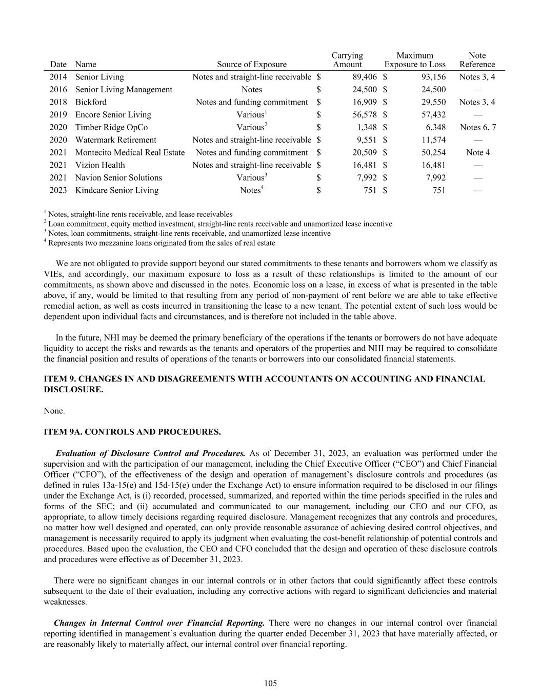 Date Name Source of Exposure Carrying Amount Maximum Exposure to Loss Note Reference 2014 Senior Living Notes and straight-line receivable $ 89,406 $ 93,156 Notes 3, 4 2016 Senior Living Management Notes $ 24,500 $ 24,500 — 2018 Bickford Notes and funding commitment $ 16,909 $ 29,550 Notes 3, 4 2019 Encore Senior Living Various1 $ 56,578 $ 57,432 — 2020 Timber Ridge OpCo Various2 $ 1,348 $ 6,348 Notes 6, 7 2020 Watermark Retirement Notes and straight-line receivable $ 9,551 $ 11,574 — 2021 Montecito Medical Real Estate Notes and funding commitment $ 20,509 $ 50,254 Note 4 2021 Vizion Health Notes and straight-line receivable $ 16,481 $ 16,481 — 2021 Navion Senior Solutions Various3 $ 7,992 $ 7,992 — 2023 Kindcare Senior Living Notes4 $ 751 $ 751 — 1 Notes, straight-line rents receivable, and lease receivables 2 Loan commitment, equity method investment, straight-line rents receivable and unamortized lease incentive 3 Notes, loan commitments, straight-line rents receivable, and unamortized lease incentive 4 Represents two mezzanine loans originated from the sales of real estate We are not obligated to provide support beyond our stated commitments to these tenants and borrowers whom we classify as VIEs, and accordingly, our maximum exposure to loss as a result of these relationships is limited to the amount of our commitments, as shown above and discussed in the notes. Economic loss on a lease, in excess of what is presented in the table above, if any, would be limited to that resulting from any period of non-payment of rent before we are able to take effective remedial action, as well as costs incurred in transitioning the lease to a new tenant. The potential extent of such loss would be dependent upon individual facts and circumstances, and is therefore not included in the table above. In the future, NHI may be deemed the primary beneficiary of the operations if the tenants or borrowers do not have adequate liquidity to accept the risks and rewards as the tenants and operators of the properties and NHI may be required to consolidate the financial position and results of operations of the tenants or borrowers into our consolidated financial statements. ITEM 9. CHANGES IN AND DISAGREEMENTS WITH ACCOUNTANTS ON ACCOUNTING AND FINANCIAL DISCLOSURE. None. ITEM 9A. CONTROLS AND PROCEDURES. Evaluation of Disclosure Control and Procedures. As of December 31, 2023, an evaluation was performed under the supervision and with the participation of our management, including the Chief Executive Officer (“CEO”) and Chief Financial Officer (“CFO”), of the effectiveness of the design and operation of management’s disclosure controls and procedures (as defined in rules 13a-15(e) and 15d-15(e) under the Exchange Act) to ensure information required to be disclosed in our filings under the Exchange Act, is (i) recorded, processed, summarized, and reported within the time periods specified in the rules and forms of the SEC; and (ii) accumulated and communicated to our management, including our CEO and our CFO, as appropriate, to allow timely decisions regarding required disclosure. Management recognizes that any controls and procedures, no matter how well designed and operated, can only provide reasonable assurance of achieving desired control objectives, and management is necessarily required to apply its judgment when evaluating the cost-benefit relationship of potential controls and procedures. Based upon the evaluation, the CEO and CFO concluded that the design and operation of these disclosure controls and procedures were effective as of December 31, 2023. There were no significant changes in our internal controls or in other factors that could significantly affect these controls subsequent to the date of their evaluation, including any corrective actions with regard to significant deficiencies and material weaknesses. Changes in Internal Control over Financial Reporting. There were no changes in our internal control over financial reporting identified in management’s evaluation during the quarter ended December 31, 2023 that have materially affected, or are reasonably likely to materially affect, our internal control over financial reporting. 105