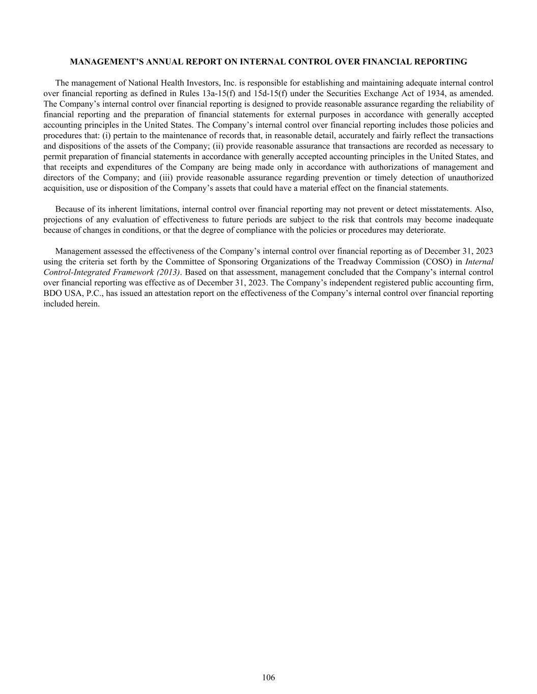 MANAGEMENT’S ANNUAL REPORT ON INTERNAL CONTROL OVER FINANCIAL REPORTING The management of National Health Investors, Inc. is responsible for establishing and maintaining adequate internal control over financial reporting as defined in Rules 13a-15(f) and 15d-15(f) under the Securities Exchange Act of 1934, as amended. The Company’s internal control over financial reporting is designed to provide reasonable assurance regarding the reliability of financial reporting and the preparation of financial statements for external purposes in accordance with generally accepted accounting principles in the United States. The Company’s internal control over financial reporting includes those policies and procedures that: (i) pertain to the maintenance of records that, in reasonable detail, accurately and fairly reflect the transactions and dispositions of the assets of the Company; (ii) provide reasonable assurance that transactions are recorded as necessary to permit preparation of financial statements in accordance with generally accepted accounting principles in the United States, and that receipts and expenditures of the Company are being made only in accordance with authorizations of management and directors of the Company; and (iii) provide reasonable assurance regarding prevention or timely detection of unauthorized acquisition, use or disposition of the Company’s assets that could have a material effect on the financial statements. Because of its inherent limitations, internal control over financial reporting may not prevent or detect misstatements. Also, projections of any evaluation of effectiveness to future periods are subject to the risk that controls may become inadequate because of changes in conditions, or that the degree of compliance with the policies or procedures may deteriorate. Management assessed the effectiveness of the Company’s internal control over financial reporting as of December 31, 2023 using the criteria set forth by the Committee of Sponsoring Organizations of the Treadway Commission (COSO) in Internal Control-Integrated Framework (2013). Based on that assessment, management concluded that the Company’s internal control over financial reporting was effective as of December 31, 2023. The Company’s independent registered public accounting firm, BDO USA, P.C., has issued an attestation report on the effectiveness of the Company’s internal control over financial reporting included herein. 106