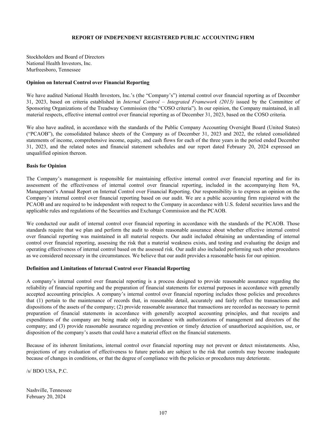REPORT OF INDEPENDENT REGISTERED PUBLIC ACCOUNTING FIRM Stockholders and Board of Directors National Health Investors, Inc. Murfreesboro, Tennessee Opinion on Internal Control over Financial Reporting We have audited National Health Investors, Inc.’s (the “Company’s”) internal control over financial reporting as of December 31, 2023, based on criteria established in Internal Control – Integrated Framework (2013) issued by the Committee of Sponsoring Organizations of the Treadway Commission (the “COSO criteria”). In our opinion, the Company maintained, in all material respects, effective internal control over financial reporting as of December 31, 2023, based on the COSO criteria. We also have audited, in accordance with the standards of the Public Company Accounting Oversight Board (United States) (“PCAOB”), the consolidated balance sheets of the Company as of December 31, 2023 and 2022, the related consolidated statements of income, comprehensive income, equity, and cash flows for each of the three years in the period ended December 31, 2023, and the related notes and financial statement schedules and our report dated February 20, 2024 expressed an unqualified opinion thereon. Basis for Opinion The Company’s management is responsible for maintaining effective internal control over financial reporting and for its assessment of the effectiveness of internal control over financial reporting, included in the accompanying Item 9A, Management’s Annual Report on Internal Control over Financial Reporting. Our responsibility is to express an opinion on the Company’s internal control over financial reporting based on our audit. We are a public accounting firm registered with the PCAOB and are required to be independent with respect to the Company in accordance with U.S. federal securities laws and the applicable rules and regulations of the Securities and Exchange Commission and the PCAOB. We conducted our audit of internal control over financial reporting in accordance with the standards of the PCAOB. Those standards require that we plan and perform the audit to obtain reasonable assurance about whether effective internal control over financial reporting was maintained in all material respects. Our audit included obtaining an understanding of internal control over financial reporting, assessing the risk that a material weakness exists, and testing and evaluating the design and operating effectiveness of internal control based on the assessed risk. Our audit also included performing such other procedures as we considered necessary in the circumstances. We believe that our audit provides a reasonable basis for our opinion. Definition and Limitations of Internal Control over Financial Reporting A company’s internal control over financial reporting is a process designed to provide reasonable assurance regarding the reliability of financial reporting and the preparation of financial statements for external purposes in accordance with generally accepted accounting principles. A company’s internal control over financial reporting includes those policies and procedures that (1) pertain to the maintenance of records that, in reasonable detail, accurately and fairly reflect the transactions and dispositions of the assets of the company; (2) provide reasonable assurance that transactions are recorded as necessary to permit preparation of financial statements in accordance with generally accepted accounting principles, and that receipts and expenditures of the company are being made only in accordance with authorizations of management and directors of the company; and (3) provide reasonable assurance regarding prevention or timely detection of unauthorized acquisition, use, or disposition of the company’s assets that could have a material effect on the financial statements. Because of its inherent limitations, internal control over financial reporting may not prevent or detect misstatements. Also, projections of any evaluation of effectiveness to future periods are subject to the risk that controls may become inadequate because of changes in conditions, or that the degree of compliance with the policies or procedures may deteriorate. /s/ BDO USA, P.C. Nashville, Tennessee February 20, 2024 107