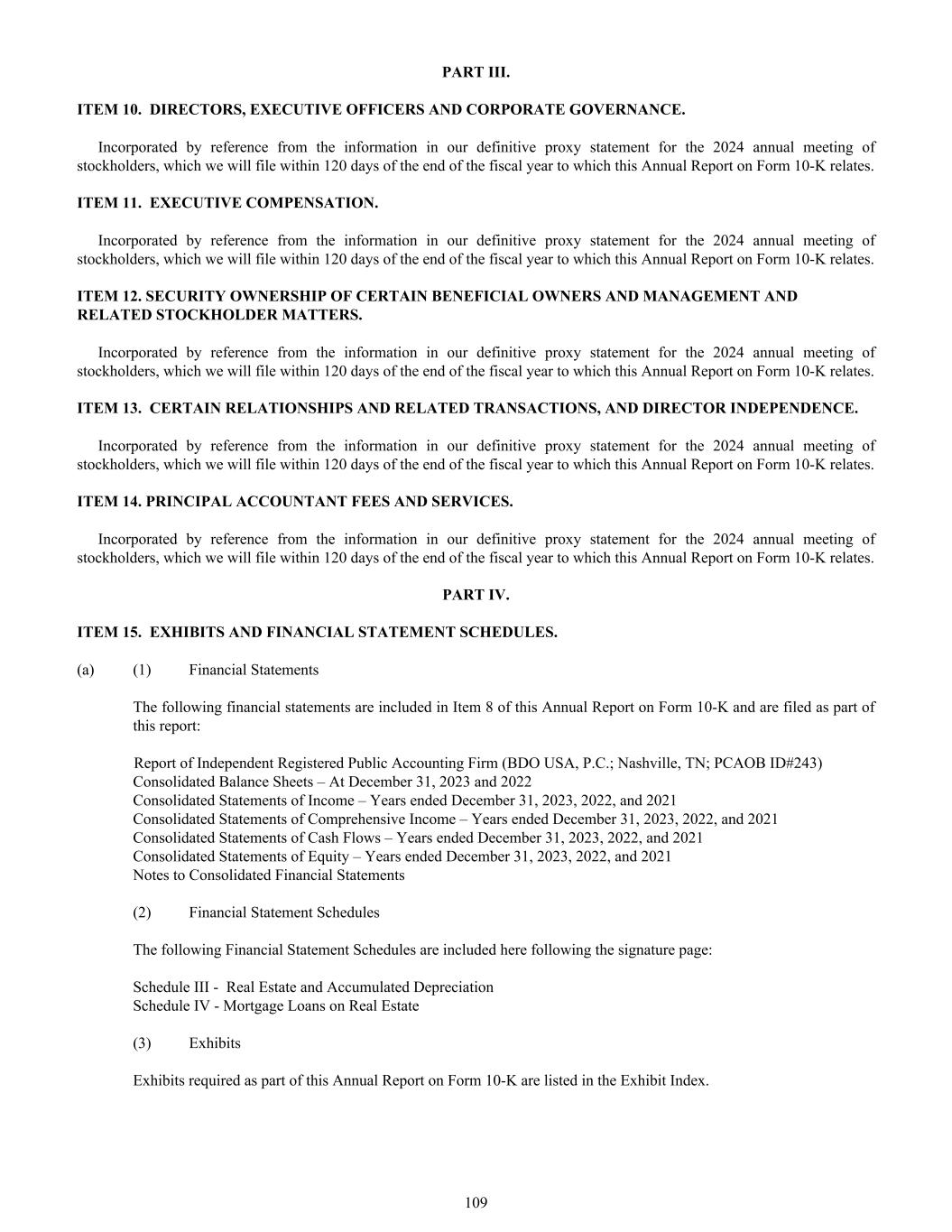 PART III. ITEM 10. DIRECTORS, EXECUTIVE OFFICERS AND CORPORATE GOVERNANCE. Incorporated by reference from the information in our definitive proxy statement for the 2024 annual meeting of stockholders, which we will file within 120 days of the end of the fiscal year to which this Annual Report on Form 10-K relates. ITEM 11. EXECUTIVE COMPENSATION. Incorporated by reference from the information in our definitive proxy statement for the 2024 annual meeting of stockholders, which we will file within 120 days of the end of the fiscal year to which this Annual Report on Form 10-K relates. ITEM 12. SECURITY OWNERSHIP OF CERTAIN BENEFICIAL OWNERS AND MANAGEMENT AND RELATED STOCKHOLDER MATTERS. Incorporated by reference from the information in our definitive proxy statement for the 2024 annual meeting of stockholders, which we will file within 120 days of the end of the fiscal year to which this Annual Report on Form 10-K relates. ITEM 13. CERTAIN RELATIONSHIPS AND RELATED TRANSACTIONS, AND DIRECTOR INDEPENDENCE. Incorporated by reference from the information in our definitive proxy statement for the 2024 annual meeting of stockholders, which we will file within 120 days of the end of the fiscal year to which this Annual Report on Form 10-K relates. ITEM 14. PRINCIPAL ACCOUNTANT FEES AND SERVICES. Incorporated by reference from the information in our definitive proxy statement for the 2024 annual meeting of stockholders, which we will file within 120 days of the end of the fiscal year to which this Annual Report on Form 10-K relates. PART IV. ITEM 15. EXHIBITS AND FINANCIAL STATEMENT SCHEDULES. (a) (1) Financial Statements The following financial statements are included in Item 8 of this Annual Report on Form 10-K and are filed as part of this report: Report of Independent Registered Public Accounting Firm (BDO USA, P.C.; Nashville, TN; PCAOB ID#243) Consolidated Balance Sheets – At December 31, 2023 and 2022 Consolidated Statements of Income – Years ended December 31, 2023, 2022, and 2021 Consolidated Statements of Comprehensive Income – Years ended December 31, 2023, 2022, and 2021 Consolidated Statements of Cash Flows – Years ended December 31, 2023, 2022, and 2021 Consolidated Statements of Equity – Years ended December 31, 2023, 2022, and 2021 Notes to Consolidated Financial Statements (2) Financial Statement Schedules The following Financial Statement Schedules are included here following the signature page: Schedule III - Real Estate and Accumulated Depreciation Schedule IV - Mortgage Loans on Real Estate (3) Exhibits Exhibits required as part of this Annual Report on Form 10-K are listed in the Exhibit Index. 109