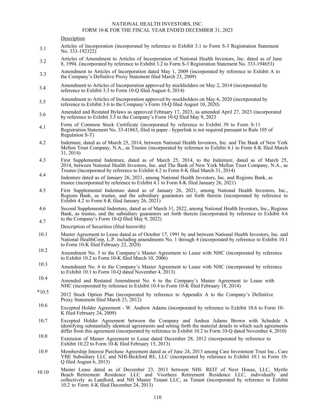 NATIONAL HEALTH INVESTORS, INC. FORM 10-K FOR THE FISCAL YEAR ENDED DECEMBER 31, 2023 3.1 3.2 3.3 3.4 3.5 3.6 4.1 4.2 4.3 4.4 4.5 4.6 4.7 10.1 10.2 10.3 10.4 *10.5 10.6 10.7 10.8 10.9 10.10 Description Articles of Incorporation (incorporated by reference to Exhibit 3.1 to Form S-3 Registration Statement No. 333-192322) Articles of Amendment to Articles of Incorporation of National Health Investors, Inc. dated as of June 8, 1994. (incorporated by reference to Exhibit 3.2 to Form S-3 Registration Statement No. 333-194653) Amendment to Articles of Incorporation dated May 1, 2009 (incorporated by reference to Exhibit A to the Company’s Definitive Proxy Statement filed March 23, 2009) Amendment to Articles of Incorporation approved by stockholders on May 2, 2014 (incorporated by reference to Exhibit 3.3 to Form 10-Q filed August 4, 2014) Amendment to Articles of Incorporation approved by stockholders on May 6, 2020 (incorporated by reference to Exhibit 3.6 to the Company’s Form 10-Q filed August 10, 2020) Amended and Restated Bylaws as approved February 17, 2023, as amended April 27, 2023 (incorporated by reference to Exhibit 3.5 to the Company’s Form 10-Q filed May 9, 2023 Form of Common Stock Certificate (incorporated by reference to Exhibit 39 to Form S-11 Registration Statement No. 33-41863, filed in paper - hyperlink is not required pursuant to Rule 105 of Regulation S-T) Indenture, dated as of March 25, 2014, between National Health Investors, Inc. and The Bank of New York Mellon Trust Company, N.A., as Trustee (incorporated by reference to Exhibit 4.1 to Form 8-K filed March 31, 2014) First Supplemental Indenture, dated as of March 25, 2014, to the Indenture, dated as of March 25, 2014, between National Health Investors, Inc. and The Bank of New York Mellon Trust Company, N.A., as Trustee (incorporated by reference to Exhibit 4.2 to Form 8-K filed March 31, 2014) Indenture dated as of January 26, 2021, among National Health Investors, Inc. and Regions Bank, as trustee (incorporated by reference to Exhibit 4.1 to Form 8-K filed January 26, 2021) First Supplemental Indenture dated as of January 26, 2021, among National Health Investors, Inc., Regions Bank, as trustee, and the subsidiary guarantors set forth therein (incorporated by reference to Exhibit 4.2 to Form 8-K filed January 26, 2021) Second Supplemental Indenture, dated as of March 31, 2022, among National Health Investors, Inc., Regions Bank, as trustee, and the subsidiary guarantors set forth therein (incorporated by reference to Exhibit 4.6 to the Company’s Form 10-Q filed May 9, 2022) Description of Securities (filed herewith) Master Agreement to Lease dated as of October 17, 1991 by and between National Health Investors, Inc. and National HealthCorp, L.P. including amendments No. 1 through 4 (incorporated by reference to Exhibit 10.1 to Form 10-K filed February 22, 2020) Amendment No. 5 to the Company’s Master Agreement to Lease with NHC (incorporated by reference to Exhibit 10.2 to Form 10-K filed March 10, 2006) Amendment No. 6 to the Company’s Master Agreement to Lease with NHC (incorporated by reference to Exhibit 10.1 to Form 10-Q dated November 4, 2013) Amended and Restated Amendment No. 6 to the Company’s Master Agreement to Lease with NHC (incorporated by reference to Exhibit 10.4 to Form 10-K filed February 18, 2014) 2012 Stock Option Plan (incorporated by reference to Appendix A to the Company’s Definitive Proxy Statement filed March 23, 2012) Excepted Holder Agreement - W. Andrew Adams (incorporated by reference to Exhibit 10.6 to Form 10- K filed February 24, 2009) Excepted Holder Agreement between the Company and Andrea Adams Brown with Schedule A identifying substantially identical agreements and setting forth the material details in which such agreements differ from this agreement (incorporated by reference to Exhibit 10.2 to Form 10-Q dated November 4, 2010) Extension of Master Agreement to Lease dated December 28, 2012 (incorporated by reference to Exhibit 10.22 to Form 10-K filed February 15, 2013) Membership Interest Purchase Agreement dated as of June 24, 2013 among Care Investment Trust Inc., Care YBE Subsidiary LLC and NHI-Bickford RE, LLC (incorporated by reference to Exhibit 10.1 to Form 10- Q filed August 6, 2013) Master Lease dated as of December 23, 2013 between NHI- REIT of Next House, LLC, Myrtle Beach Retirement Residence LLC and Voorhees Retirement Residence LLC, individually and collectively as Landlord, and NH Master Tenant LLC, as Tenant (incorporated by reference to Exhibit 10.2 to Form 8-K filed December 24, 2013) 110