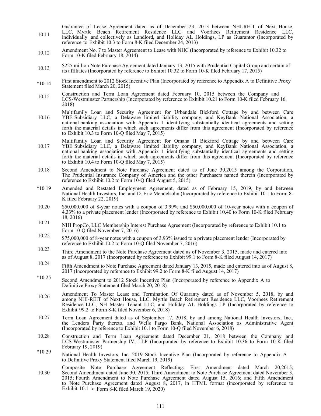 10.11 10.12 10.13 *10.14 10.15 10.16 10.17 10.18 *10.19 10.20 10.21 10.22 10.23 10.24 *10.25 10.26 10.27 10.28 *10.29 10.30 Guarantee of Lease Agreement dated as of December 23, 2013 between NHI-REIT of Next House, LLC, Myrtle Beach Retirement Residence LLC and Voorhees Retirement Residence LLC, individually and collectively as Landlord, and Holiday AL Holdings, LP as Guarantor (Incorporated by reference to Exhibit 10.3 to Form 8-K filed December 24, 2013) Amendment No. 7 to Master Agreement to Lease with NHC (Incorporated by reference to Exhibit 10.32 to Form 10-K filed February 18, 2014) $225 million Note Purchase Agreement dated January 13, 2015 with Prudential Capital Group and certain of its affiliates (Incorporated by reference to Exhibit 10.32 to Form 10-K filed February 17, 2015) First amendment to 2012 Stock Incentive Plan (Incorporated by reference to Appendix A to Definitive Proxy Statement filed March 20, 2015) Construction and Term Loan Agreement dated February 10, 2015 between the Company and LCS-Westminster Partnership (Incorporated by reference to Exhibit 10.21 to Form 10-K filed February 16, 2018) Multifamily Loan and Security Agreement for Urbandale Bickford Cottage by and between Care YBE Subsidiary LLC, a Delaware limited liability company, and KeyBank National Association, a national banking association with Appendix 1 identifying substantially identical agreements and setting forth the material details in which such agreements differ from this agreement (Incorporated by reference to Exhibit 10.3 to Form 10-Q filed May 7, 2015) Multifamily Loan and Security Agreement for Omaha II Bickford Cottage by and between Care YBE Subsidiary LLC, a Delaware limited liability company, and KeyBank National Association, a national banking association with Appendix 1 identifying substantially identical agreements and setting forth the material details in which such agreements differ from this agreement (Incorporated by reference to Exhibit 10.4 to Form 10-Q filed May 7, 2015) Second Amendment to Note Purchase Agreement dated as of June 30,2015 among the Corporation, The Prudential Insurance Company of America and the other Purchasers named therein (Incorporated by reference to Exhibit 10.2 to Form 10-Q filed August 5, 2015) Amended and Restated Employment Agreement, dated as of February 15, 2019, by and between National Health Investors, Inc. and D. Eric Mendelsohn (Incorporated by reference to Exhibit 10.1 to Form 8- K filed February 22, 2019) $50,000,000 of 8-year notes with a coupon of 3.99% and $50,000,000 of 10-year notes with a coupon of 4.33% to a private placement lender (Incorporated by reference to Exhibit 10.40 to Form 10-K filed February 18, 2016) NHI PropCo, LLC Membership Interest Purchase Agreement (Incorporated by reference to Exhibit 10.1 to Form 10-Q filed November 7, 2016) $75,000,000 of 8-year notes with a coupon of 3.93% issued to a private placement lender (Incorporated by reference to Exhibit 10.2 to Form 10-Q filed November 7, 2016) Third Amendment to the Note Purchase Agreement dated as of November 3, 2015, made and entered into as of August 8, 2017 (Incorporated by reference to Exhibit 99.1 to Form 8-K filed August 14, 2017) Fifth Amendment to Note Purchase Agreement dated January 13, 2015, made and entered into as of August 8, 2017 (Incorporated by reference to Exhibit 99.2 to Form 8-K filed August 14, 2017) Second Amendment to 2012 Stock Incentive Plan (Incorporated by reference to Appendix A to Definitive Proxy Statement filed March 20, 2018) Amendment To Master Lease and Termination Of Guaranty dated as of November 5, 2018, by and among NHI-REIT of Next House, LLC, Myrtle Beach Retirement Residence LLC, Voorhees Retirement Residence LLC, NH Master Tenant LLC, and Holiday AL Holdings LP (Incorporated by reference to Exhibit 99.2 to Form 8-K filed November 6, 2018) Term Loan Agreement dated as of September 17, 2018, by and among National Health Investors, Inc., the Lenders Party thereto, and Wells Fargo Bank, National Association as Administrative Agent (Incorporated by reference to Exhibit 10.1 to Form 10-Q filed November 6, 2018) Construction and Term Loan Agreement dated December 21, 2018 between the Company and LCS-Westminster Partnership IV, LLP (Incorporated by reference to Exhibit 10.36 to Form 10-K filed February 19, 2019) National Health Investors, Inc. 2019 Stock Incentive Plan (Incorporated by reference to Appendix A to Definitive Proxy Statement filed March 19, 2019) Composite Note Purchase Agreement Reflecting: First Amendment dated March 20,2015; Second Amendment dated June 30, 2015; Third Amendment to Note Purchase Agreement dated November 3, 2015; Fourth Amendment to Note Purchase Agreement dated August 15, 2016; and Fifth Amendment to Note Purchase Agreement dated August 8, 2017, in HTML format (incorporated by reference to Exhibit 10.1 to Form 8-K filed March 19, 2020) 111