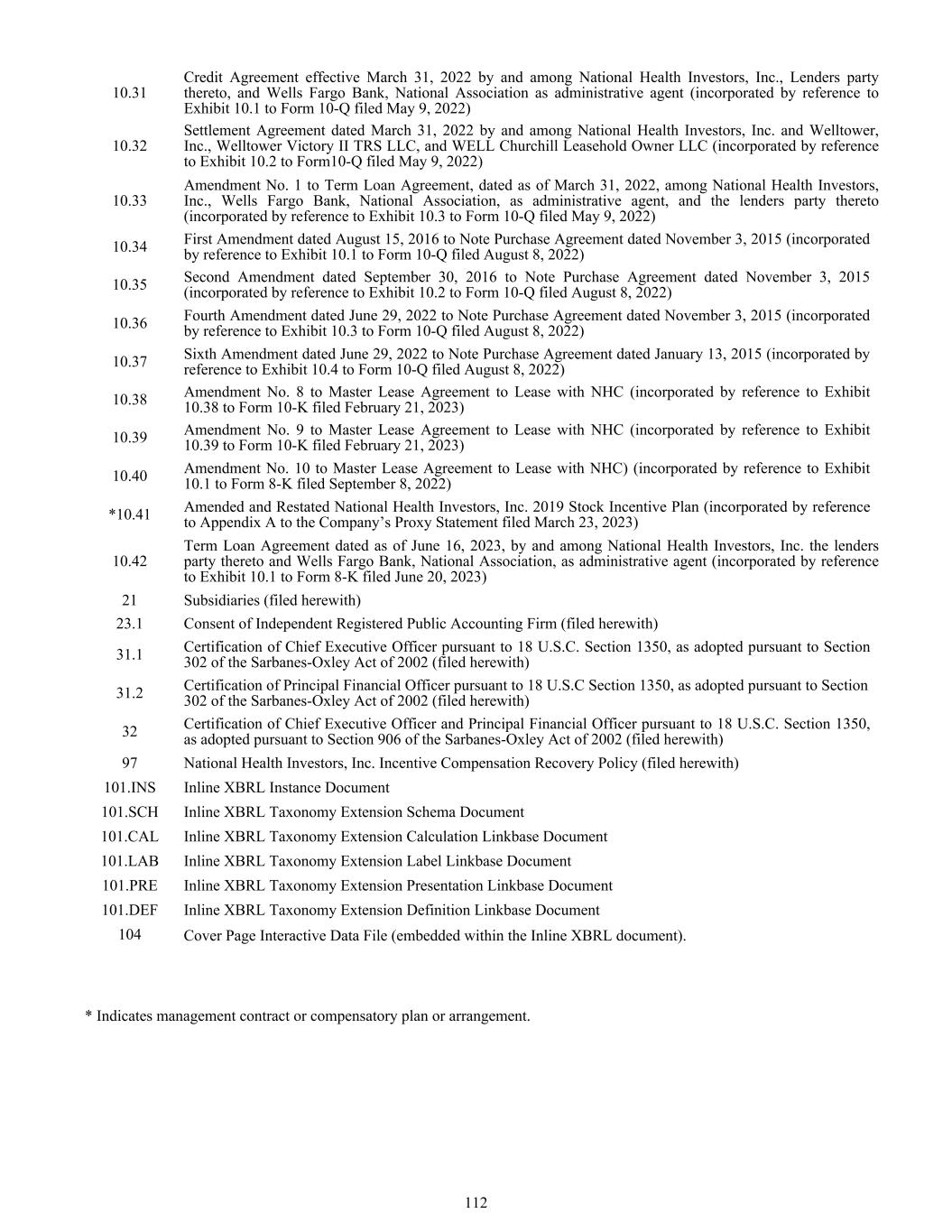 10.31 10.32 10.33 10.34 10.35 10.36 10.37 10.38 10.39 10.40 *10.41 10.42 21 23.1 31.1 31.2 32 97 Credit Agreement effective March 31, 2022 by and among National Health Investors, Inc., Lenders party thereto, and Wells Fargo Bank, National Association as administrative agent (incorporated by reference to Exhibit 10.1 to Form 10-Q filed May 9, 2022) Settlement Agreement dated March 31, 2022 by and among National Health Investors, Inc. and Welltower, Inc., Welltower Victory II TRS LLC, and WELL Churchill Leasehold Owner LLC (incorporated by reference to Exhibit 10.2 to Form10-Q filed May 9, 2022) Amendment No. 1 to Term Loan Agreement, dated as of March 31, 2022, among National Health Investors, Inc., Wells Fargo Bank, National Association, as administrative agent, and the lenders party thereto (incorporated by reference to Exhibit 10.3 to Form 10-Q filed May 9, 2022) First Amendment dated August 15, 2016 to Note Purchase Agreement dated November 3, 2015 (incorporated by reference to Exhibit 10.1 to Form 10-Q filed August 8, 2022) Second Amendment dated September 30, 2016 to Note Purchase Agreement dated November 3, 2015 (incorporated by reference to Exhibit 10.2 to Form 10-Q filed August 8, 2022) Fourth Amendment dated June 29, 2022 to Note Purchase Agreement dated November 3, 2015 (incorporated by reference to Exhibit 10.3 to Form 10-Q filed August 8, 2022) Sixth Amendment dated June 29, 2022 to Note Purchase Agreement dated January 13, 2015 (incorporated by reference to Exhibit 10.4 to Form 10-Q filed August 8, 2022) Amendment No. 8 to Master Lease Agreement to Lease with NHC (incorporated by reference to Exhibit 10.38 to Form 10-K filed February 21, 2023) Amendment No. 9 to Master Lease Agreement to Lease with NHC (incorporated by reference to Exhibit 10.39 to Form 10-K filed February 21, 2023) Amendment No. 10 to Master Lease Agreement to Lease with NHC) (incorporated by reference to Exhibit 10.1 to Form 8-K filed September 8, 2022) Amended and Restated National Health Investors, Inc. 2019 Stock Incentive Plan (incorporated by reference to Appendix A to the Company’s Proxy Statement filed March 23, 2023) Term Loan Agreement dated as of June 16, 2023, by and among National Health Investors, Inc. the lenders party thereto and Wells Fargo Bank, National Association, as administrative agent (incorporated by reference to Exhibit 10.1 to Form 8-K filed June 20, 2023) Subsidiaries (filed herewith) Consent of Independent Registered Public Accounting Firm (filed herewith) Certification of Chief Executive Officer pursuant to 18 U.S.C. Section 1350, as adopted pursuant to Section 302 of the Sarbanes-Oxley Act of 2002 (filed herewith) Certification of Principal Financial Officer pursuant to 18 U.S.C Section 1350, as adopted pursuant to Section 302 of the Sarbanes-Oxley Act of 2002 (filed herewith) Certification of Chief Executive Officer and Principal Financial Officer pursuant to 18 U.S.C. Section 1350, as adopted pursuant to Section 906 of the Sarbanes-Oxley Act of 2002 (filed herewith) National Health Investors, Inc. Incentive Compensation Recovery Policy (filed herewith) 101.INS Inline XBRL Instance Document 101.SCH Inline XBRL Taxonomy Extension Schema Document 101.CAL Inline XBRL Taxonomy Extension Calculation Linkbase Document 101.LAB Inline XBRL Taxonomy Extension Label Linkbase Document 101.PRE Inline XBRL Taxonomy Extension Presentation Linkbase Document 101.DEF Inline XBRL Taxonomy Extension Definition Linkbase Document 104 Cover Page Interactive Data File (embedded within the Inline XBRL document). * Indicates management contract or compensatory plan or arrangement. 112