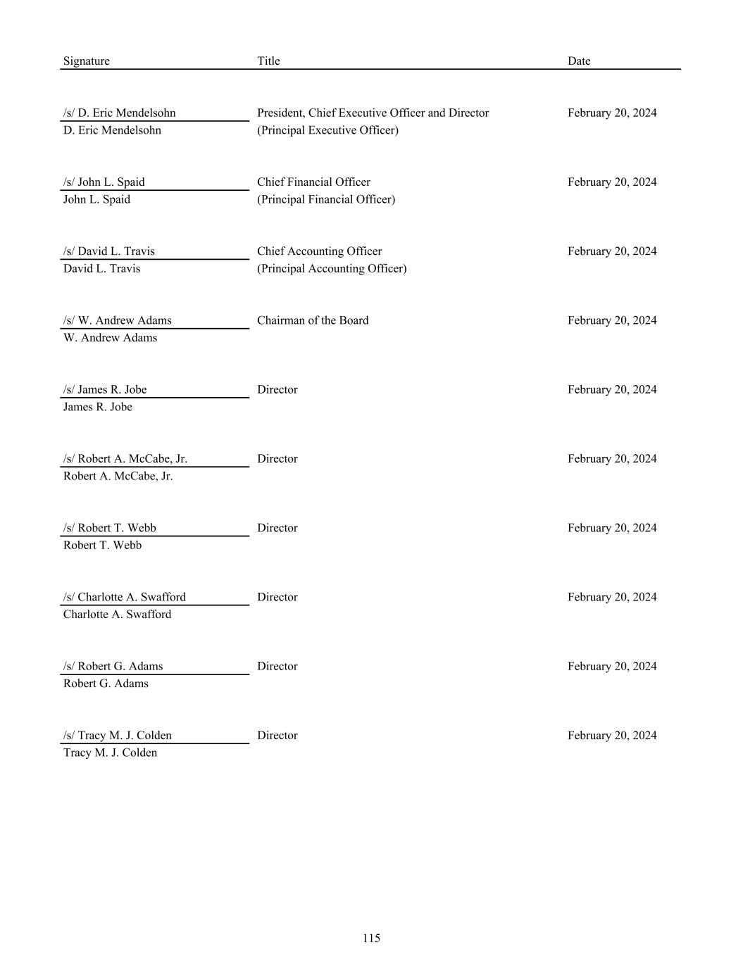 Signature Title Date /s/ D. Eric Mendelsohn President, Chief Executive Officer and Director February 20, 2024 D. Eric Mendelsohn (Principal Executive Officer) /s/ John L. Spaid Chief Financial Officer February 20, 2024 John L. Spaid (Principal Financial Officer) /s/ David L. Travis Chief Accounting Officer February 20, 2024 David L. Travis (Principal Accounting Officer) /s/ W. Andrew Adams Chairman of the Board February 20, 2024 W. Andrew Adams /s/ James R. Jobe Director February 20, 2024 James R. Jobe /s/ Robert A. McCabe, Jr. Director February 20, 2024 Robert A. McCabe, Jr. /s/ Robert T. Webb Director February 20, 2024 Robert T. Webb /s/ Charlotte A. Swafford Director February 20, 2024 Charlotte A. Swafford /s/ Robert G. Adams Director February 20, 2024 Robert G. Adams /s/ Tracy M. J. Colden Director February 20, 2024 Tracy M. J. Colden 115