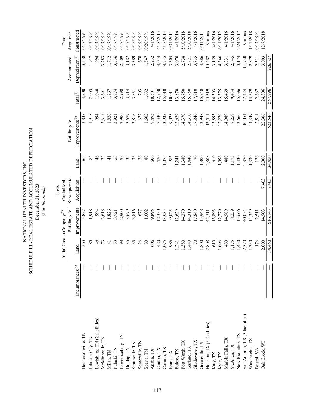 N A TI O N A L H EA LT H IN V ES TO R S, IN C . SC H ED U LE II I - R EA L ES TA TE A N D A C C U M U LA TE D D EP R EC IA TI O N D ec em be r 3 1, 2 02 3 ($ in th ou sa nd s) C os ts In iti al C os t t o C om pa ny (C ) C ap ita liz ed D at e B ui ld in gs & Su bs eq ue nt to B ui ld in gs & A cc um ul at ed A cq ui re d/ En cu m br an ce s(A ) La nd Im pr ov em en ts A cq ui si tio n La nd Im pr ov em en ts (D ) To ta l(E ) D ep re ci at io n(B ) C on st ru ct ed H en de rs on vi lle , T N — 36 3 3, 83 7 — 36 3 3, 83 7 4, 20 0 3, 43 8 10 /1 7/ 19 91 Jo hn so n C ity , T N — 85 1, 91 8 — 85 1, 91 8 2, 00 3 1, 91 7 10 /1 7/ 19 91 Le w is bu rg , T N (2 fa ci lit ie s) — 46 99 4 — 46 99 4 1, 04 0 99 4 10 /1 7/ 19 91 M cM in nv ill e, T N — 73 3, 61 8 — 73 3, 61 8 3, 69 1 3, 28 3 10 /1 7/ 19 91 M ila n, T N — 41 1, 82 6 — 41 1, 82 6 1, 86 7 1, 71 2 10 /1 7/ 19 91 Pu la sk i, TN — 53 3, 92 1 — 53 3, 92 1 3, 97 4 3, 53 6 10 /1 7/ 19 91 La w re nc eb ur g, T N — 98 2, 90 0 — 98 2, 90 0 2, 99 8 2, 50 9 10 /1 7/ 19 91 D un la p, T N — 35 3, 67 9 — 35 3, 67 9 3, 71 4 3, 18 2 10 /1 7/ 19 91 Sm ith vi lle , T N — 35 3, 81 6 — 35 3, 81 6 3, 85 1 3, 38 9 10 /1 8/ 19 91 So m er vi lle , T N — 26 67 7 — 26 67 7 70 3 67 8 10 /1 9/ 19 91 Sp ar ta , T N — 80 1, 60 2 — 80 1, 60 2 1, 68 2 1, 54 7 10 /2 0/ 19 91 A us tin , T X — 60 6 9, 89 5 — 60 6 9, 89 5 10 ,5 01 2, 23 2 4/ 1/ 20 16 C an to n, T X — 42 0 12 ,3 30 — 42 0 12 ,3 30 12 ,7 50 4, 01 4 4/ 18 /2 01 3 C or in th , T X — 1, 07 5 13 ,9 35 — 1, 07 5 13 ,9 35 15 ,0 10 4, 74 5 4/ 18 /2 01 3 En ni s, TX — 98 6 9, 02 5 — 98 6 9, 02 5 10 ,0 11 3, 30 5 10 /3 1/ 20 11 Eu le ss , T X — 1, 24 1 12 ,6 29 — 1, 24 1 12 ,6 29 13 ,8 70 3, 07 0 4/ 1/ 20 16 Fo rt W or th , T X — 1, 38 0 14 ,3 70 — 1, 38 0 14 ,3 70 15 ,7 50 2, 73 8 5/ 10 /2 01 8 G ar la nd , T X — 1, 44 0 14 ,3 10 — 1, 44 0 14 ,3 10 15 ,7 50 2, 72 1 5/ 10 /2 01 8 G la de w at er , T X — 70 17 ,8 40 — 70 17 ,8 40 17 ,9 10 3, 83 5 4/ 1/ 20 16 G re en vi lle , T X — 1, 80 0 13 ,9 48 — 1, 80 0 13 ,9 48 15 ,7 48 4, 88 6 10 /3 1/ 20 11 H ou st on , T X (3 fa ci lit ie s) — 2, 80 8 42 ,5 11 — 2, 80 8 42 ,5 11 45 ,3 19 15 ,4 82 V ar io us K at y, T X — 61 0 13 ,8 93 — 61 0 13 ,8 93 14 ,5 03 3, 15 9 4/ 1/ 20 16 K yl e, T X — 1, 09 6 12 ,2 79 — 1, 09 6 12 ,2 79 13 ,3 75 4, 34 6 6/ 11 /2 01 2 M ar bl e Fa lls , T X — 48 0 14 ,9 89 — 48 0 14 ,9 89 15 ,4 69 3, 33 1 4/ 1/ 20 16 M cA lle n, T X — 1, 17 5 8, 25 9 — 1, 17 5 8, 25 9 9, 43 4 2, 04 5 4/ 1/ 20 16 N ew B ra un fe ls , T X — 1, 43 0 13 ,6 66 — 1, 43 0 13 ,6 66 15 ,0 96 3, 17 4 2/ 24 /2 01 7 Sa n A nt on io , T X (3 fa ci lit ie s) — 2, 37 0 40 ,0 54 — 2, 37 0 40 ,0 54 42 ,4 24 11 ,7 30 V ar io us W ax ah ac hi e, T X — 1, 33 0 14 ,3 49 — 1, 33 0 14 ,3 49 15 ,6 79 2, 87 9 1/ 17 /2 01 8 B ris to l, V A — 17 6 2, 51 1 — 17 6 2, 51 1 2, 68 7 2, 51 1 10 /1 7/ 19 91 O ak C re ek , W I — 2, 00 0 14 ,9 03 7, 40 3 2, 00 0 22 ,3 06 24 ,3 06 3, 00 3 12 /7 /2 01 8 — 34 ,4 50 51 6, 14 3 7, 40 3 34 ,4 50 52 3, 54 6 55 7, 99 6 22 6, 62 7 117