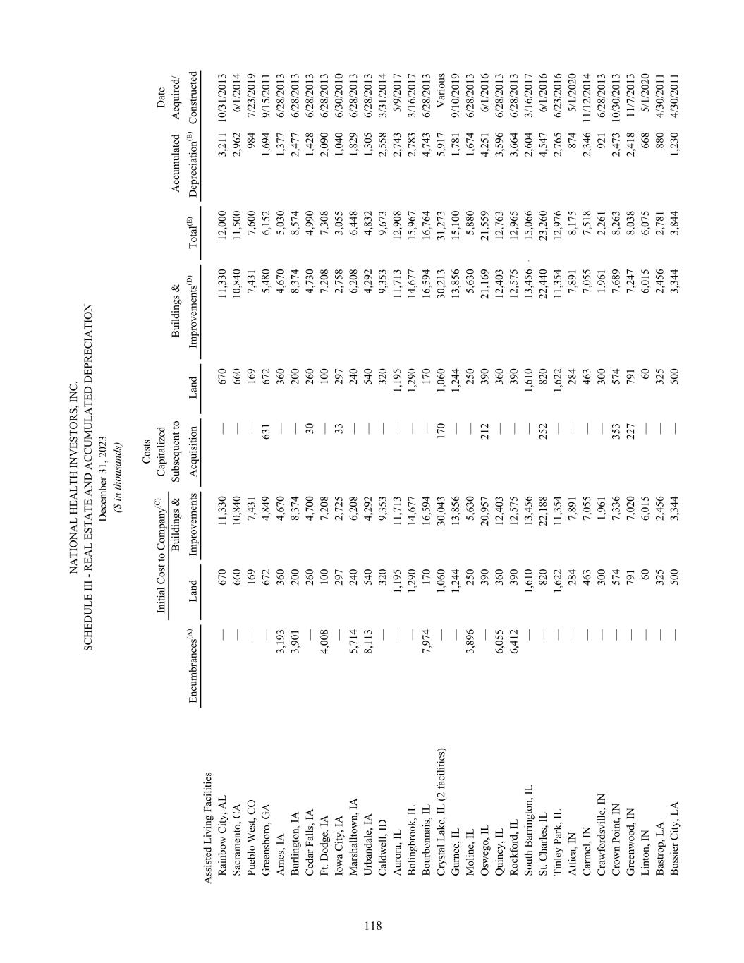 N A TI O N A L H EA LT H IN V ES TO R S, IN C . SC H ED U LE II I - R EA L ES TA TE A N D A C C U M U LA TE D D EP R EC IA TI O N D ec em be r 3 1, 2 02 3 ($ in th ou sa nd s) C os ts In iti al C os t t o C om pa ny (C ) C ap ita liz ed D at e B ui ld in gs & Su bs eq ue nt to B ui ld in gs & A cc um ul at ed A cq ui re d/ En cu m br an ce s(A ) La nd Im pr ov em en ts A cq ui si tio n La nd Im pr ov em en ts (D ) To ta l(E ) D ep re ci at io n(B ) C on st ru ct ed A ss is te d Li vi ng F ac ili tie s R ai nb ow C ity , A L — 67 0 11 ,3 30 — 67 0 11 ,3 30 12 ,0 00 3, 21 1 10 /3 1/ 20 13 Sa cr am en to , C A — 66 0 10 ,8 40 — 66 0 10 ,8 40 11 ,5 00 2, 96 2 6/ 1/ 20 14 Pu eb lo W es t, C O — 16 9 7, 43 1 — 16 9 7, 43 1 7, 60 0 98 4 7/ 23 /2 01 9 G re en sb or o, G A — 67 2 4, 84 9 63 1 67 2 5, 48 0 6, 15 2 1, 69 4 9/ 15 /2 01 1 A m es , I A 3, 19 3 36 0 4, 67 0 — 36 0 4, 67 0 5, 03 0 1, 37 7 6/ 28 /2 01 3 B ur lin gt on , I A 3, 90 1 20 0 8, 37 4 — 20 0 8, 37 4 8, 57 4 2, 47 7 6/ 28 /2 01 3 C ed ar F al ls , I A — 26 0 4, 70 0 30 26 0 4, 73 0 4, 99 0 1, 42 8 6/ 28 /2 01 3 Ft . D od ge , I A 4, 00 8 10 0 7, 20 8 — 10 0 7, 20 8 7, 30 8 2, 09 0 6/ 28 /2 01 3 Io w a C ity , I A — 29 7 2, 72 5 33 29 7 2, 75 8 3, 05 5 1, 04 0 6/ 30 /2 01 0 M ar sh al lto w n, IA 5, 71 4 24 0 6, 20 8 — 24 0 6, 20 8 6, 44 8 1, 82 9 6/ 28 /2 01 3 U rb an da le , I A 8, 11 3 54 0 4, 29 2 — 54 0 4, 29 2 4, 83 2 1, 30 5 6/ 28 /2 01 3 C al dw el l, ID — 32 0 9, 35 3 — 32 0 9, 35 3 9, 67 3 2, 55 8 3/ 31 /2 01 4 A ur or a, IL — 1, 19 5 11 ,7 13 — 1, 19 5 11 ,7 13 12 ,9 08 2, 74 3 5/ 9/ 20 17 B ol in gb ro ok , I L — 1, 29 0 14 ,6 77 — 1, 29 0 14 ,6 77 15 ,9 67 2, 78 3 3/ 16 /2 01 7 B ou rb on na is , I L 7, 97 4 17 0 16 ,5 94 — 17 0 16 ,5 94 16 ,7 64 4, 74 3 6/ 28 /2 01 3 C ry st al L ak e, IL (2 fa ci lit ie s) — 1, 06 0 30 ,0 43 17 0 1, 06 0 30 ,2 13 31 ,2 73 5, 91 7 V ar io us G ur ne e, IL — 1, 24 4 13 ,8 56 — 1, 24 4 13 ,8 56 15 ,1 00 1, 78 1 9/ 10 /2 01 9 M ol in e, IL 3, 89 6 25 0 5, 63 0 — 25 0 5, 63 0 5, 88 0 1, 67 4 6/ 28 /2 01 3 O sw eg o, IL — 39 0 20 ,9 57 21 2 39 0 21 ,1 69 21 ,5 59 4, 25 1 6/ 1/ 20 16 Q ui nc y, IL 6, 05 5 36 0 12 ,4 03 — 36 0 12 ,4 03 12 ,7 63 3, 59 6 6/ 28 /2 01 3 R oc kf or d, IL 6, 41 2 39 0 12 ,5 75 — 39 0 12 ,5 75 12 ,9 65 3, 66 4 6/ 28 /2 01 3 So ut h B ar rin gt on , I L — 1, 61 0 13 ,4 56 — 1, 61 0 13 ,4 56 — 15 ,0 66 2, 60 4 3/ 16 /2 01 7 St . C ha rle s, IL — 82 0 22 ,1 88 25 2 82 0 22 ,4 40 23 ,2 60 4, 54 7 6/ 1/ 20 16 Ti nl ey P ar k, IL — 1, 62 2 11 ,3 54 — 1, 62 2 11 ,3 54 12 ,9 76 2, 76 5 6/ 23 /2 01 6 A tti ca , I N — 28 4 7, 89 1 — 28 4 7, 89 1 8, 17 5 87 4 5/ 1/ 20 20 C ar m el , I N — 46 3 7, 05 5 — 46 3 7, 05 5 7, 51 8 2, 34 6 11 /1 2/ 20 14 C ra w fo rd sv ill e, IN — 30 0 1, 96 1 — 30 0 1, 96 1 2, 26 1 92 1 6/ 28 /2 01 3 C ro w n Po in t, IN — 57 4 7, 33 6 35 3 57 4 7, 68 9 8, 26 3 2, 47 3 10 /3 0/ 20 13 G re en w oo d, IN — 79 1 7, 02 0 22 7 79 1 7, 24 7 8, 03 8 2, 41 8 11 /7 /2 01 3 Li nt on , I N — 60 6, 01 5 — 60 6, 01 5 6, 07 5 66 8 5/ 1/ 20 20 B as tro p, L A — 32 5 2, 45 6 — 32 5 2, 45 6 2, 78 1 88 0 4/ 30 /2 01 1 B os si er C ity , L A — 50 0 3, 34 4 — 50 0 3, 34 4 3, 84 4 1, 23 0 4/ 30 /2 01 1 118