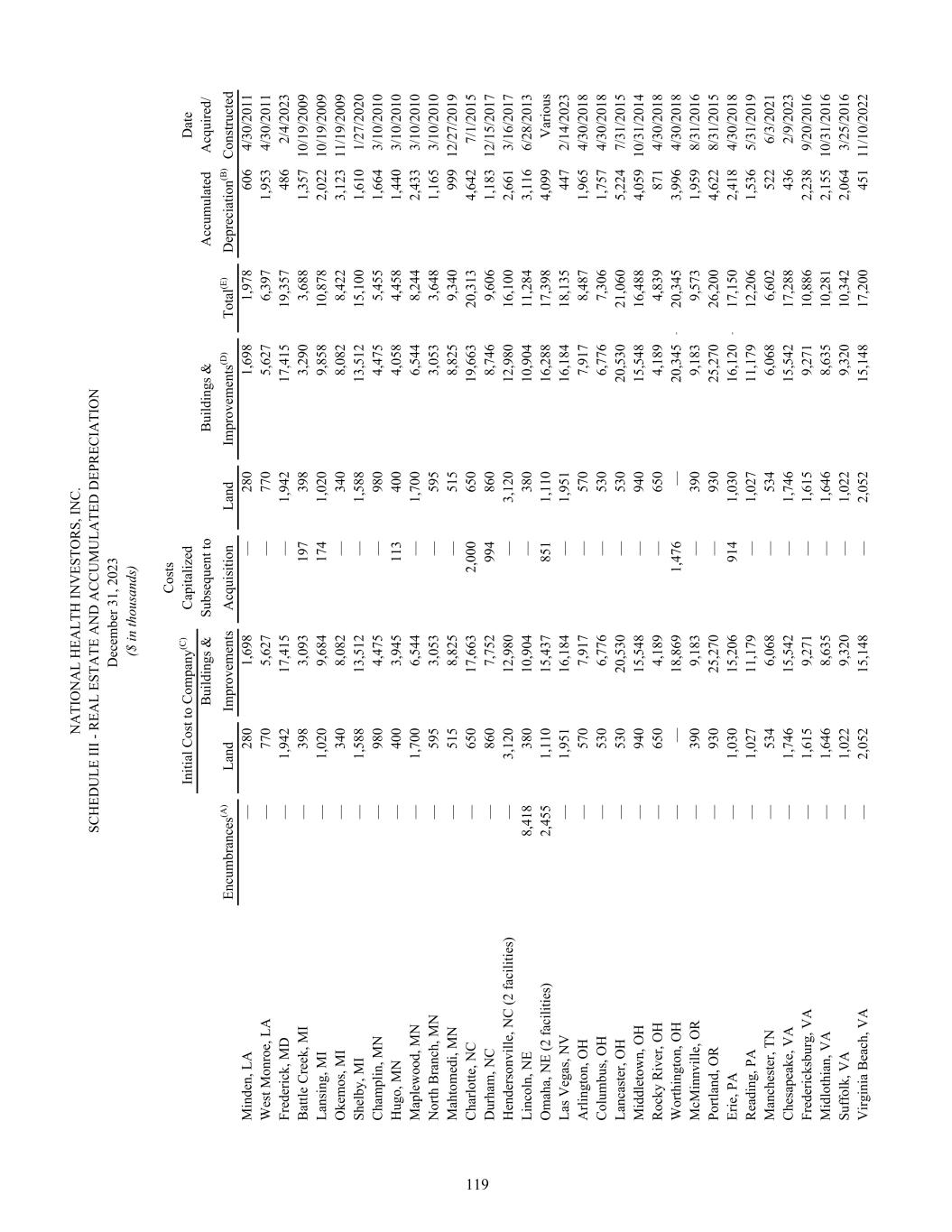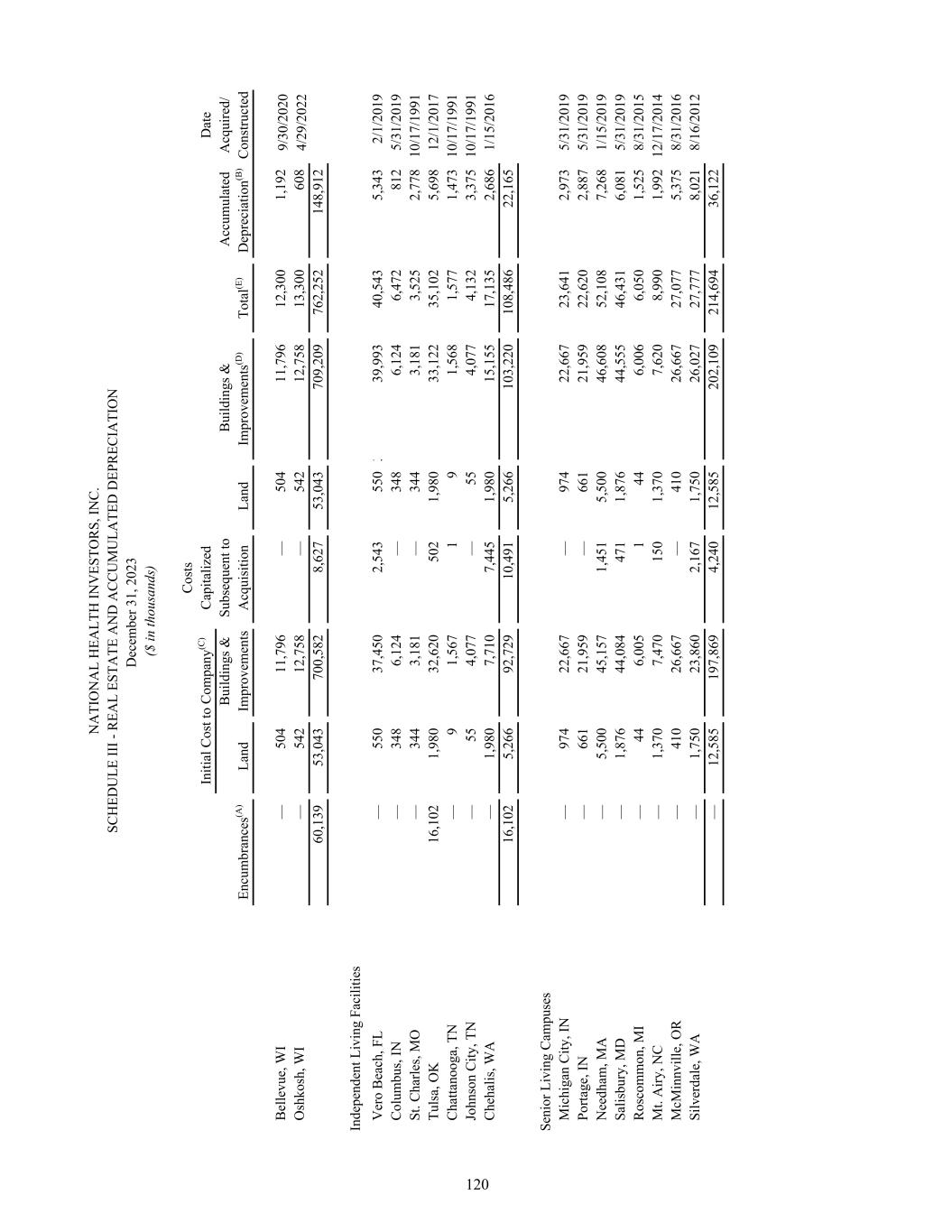 N A TI O N A L H EA LT H IN V ES TO R S, IN C . SC H ED U LE II I - R EA L ES TA TE A N D A C C U M U LA TE D D EP R EC IA TI O N D ec em be r 3 1, 2 02 3 ($ in th ou sa nd s) C os ts In iti al C os t t o C om pa ny (C ) C ap ita liz ed D at e B ui ld in gs & Su bs eq ue nt to B ui ld in gs & A cc um ul at ed A cq ui re d/ En cu m br an ce s(A ) La nd Im pr ov em en ts A cq ui si tio n La nd Im pr ov em en ts (D ) To ta l(E ) D ep re ci at io n(B ) C on st ru ct ed B el le vu e, W I — 50 4 11 ,7 96 — 50 4 11 ,7 96 12 ,3 00 1, 19 2 9/ 30 /2 02 0 O sh ko sh , W I — 54 2 12 ,7 58 — 54 2 12 ,7 58 13 ,3 00 60 8 4/ 29 /2 02 2 60 ,1 39 53 ,0 43 70 0, 58 2 8, 62 7 53 ,0 43 70 9, 20 9 76 2, 25 2 14 8, 91 2 In de pe nd en t L iv in g Fa ci lit ie s V er o B ea ch , F L — 55 0 37 ,4 50 2, 54 3 55 0 35 0 39 ,9 93 40 ,5 43 5, 34 3 2/ 1/ 20 19 C ol um bu s, IN — 34 8 6, 12 4 — 34 8 6, 12 4 6, 47 2 81 2 5/ 31 /2 01 9 St . C ha rle s, M O — 34 4 3, 18 1 — 34 4 3, 18 1 3, 52 5 2, 77 8 10 /1 7/ 19 91 Tu ls a, O K 16 ,1 02 1, 98 0 32 ,6 20 50 2 1, 98 0 33 ,1 22 35 ,1 02 5, 69 8 12 /1 /2 01 7 C ha tta no og a, T N — 9 1, 56 7 1 9 1, 56 8 1, 57 7 1, 47 3 10 /1 7/ 19 91 Jo hn so n C ity , T N — 55 4, 07 7 — 55 4, 07 7 4, 13 2 3, 37 5 10 /1 7/ 19 91 C he ha lis , W A — 1, 98 0 7, 71 0 7, 44 5 1, 98 0 15 ,1 55 17 ,1 35 2, 68 6 1/ 15 /2 01 6 16 ,1 02 5, 26 6 92 ,7 29 10 ,4 91 5, 26 6 10 3, 22 0 10 8, 48 6 22 ,1 65 Se ni or L iv in g C am pu se s M ic hi ga n C ity , I N — 97 4 22 ,6 67 — 97 4 22 ,6 67 23 ,6 41 2, 97 3 5/ 31 /2 01 9 Po rta ge , I N — 66 1 21 ,9 59 — 66 1 21 ,9 59 22 ,6 20 2, 88 7 5/ 31 /2 01 9 N ee dh am , M A — 5, 50 0 45 ,1 57 1, 45 1 5, 50 0 46 ,6 08 52 ,1 08 7, 26 8 1/ 15 /2 01 9 Sa lis bu ry , M D — 1, 87 6 44 ,0 84 47 1 1, 87 6 44 ,5 55 46 ,4 31 6, 08 1 5/ 31 /2 01 9 R os co m m on , M I — 44 6, 00 5 1 44 6, 00 6 6, 05 0 1, 52 5 8/ 31 /2 01 5 M t. A iry , N C — 1, 37 0 7, 47 0 15 0 1, 37 0 7, 62 0 8, 99 0 1, 99 2 12 /1 7/ 20 14 M cM in nv ill e, O R — 41 0 26 ,6 67 — 41 0 26 ,6 67 27 ,0 77 5, 37 5 8/ 31 /2 01 6 Si lv er da le , W A — 1, 75 0 23 ,8 60 2, 16 7 1, 75 0 26 ,0 27 27 ,7 77 8, 02 1 8/ 16 /2 01 2 — 12 ,5 85 19 7, 86 9 4, 24 0 12 ,5 85 20 2, 10 9 21 4, 69 4 36 ,1 22 120