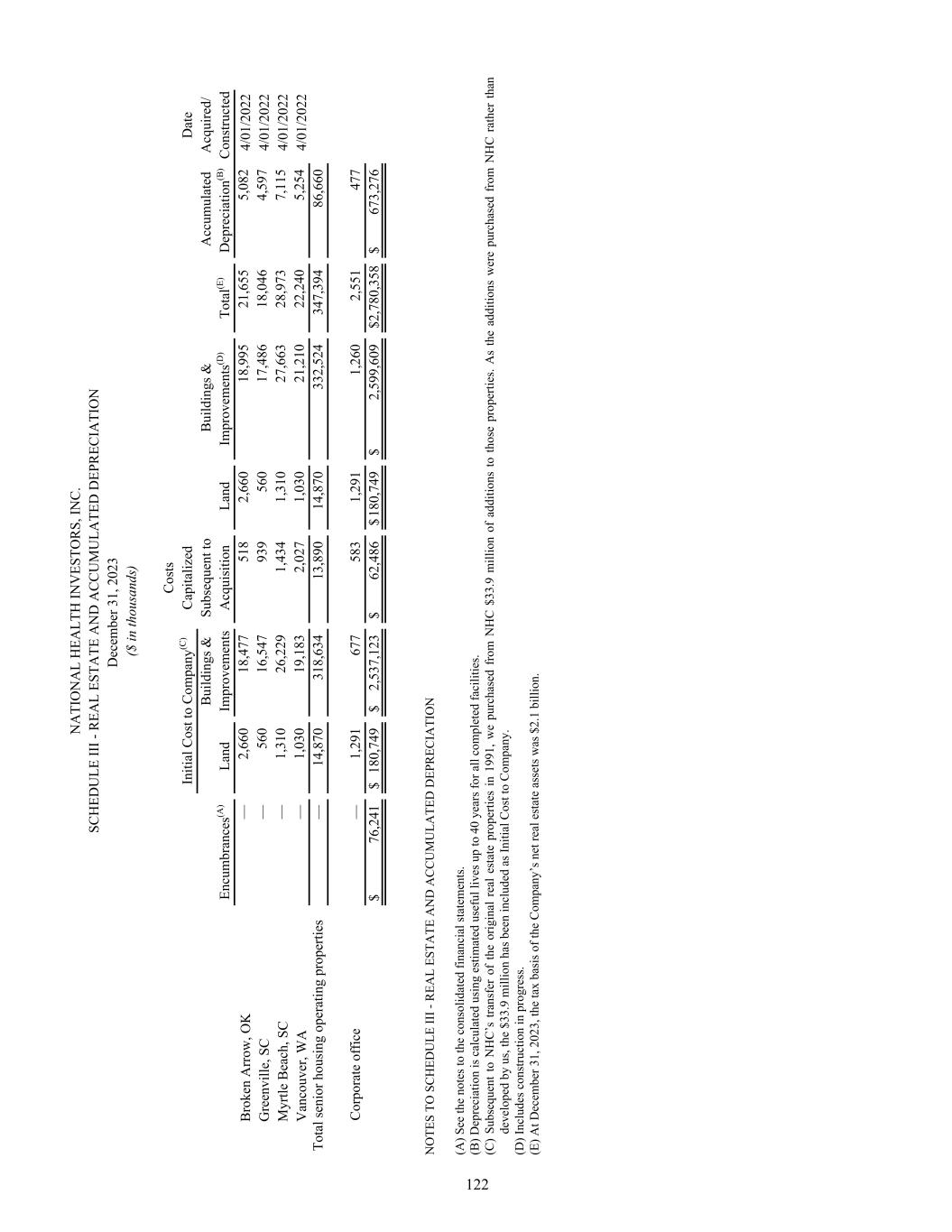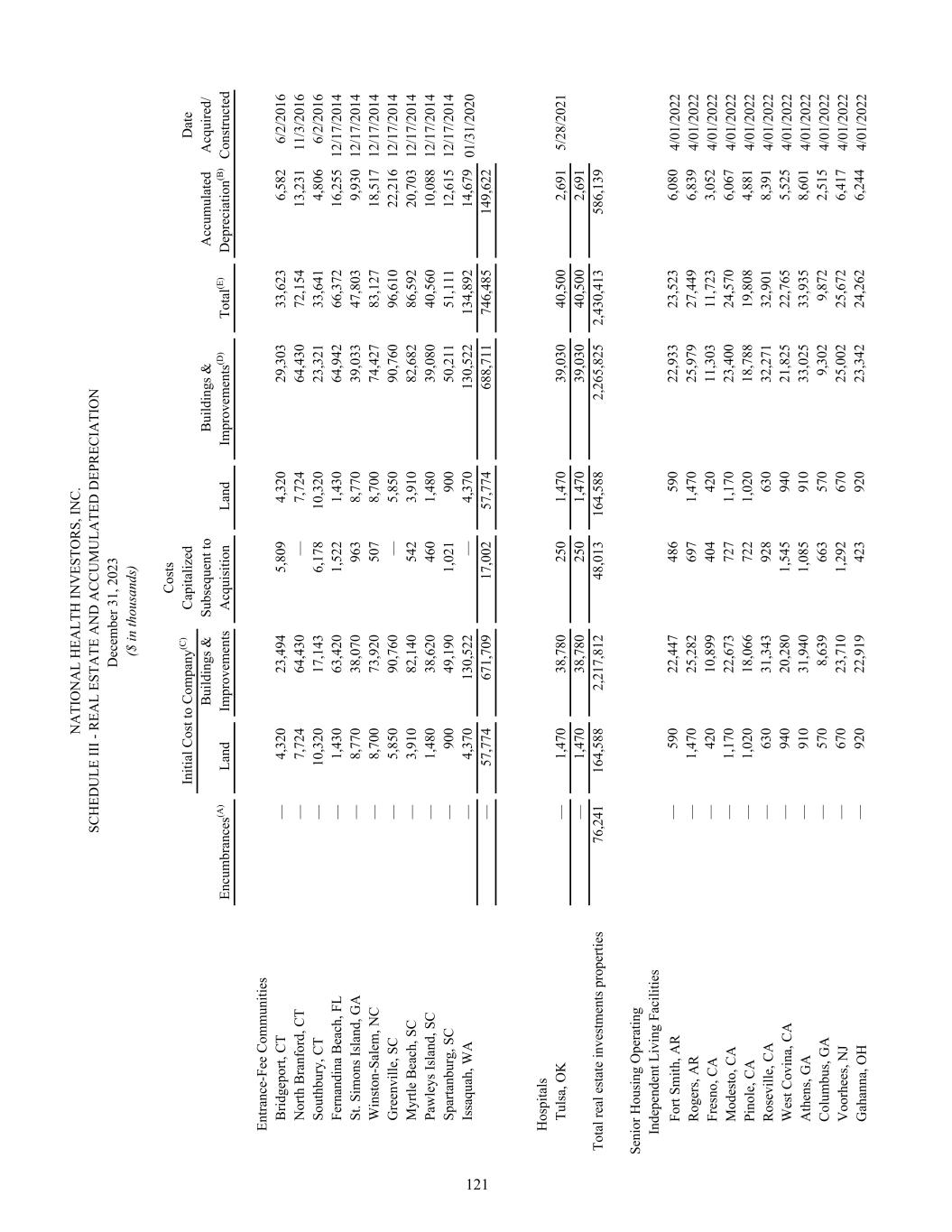 N A TI O N A L H EA LT H IN V ES TO R S, IN C . SC H ED U LE II I - R EA L ES TA TE A N D A C C U M U LA TE D D EP R EC IA TI O N D ec em be r 3 1, 2 02 3 ($ in th ou sa nd s) C os ts In iti al C os t t o C om pa ny (C ) C ap ita liz ed D at e B ui ld in gs & Su bs eq ue nt to B ui ld in gs & A cc um ul at ed A cq ui re d/ En cu m br an ce s(A ) La nd Im pr ov em en ts A cq ui si tio n La nd Im pr ov em en ts (D ) To ta l(E ) D ep re ci at io n(B ) C on st ru ct ed B ro ke n A rr ow , O K — 2, 66 0 18 ,4 77 51 8 2, 66 0 18 ,9 95 21 ,6 55 5, 08 2 4/ 01 /2 02 2 G re en vi lle , S C — 56 0 16 ,5 47 93 9 56 0 17 ,4 86 18 ,0 46 4, 59 7 4/ 01 /2 02 2 M yr tle B ea ch , S C — 1, 31 0 26 ,2 29 1, 43 4 1, 31 0 27 ,6 63 28 ,9 73 7, 11 5 4/ 01 /2 02 2 V an co uv er , W A — 1, 03 0 19 ,1 83 2, 02 7 1, 03 0 21 ,2 10 22 ,2 40 5, 25 4 4/ 01 /2 02 2 To ta l s en io r h ou si ng o pe ra tin g pr op er tie s — 14 ,8 70 31 8, 63 4 13 ,8 90 14 ,8 70 33 2, 52 4 34 7, 39 4 86 ,6 60 C or po ra te o ff ic e — 1, 29 1 67 7 58 3 1, 29 1 1, 26 0 2, 55 1 47 7 $ 76 ,2 41 $ 18 0, 74 9 $ 2, 53 7, 12 3 $ 62 ,4 86 $ 1 80 ,7 49 $ 2, 59 9, 60 9 $ 2 ,7 80 ,3 58 $ 67 3, 27 6 N O TE S TO S C H ED U LE II I - R EA L ES TA TE A N D A C C U M U LA TE D D EP R EC IA TI O N (A ) S ee th e no te s t o th e co ns ol id at ed fi na nc ia l s ta te m en ts . (B ) D ep re ci at io n is c al cu la te d us in g es tim at ed u se fu l l iv es u p to 4 0 ye ar s f or a ll co m pl et ed fa ci lit ie s. (C ) Su bs eq ue nt to N H C ’s tr an sf er o f th e or ig in al r ea l e st at e pr op er tie s in 1 99 1, w e pu rc ha se d fr om N H C $ 33 .9 m ill io n of a dd iti on s to th os e pr op er tie s. A s th e ad di tio ns w er e pu rc ha se d fr om N H C r at he r th an de ve lo pe d by u s, th e $3 3. 9 m ill io n ha s b ee n in cl ud ed a s I ni tia l C os t t o C om pa ny . (D ) I nc lu de s c on st ru ct io n in p ro gr es s. (E ) A t D ec em be r 3 1, 2 02 3, th e ta x ba si s o f t he C om pa ny ’s n et re al e st at e as se ts w as $ 2. 1 bi lli on . 122
