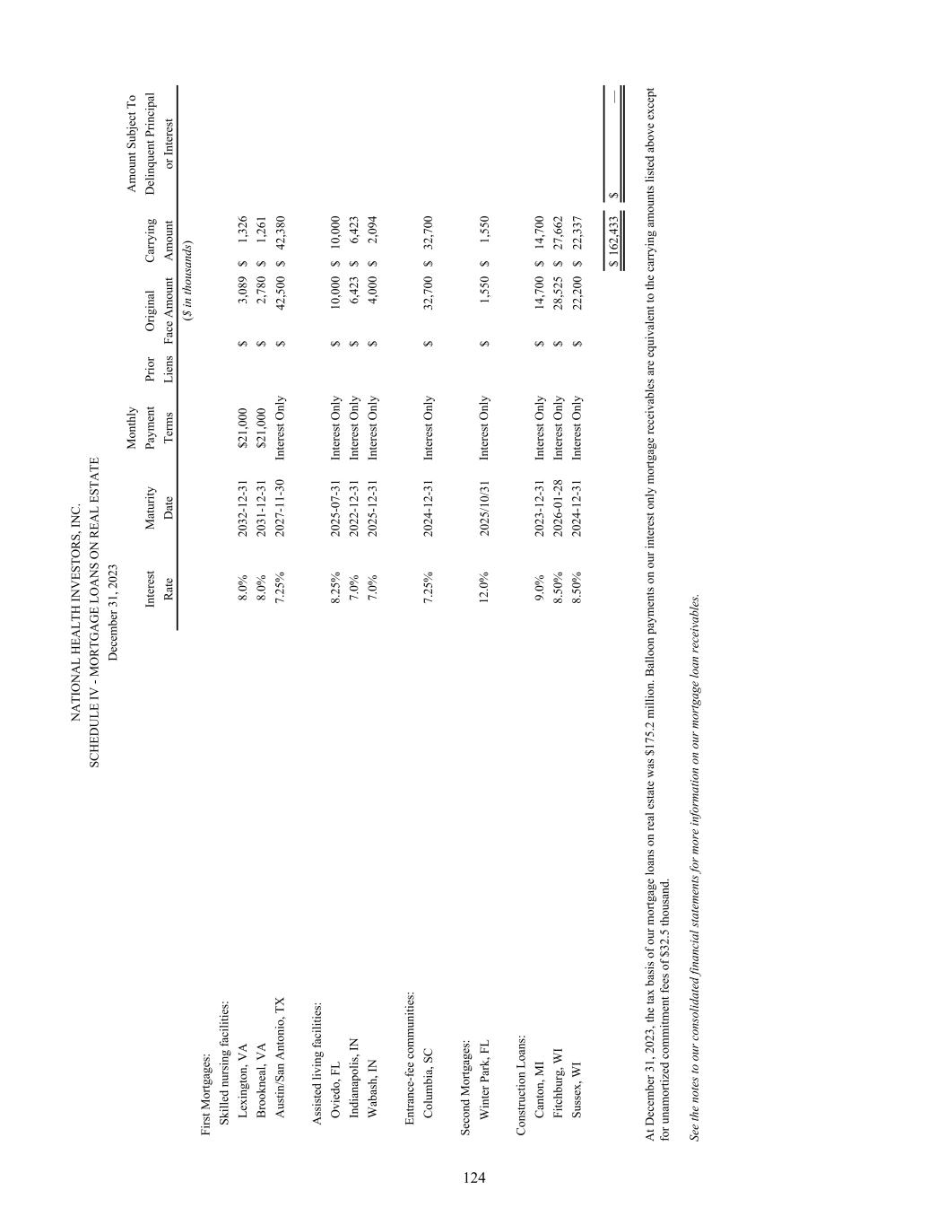 N A TI O N A L H EA LT H IN V ES TO R S, IN C . SC H ED U LE IV - M O R TG A G E LO A N S O N R EA L ES TA TE D ec em be r 3 1, 2 02 3 M on th ly A m ou nt S ub je ct T o In te re st M at ur ity Pa ym en t Pr io r O rig in al C ar ry in g D el in qu en t P rin ci pa l R at e D at e Te rm s Li en s Fa ce A m ou nt A m ou nt or In te re st ($ in th ou sa nd s) Fi rs t M or tg ag es : Sk ill ed n ur si ng fa ci lit ie s: Le xi ng to n, V A 8. 0% 20 32 -1 2- 31 $2 1, 00 0 $ 3, 08 9 $ 1, 32 6 B ro ok ne al , V A 8. 0% 20 31 -1 2- 31 $2 1, 00 0 $ 2, 78 0 $ 1, 26 1 A us tin /S an A nt on io , T X 7. 25 % 20 27 -1 1- 30 In te re st O nl y $ 42 ,5 00 $ 42 ,3 80 A ss is te d liv in g fa ci lit ie s: O vi ed o, F L 8. 25 % 20 25 -0 7- 31 In te re st O nl y $ 10 ,0 00 $ 10 ,0 00 In di an ap ol is , I N 7. 0% 20 22 -1 2- 31 In te re st O nl y $ 6, 42 3 $ 6, 42 3 W ab as h, IN 7. 0% 20 25 -1 2- 31 In te re st O nl y $ 4, 00 0 $ 2, 09 4 En tra nc e- fe e co m m un iti es : C ol um bi a, S C 7. 25 % 20 24 -1 2- 31 In te re st O nl y $ 32 ,7 00 $ 32 ,7 00 Se co nd M or tg ag es : W in te r P ar k, F L 12 .0 % 20 25 /1 0/ 31 In te re st O nl y $ 1, 55 0 $ 1, 55 0 C on st ru ct io n Lo an s: C an to n, M I 9. 0% 20 23 -1 2- 31 In te re st O nl y $ 14 ,7 00 $ 14 ,7 00 Fi tc hb ur g, W I 8. 50 % 20 26 -0 1- 28 In te re st O nl y $ 28 ,5 25 $ 27 ,6 62 Su ss ex , W I 8. 50 % 20 24 -1 2- 31 In te re st O nl y $ 22 ,2 00 $ 22 ,3 37 $ 16 2, 43 3 $ — A t D ec em be r 3 1, 2 02 3, th e ta x ba si s o f o ur m or tg ag e lo an s o n re al e st at e w as $ 17 5. 2 m ill io n. B al lo on p ay m en ts o n ou r i nt er es t o nl y m or tg ag e re ce iv ab le s a re e qu iv al en t t o th e ca rr yi ng a m ou nt s l is te d ab ov e ex ce pt fo r u na m or tiz ed c om m itm en t f ee s o f $ 32 .5 th ou sa nd . Se e th e no te s t o ou r c on so lid at ed fi na nc ia l s ta te m en ts fo r m or e in fo rm at io n on o ur m or tg ag e lo an re ce iv ab le s. 124