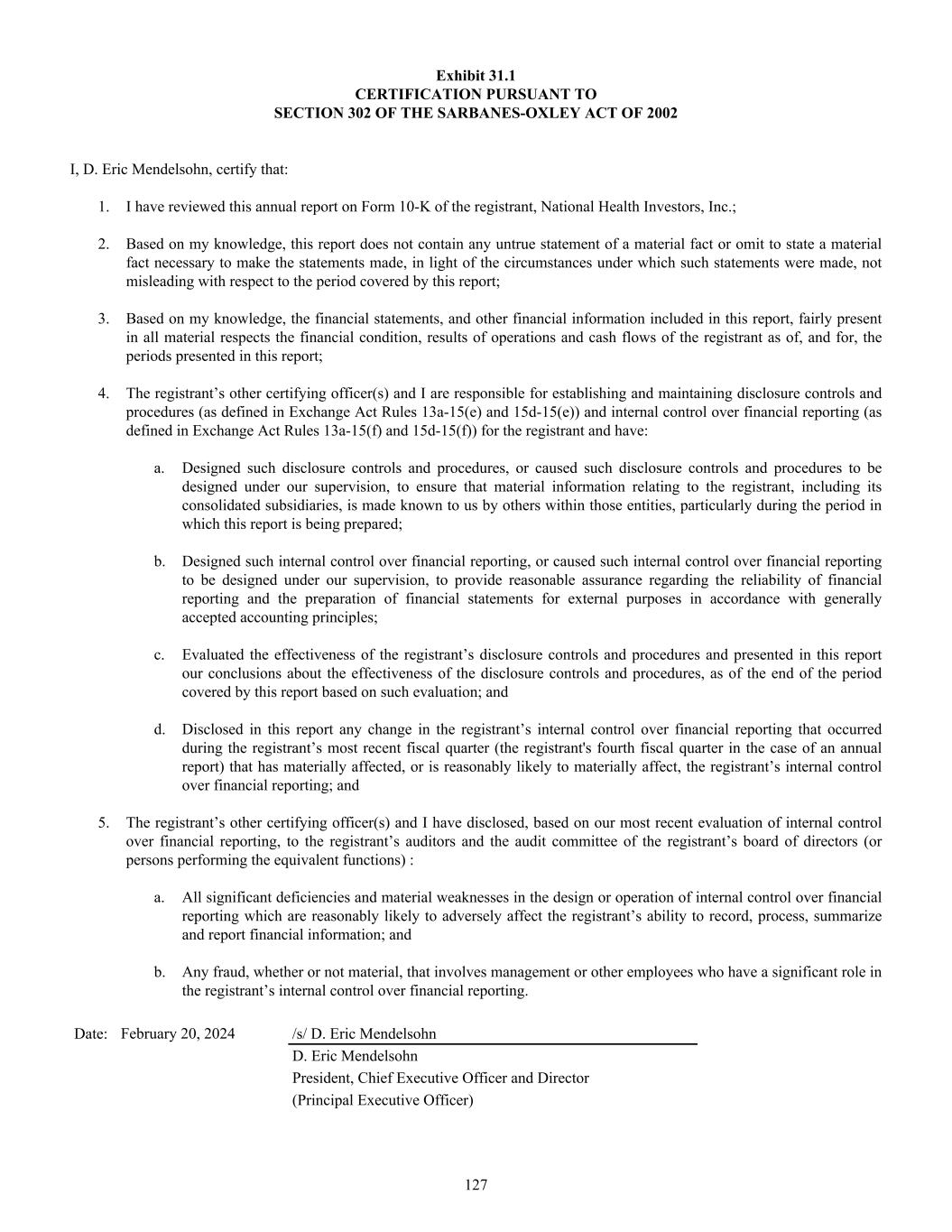 Exhibit 31.1 CERTIFICATION PURSUANT TO SECTION 302 OF THE SARBANES-OXLEY ACT OF 2002 I, D. Eric Mendelsohn, certify that: 1. I have reviewed this annual report on Form 10-K of the registrant, National Health Investors, Inc.; 2. Based on my knowledge, this report does not contain any untrue statement of a material fact or omit to state a material fact necessary to make the statements made, in light of the circumstances under which such statements were made, not misleading with respect to the period covered by this report; 3. Based on my knowledge, the financial statements, and other financial information included in this report, fairly present in all material respects the financial condition, results of operations and cash flows of the registrant as of, and for, the periods presented in this report; 4. The registrant’s other certifying officer(s) and I are responsible for establishing and maintaining disclosure controls and procedures (as defined in Exchange Act Rules 13a-15(e) and 15d-15(e)) and internal control over financial reporting (as defined in Exchange Act Rules 13a-15(f) and 15d-15(f)) for the registrant and have: a. Designed such disclosure controls and procedures, or caused such disclosure controls and procedures to be designed under our supervision, to ensure that material information relating to the registrant, including its consolidated subsidiaries, is made known to us by others within those entities, particularly during the period in which this report is being prepared; b. Designed such internal control over financial reporting, or caused such internal control over financial reporting to be designed under our supervision, to provide reasonable assurance regarding the reliability of financial reporting and the preparation of financial statements for external purposes in accordance with generally accepted accounting principles; c. Evaluated the effectiveness of the registrant’s disclosure controls and procedures and presented in this report our conclusions about the effectiveness of the disclosure controls and procedures, as of the end of the period covered by this report based on such evaluation; and d. Disclosed in this report any change in the registrant’s internal control over financial reporting that occurred during the registrant’s most recent fiscal quarter (the registrant's fourth fiscal quarter in the case of an annual report) that has materially affected, or is reasonably likely to materially affect, the registrant’s internal control over financial reporting; and 5. The registrant’s other certifying officer(s) and I have disclosed, based on our most recent evaluation of internal control over financial reporting, to the registrant’s auditors and the audit committee of the registrant’s board of directors (or persons performing the equivalent functions) : a. All significant deficiencies and material weaknesses in the design or operation of internal control over financial reporting which are reasonably likely to adversely affect the registrant’s ability to record, process, summarize and report financial information; and b. Any fraud, whether or not material, that involves management or other employees who have a significant role in the registrant’s internal control over financial reporting. Date: February 20, 2024 /s/ D. Eric Mendelsohn D. Eric Mendelsohn President, Chief Executive Officer and Director (Principal Executive Officer) 127