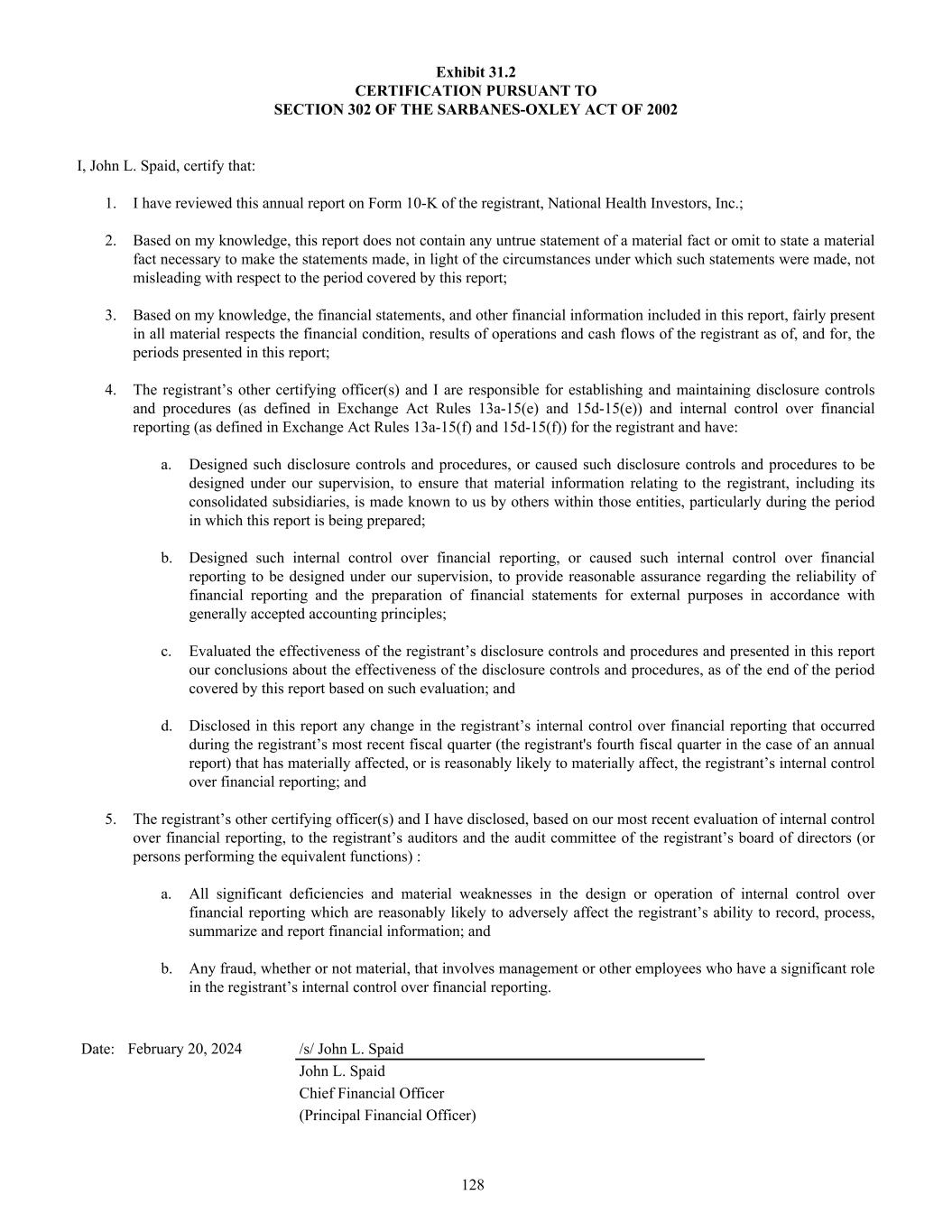 Exhibit 31.2 CERTIFICATION PURSUANT TO SECTION 302 OF THE SARBANES-OXLEY ACT OF 2002 I, John L. Spaid, certify that: 1. I have reviewed this annual report on Form 10-K of the registrant, National Health Investors, Inc.; 2. Based on my knowledge, this report does not contain any untrue statement of a material fact or omit to state a material fact necessary to make the statements made, in light of the circumstances under which such statements were made, not misleading with respect to the period covered by this report; 3. Based on my knowledge, the financial statements, and other financial information included in this report, fairly present in all material respects the financial condition, results of operations and cash flows of the registrant as of, and for, the periods presented in this report; 4. The registrant’s other certifying officer(s) and I are responsible for establishing and maintaining disclosure controls and procedures (as defined in Exchange Act Rules 13a-15(e) and 15d-15(e)) and internal control over financial reporting (as defined in Exchange Act Rules 13a-15(f) and 15d-15(f)) for the registrant and have: a. Designed such disclosure controls and procedures, or caused such disclosure controls and procedures to be designed under our supervision, to ensure that material information relating to the registrant, including its consolidated subsidiaries, is made known to us by others within those entities, particularly during the period in which this report is being prepared; b. Designed such internal control over financial reporting, or caused such internal control over financial reporting to be designed under our supervision, to provide reasonable assurance regarding the reliability of financial reporting and the preparation of financial statements for external purposes in accordance with generally accepted accounting principles; c. Evaluated the effectiveness of the registrant’s disclosure controls and procedures and presented in this report our conclusions about the effectiveness of the disclosure controls and procedures, as of the end of the period covered by this report based on such evaluation; and d. Disclosed in this report any change in the registrant’s internal control over financial reporting that occurred during the registrant’s most recent fiscal quarter (the registrant's fourth fiscal quarter in the case of an annual report) that has materially affected, or is reasonably likely to materially affect, the registrant’s internal control over financial reporting; and 5. The registrant’s other certifying officer(s) and I have disclosed, based on our most recent evaluation of internal control over financial reporting, to the registrant’s auditors and the audit committee of the registrant’s board of directors (or persons performing the equivalent functions) : a. All significant deficiencies and material weaknesses in the design or operation of internal control over financial reporting which are reasonably likely to adversely affect the registrant’s ability to record, process, summarize and report financial information; and b. Any fraud, whether or not material, that involves management or other employees who have a significant role in the registrant’s internal control over financial reporting. Date: February 20, 2024 /s/ John L. Spaid John L. Spaid Chief Financial Officer (Principal Financial Officer) 128