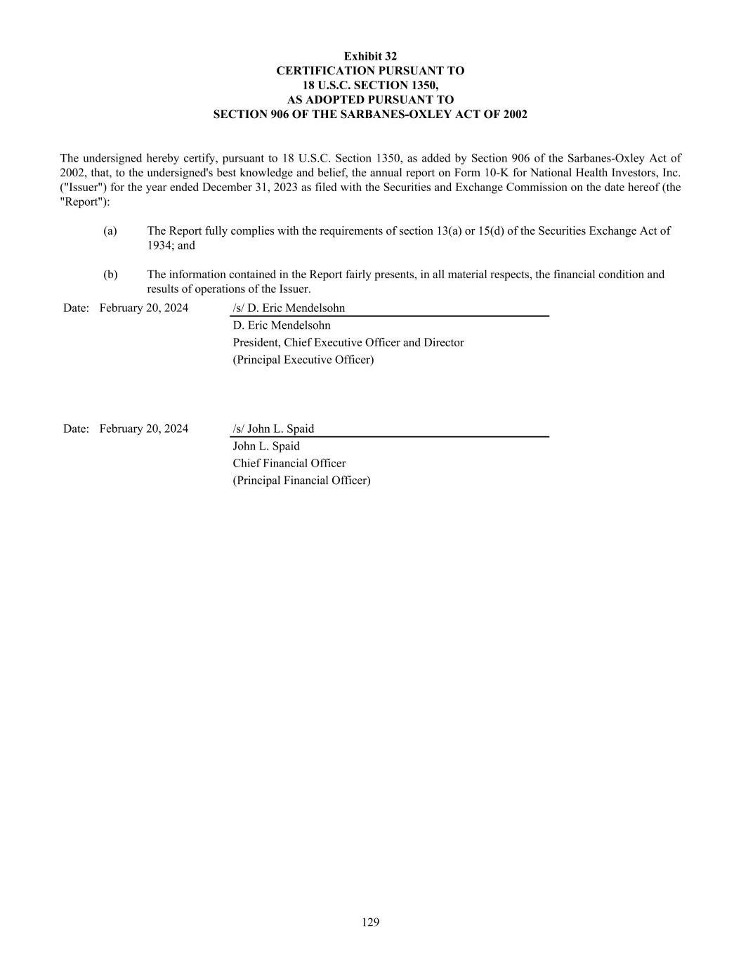 Exhibit 32 CERTIFICATION PURSUANT TO 18 U.S.C. SECTION 1350, AS ADOPTED PURSUANT TO SECTION 906 OF THE SARBANES-OXLEY ACT OF 2002 The undersigned hereby certify, pursuant to 18 U.S.C. Section 1350, as added by Section 906 of the Sarbanes-Oxley Act of 2002, that, to the undersigned's best knowledge and belief, the annual report on Form 10-K for National Health Investors, Inc. ("Issuer") for the year ended December 31, 2023 as filed with the Securities and Exchange Commission on the date hereof (the "Report"): (a) The Report fully complies with the requirements of section 13(a) or 15(d) of the Securities Exchange Act of 1934; and (b) The information contained in the Report fairly presents, in all material respects, the financial condition and results of operations of the Issuer. Date: February 20, 2024 /s/ D. Eric Mendelsohn D. Eric Mendelsohn President, Chief Executive Officer and Director (Principal Executive Officer) Date: February 20, 2024 /s/ John L. Spaid John L. Spaid Chief Financial Officer (Principal Financial Officer) 129