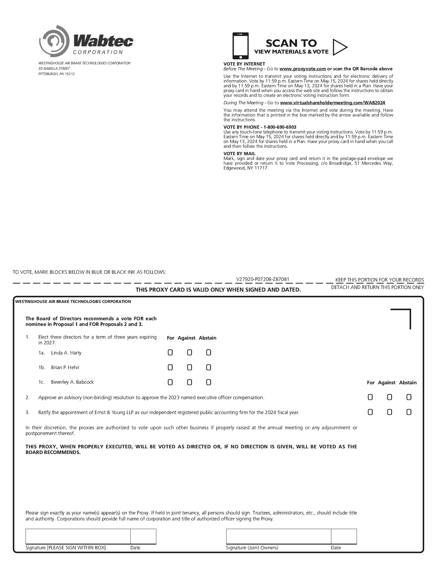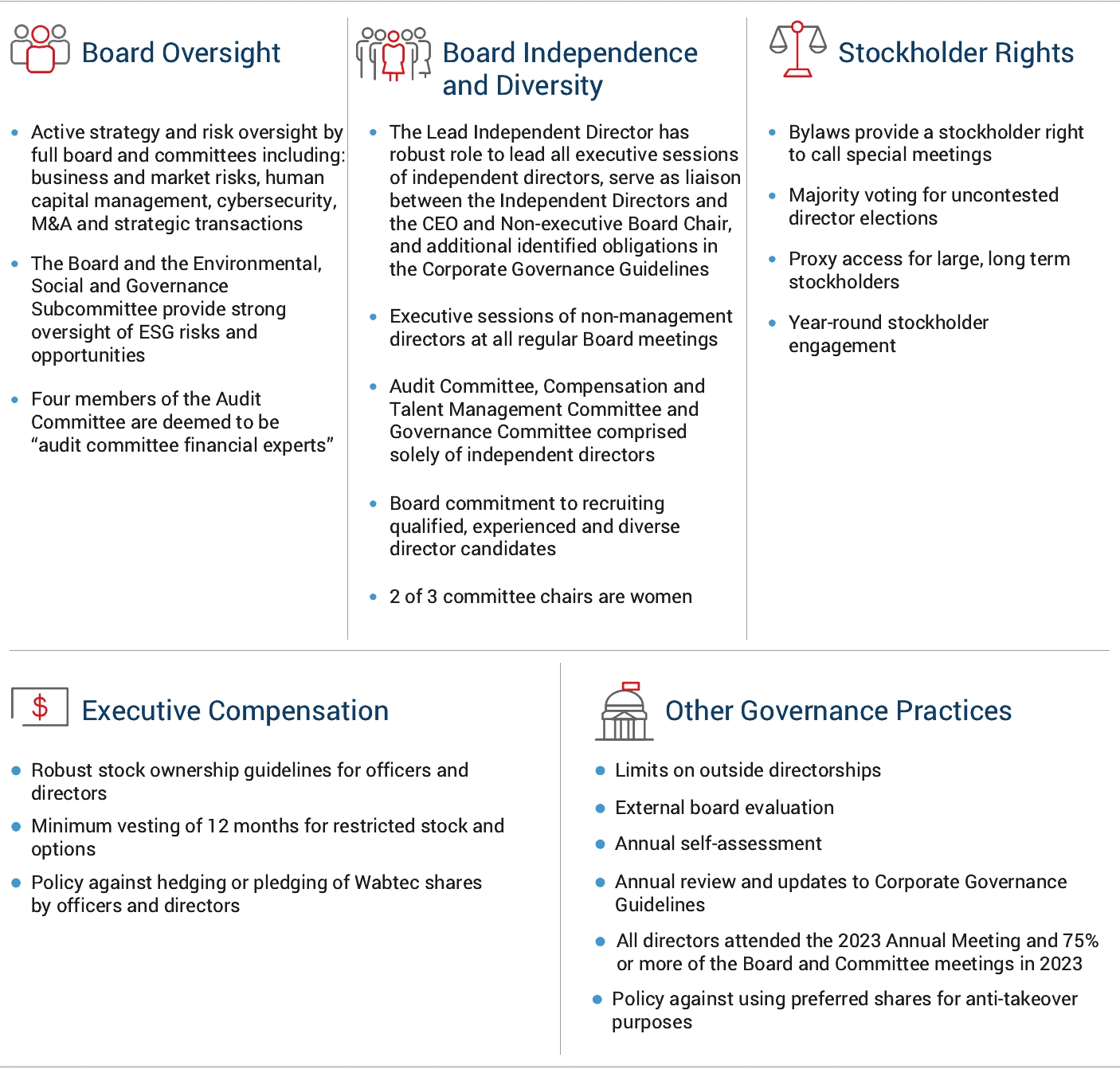 An eligible stockholder, or eligible group of stockholders, that wants to nominate a candidate for election to the Board pursuant to the proxy access provisions of our amended and restated by-laws must follow the procedures stated in Article II, Section 10 of our amended and restated by-laws. These procedures include the requirement that your nomination must be delivered to Wabtec’s Secretary not later than the close of business on the 120th day or earlier than the close of business on the 150th day prior to the first anniversary of the preceding year’s annual meeting. If the date of the annual meeting is more than 30 days before or more than 60 days after such anniversary date, your notice must be delivered not later than the 120th day prior to such annual meeting or, if later, the 10th day following the day we publicly announce the date of the 2025 annual meeting of stockholders.